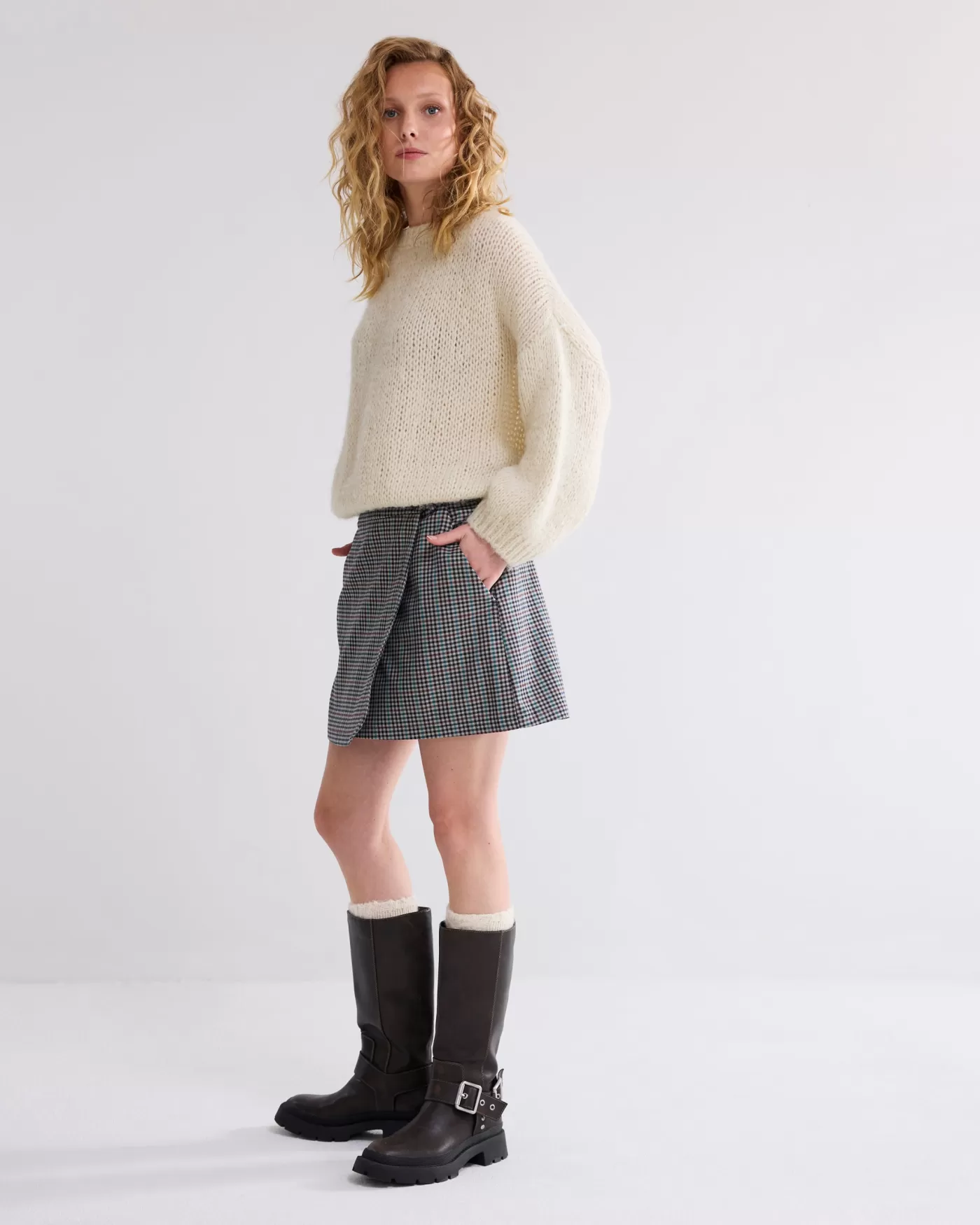 Korte omslagrok met een multicolour ruitjesprint. De rok heeft een knoopsluiting in de taille en steekzakken. Ruitjespri…