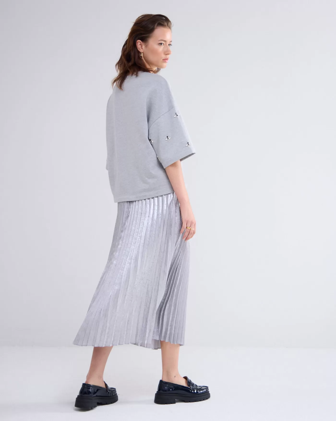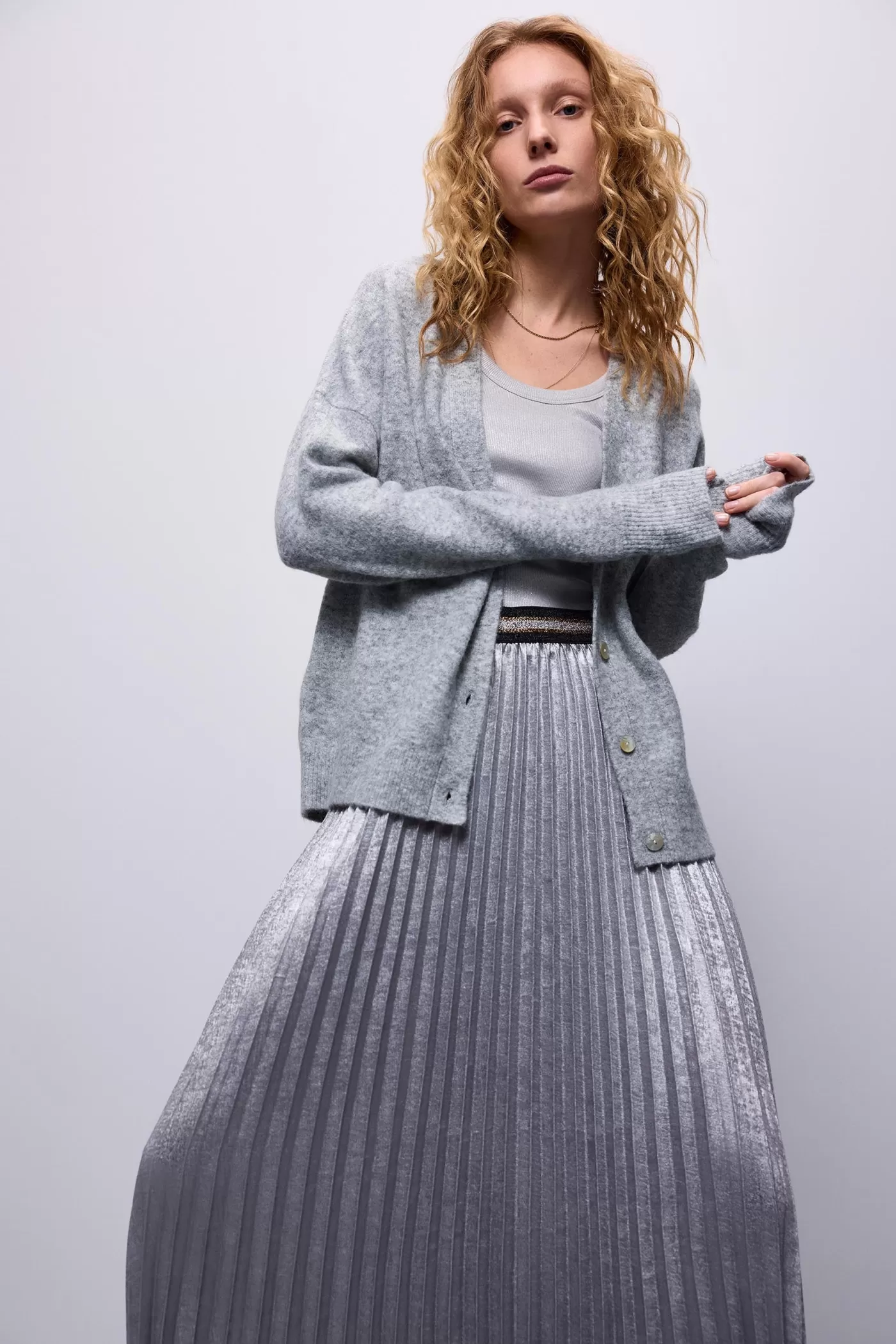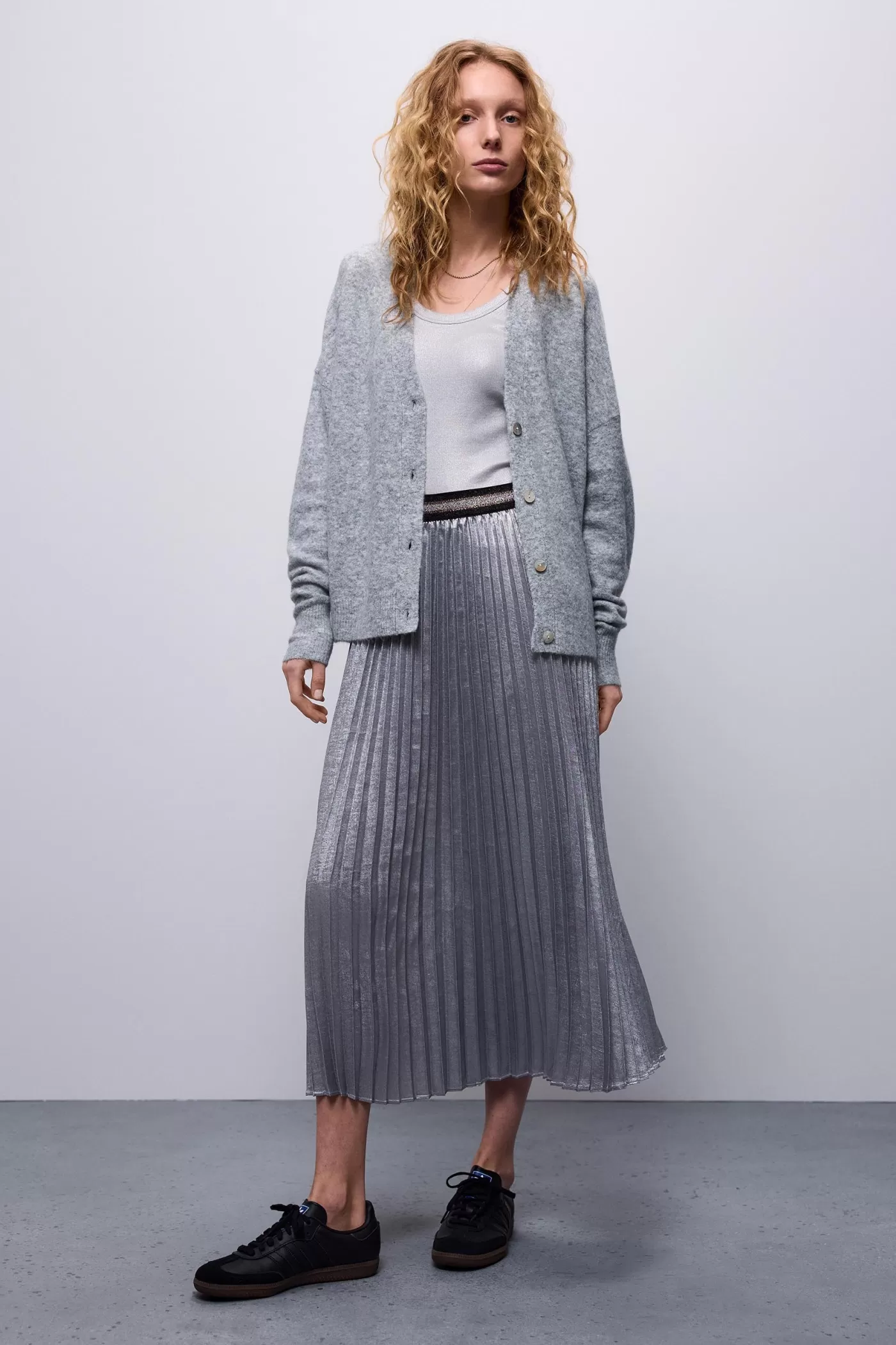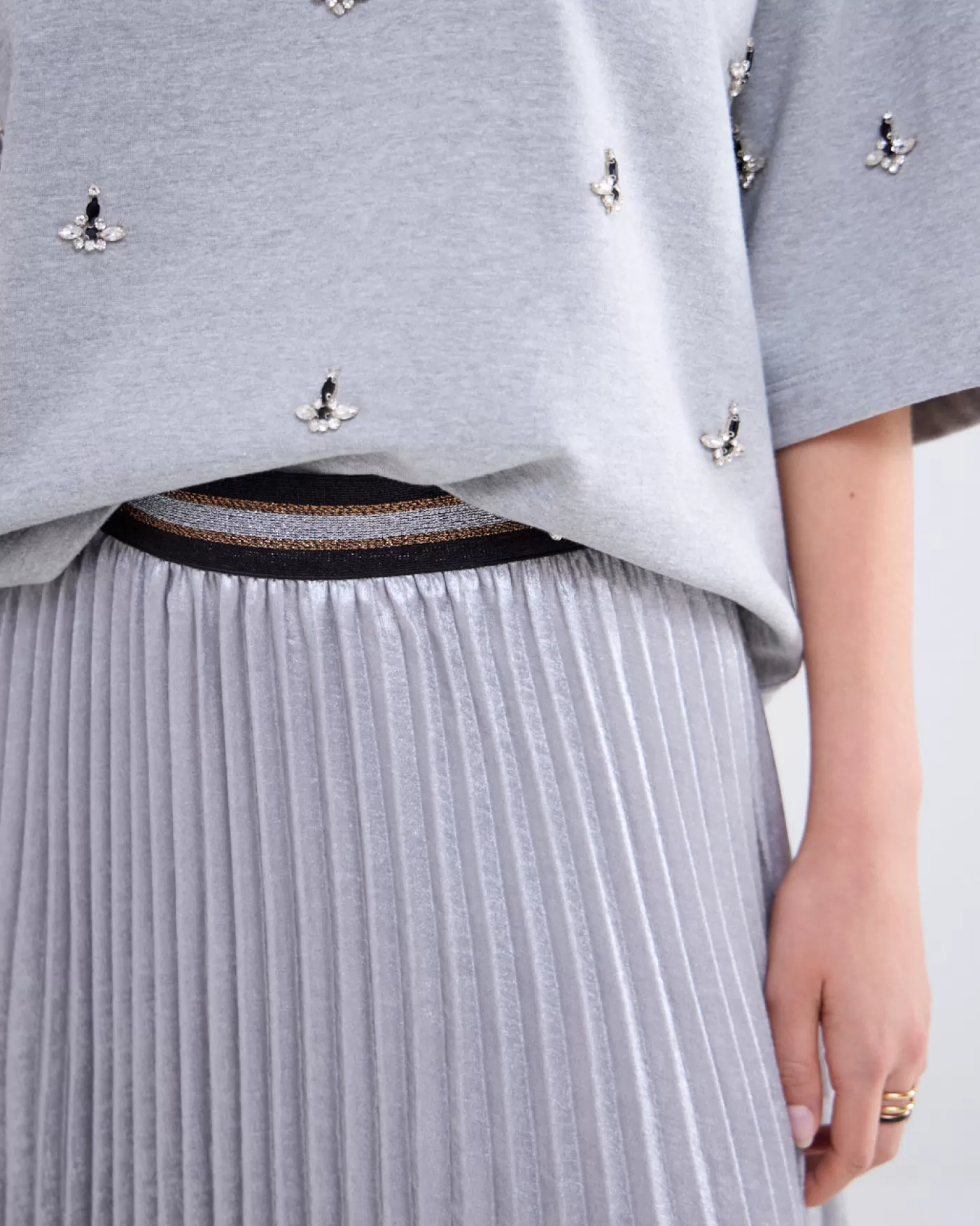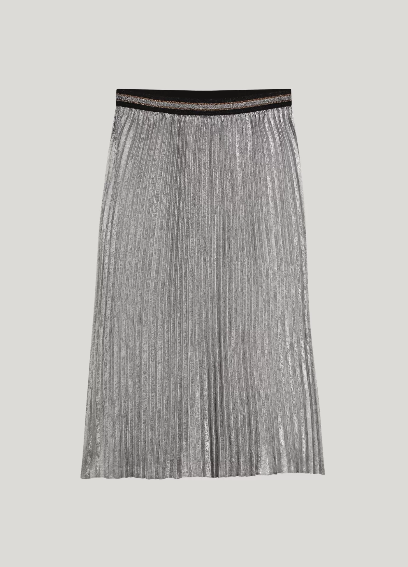 Plissé rok tot over de knie met een gestreepte elastische tailleband. Gemaakt van geweven stof bedrukt in zilver metallic kleur. plissé rok gestreepte elastische tailleband zilver metallic knie lengte