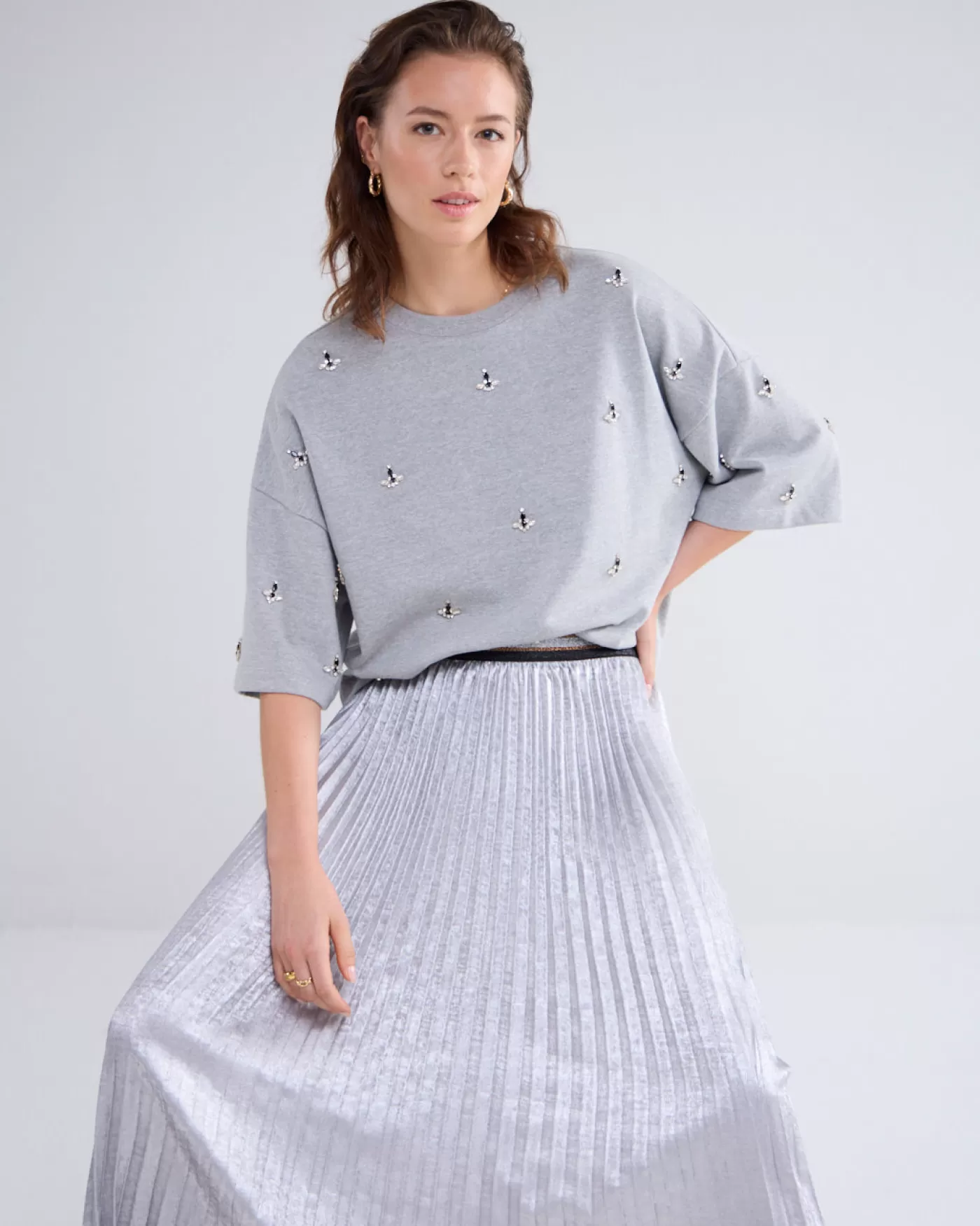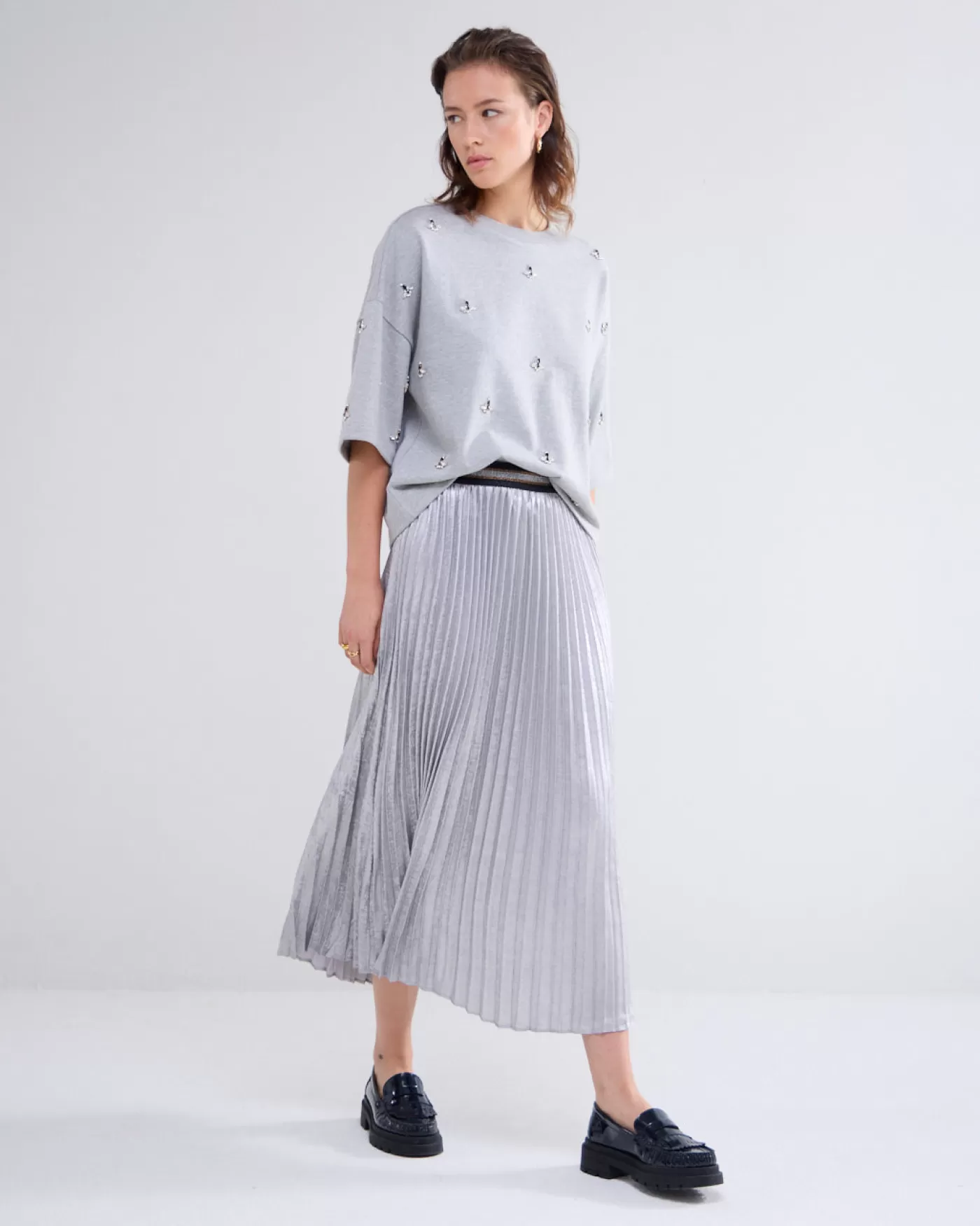 Plissé rok tot over de knie met een gestreepte elastische tailleband. Gemaakt van geweven stof bedrukt in zilver metall…