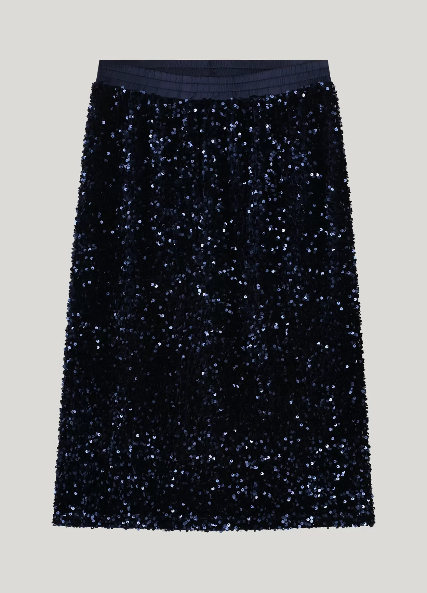 Rok met normale pasvorm en lengte tot onder de knie, voorzien van een elastische tailleband. De rok is gemaakt van pailletten veloursstof en volledig gevoerd. normale pasvorm elastische tailleband pailletten velours gevoerd