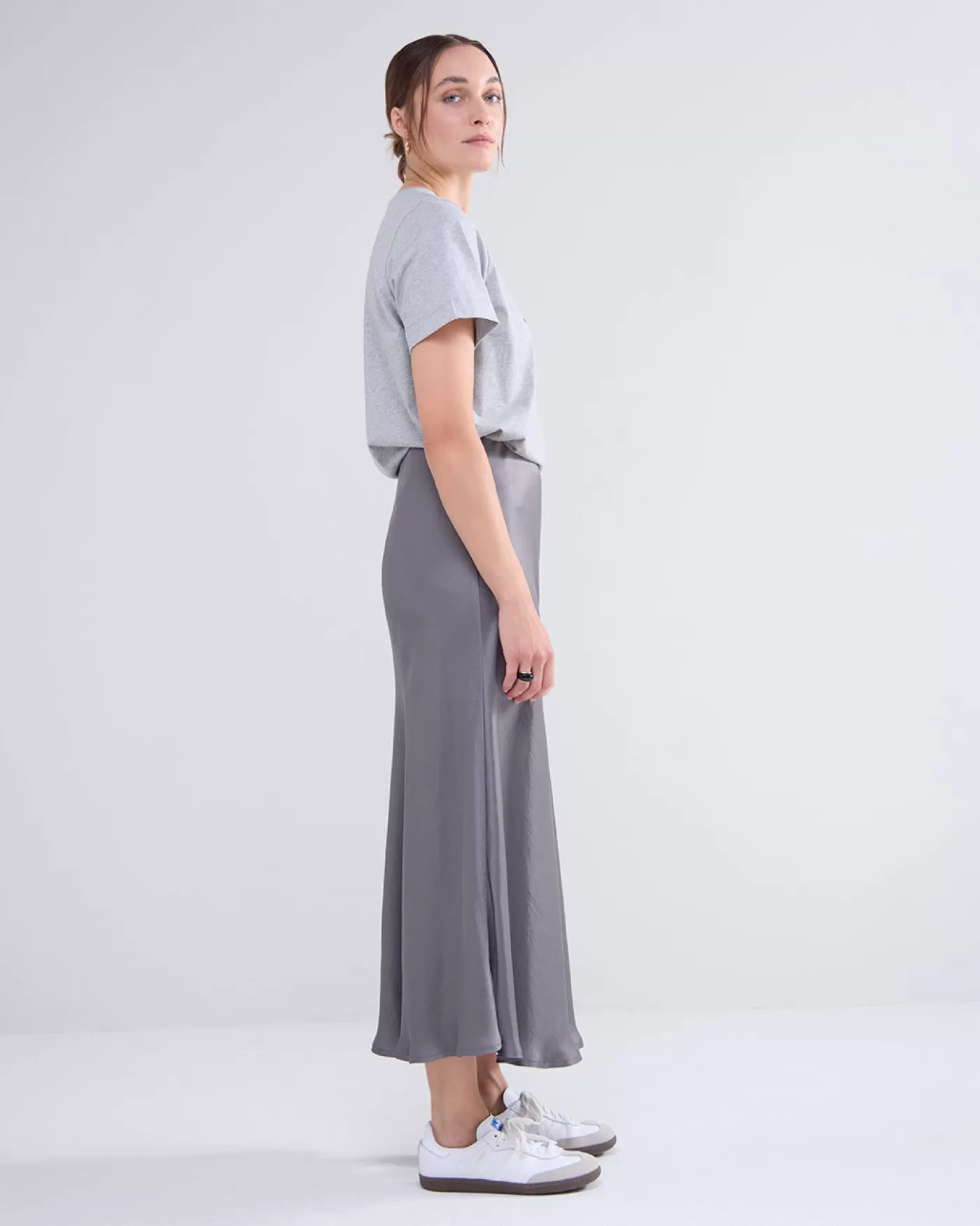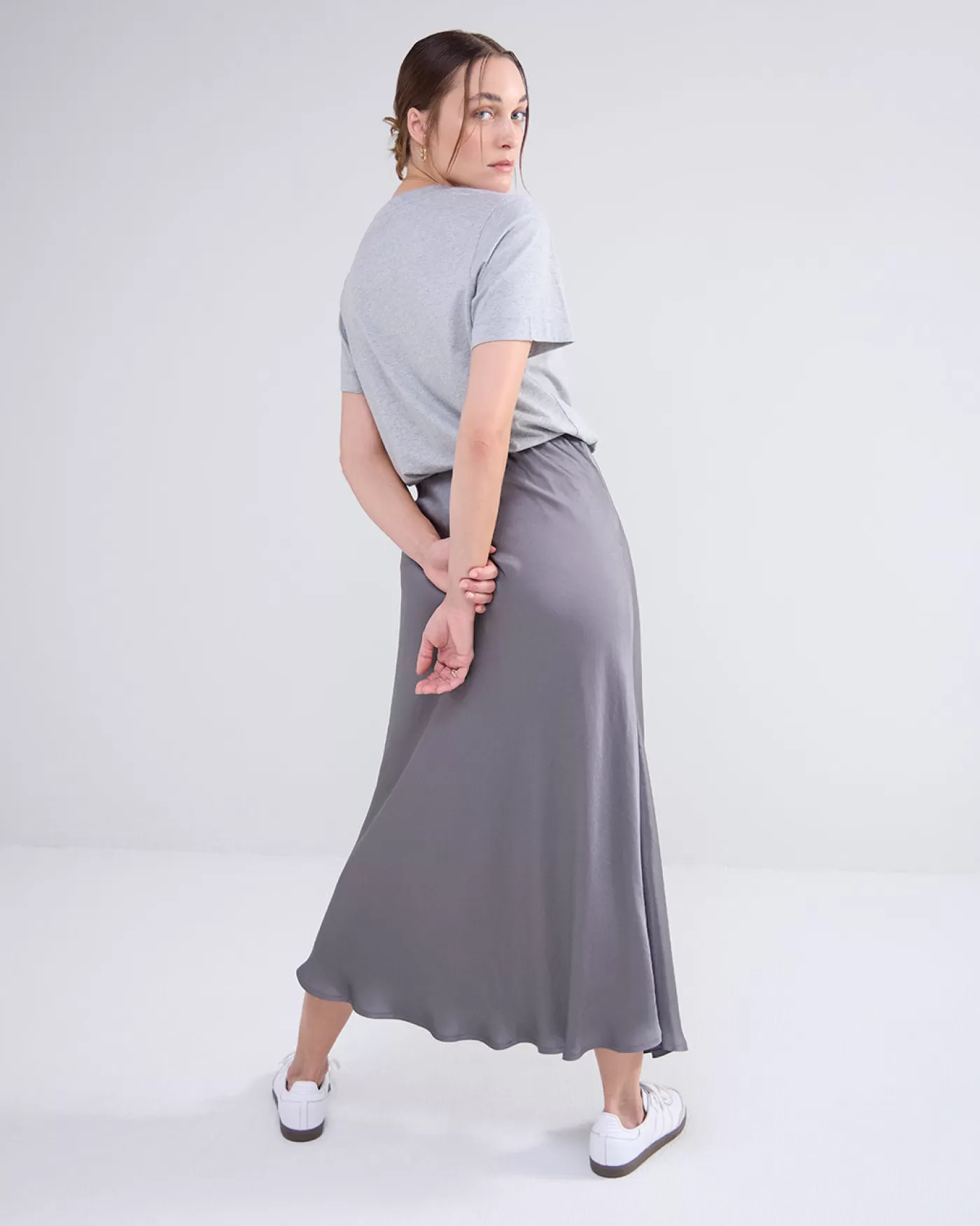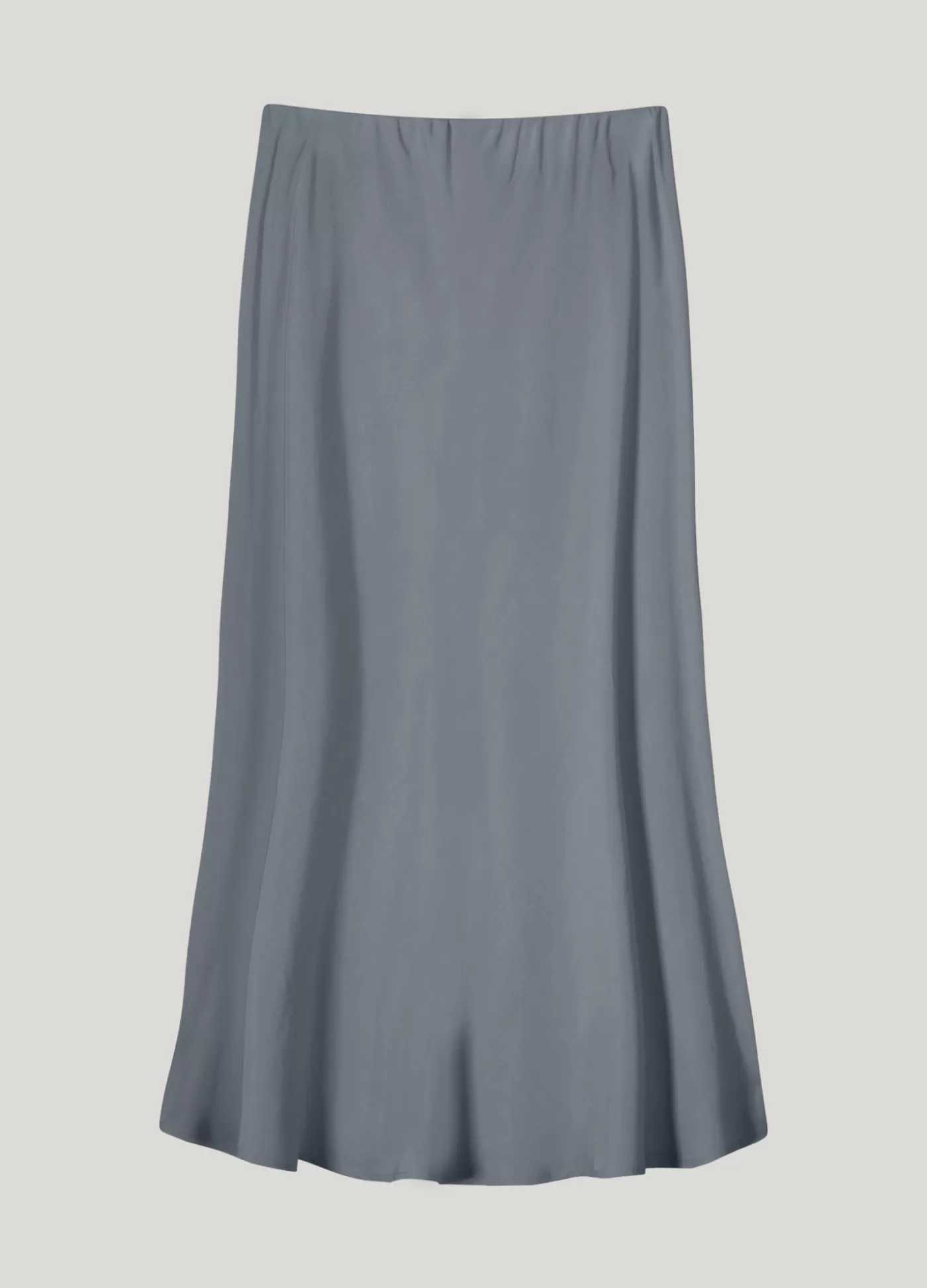 Schuingesneden lange rok tot ongeveer de kuit, voorzien van elastiek aan de binnenkant van de taille. Gemaakt van een soepele, glanzende kwaliteit. schuine snit elastische taille kuitlengte glanzende kwaliteit