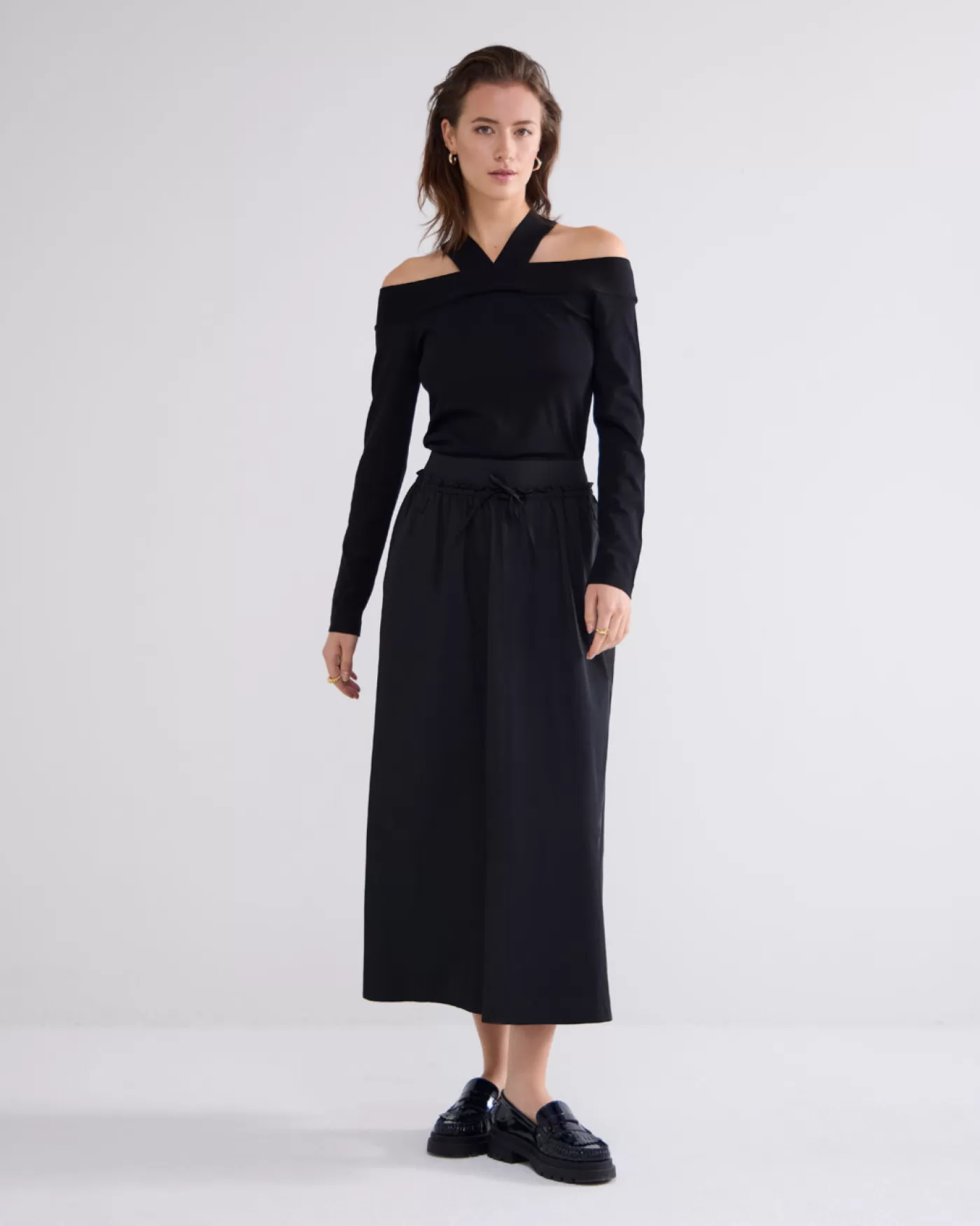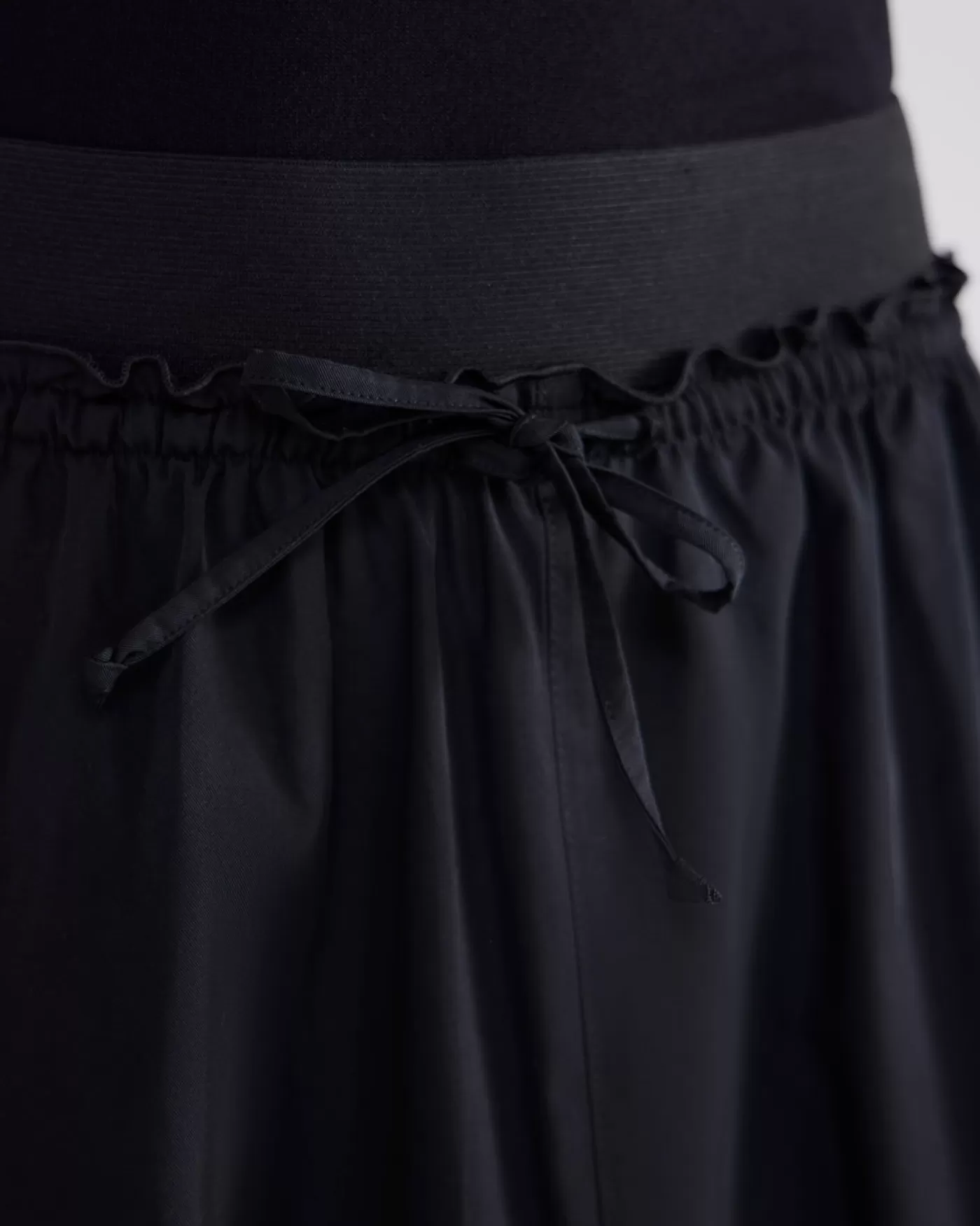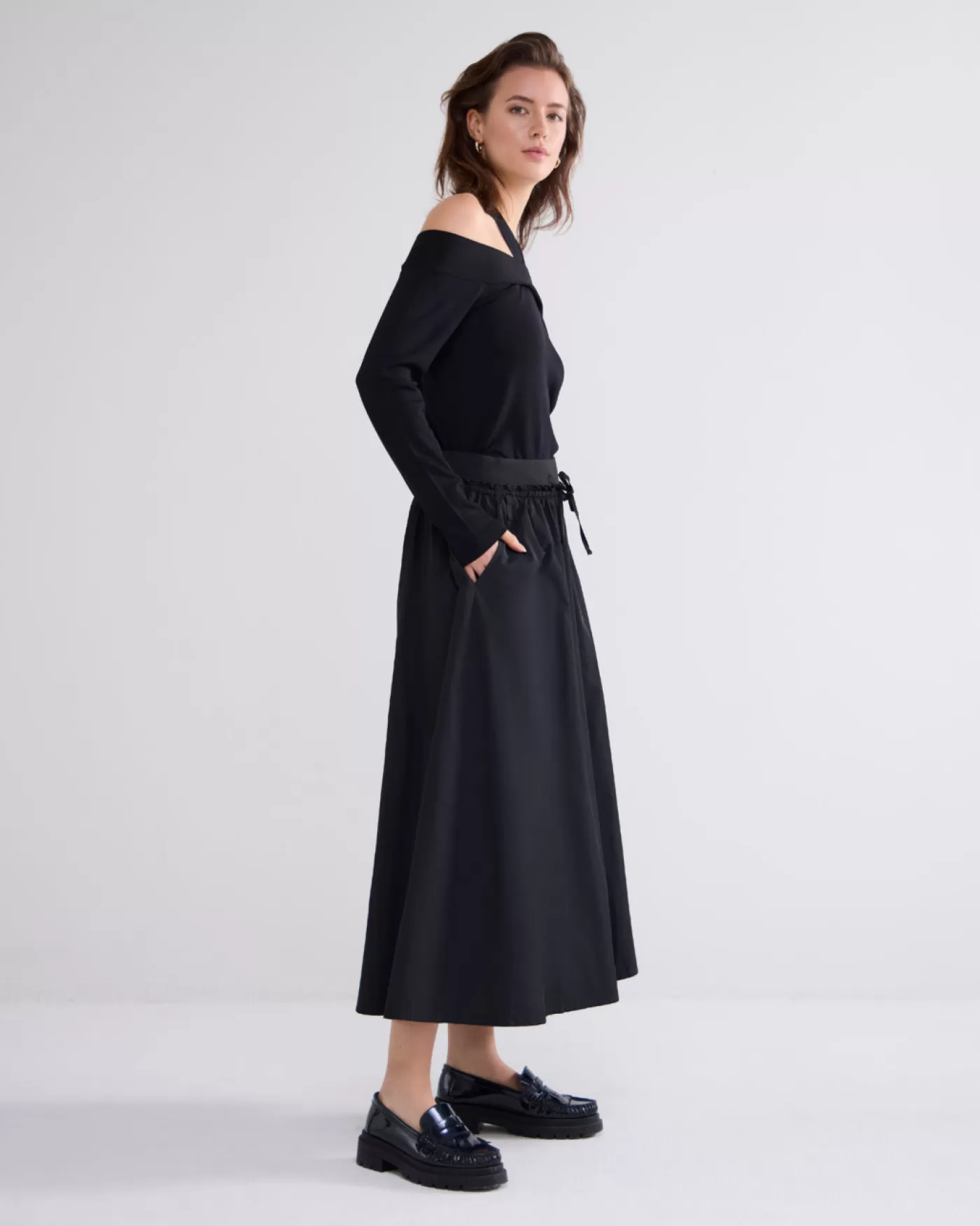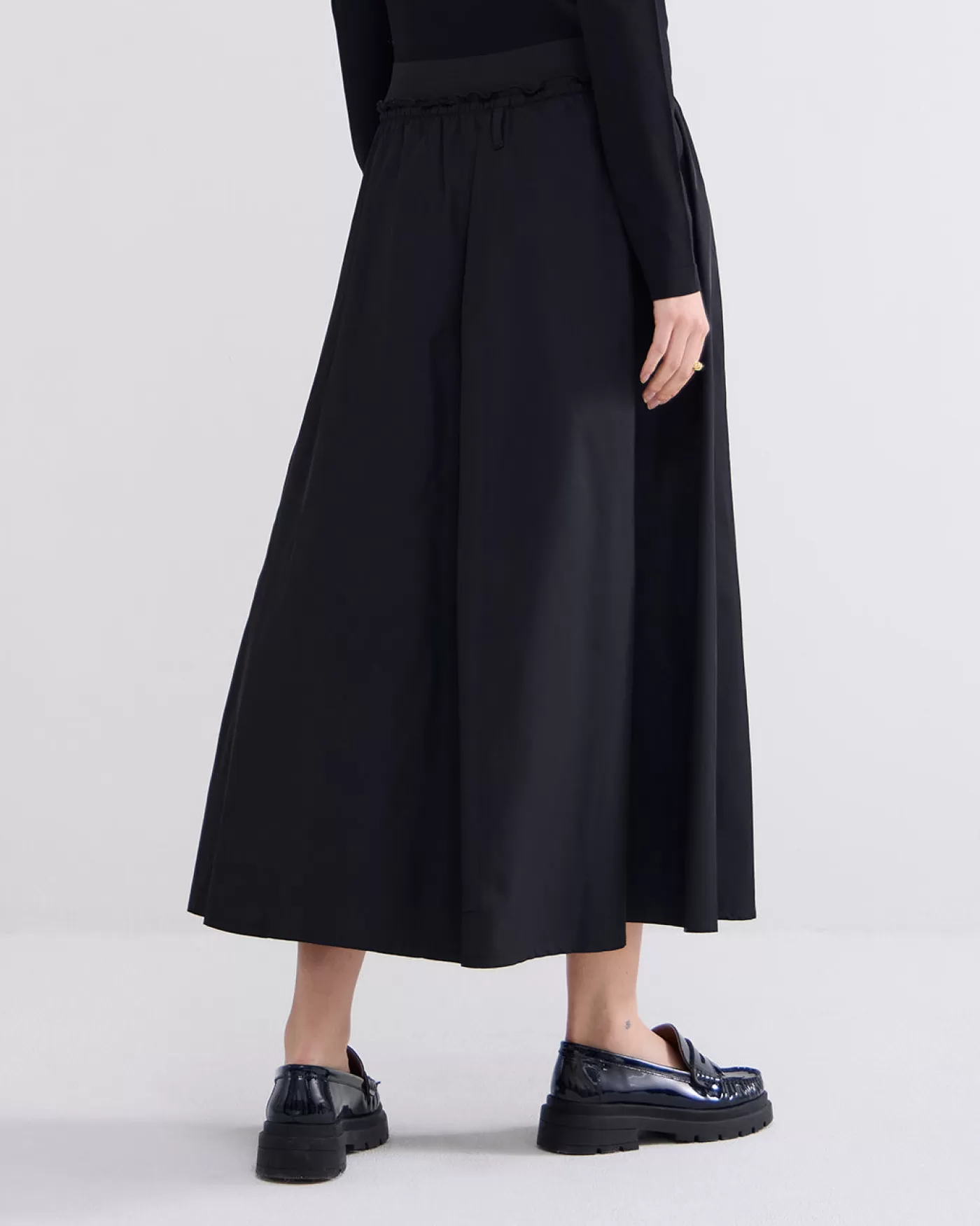 Iets uitlopende rok gemaakt van taft. De rok heeft steekzakken en een elastische tailleband met koordje. iets uitlopende taft rok steekzakken elastische tailleband koordsluiting