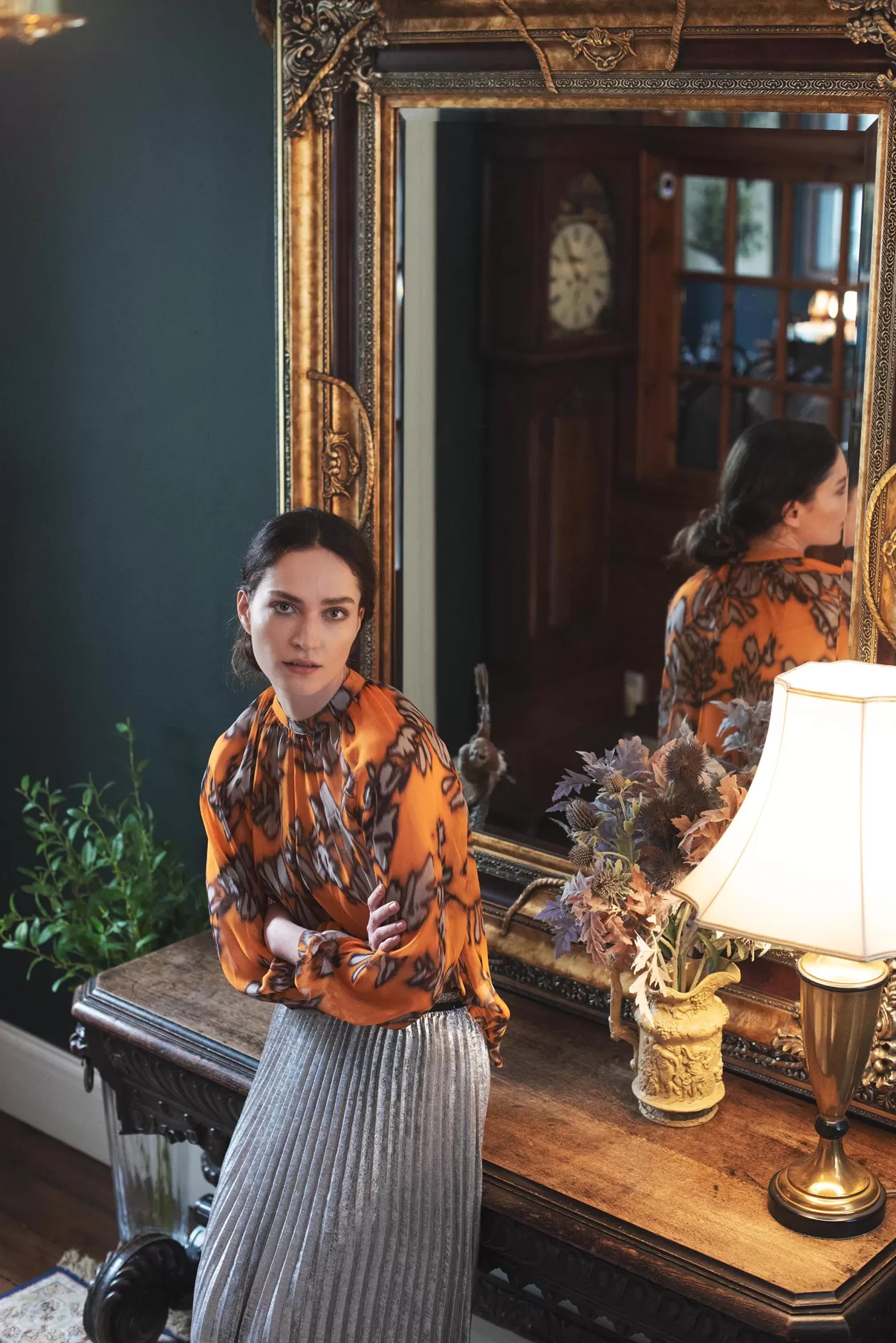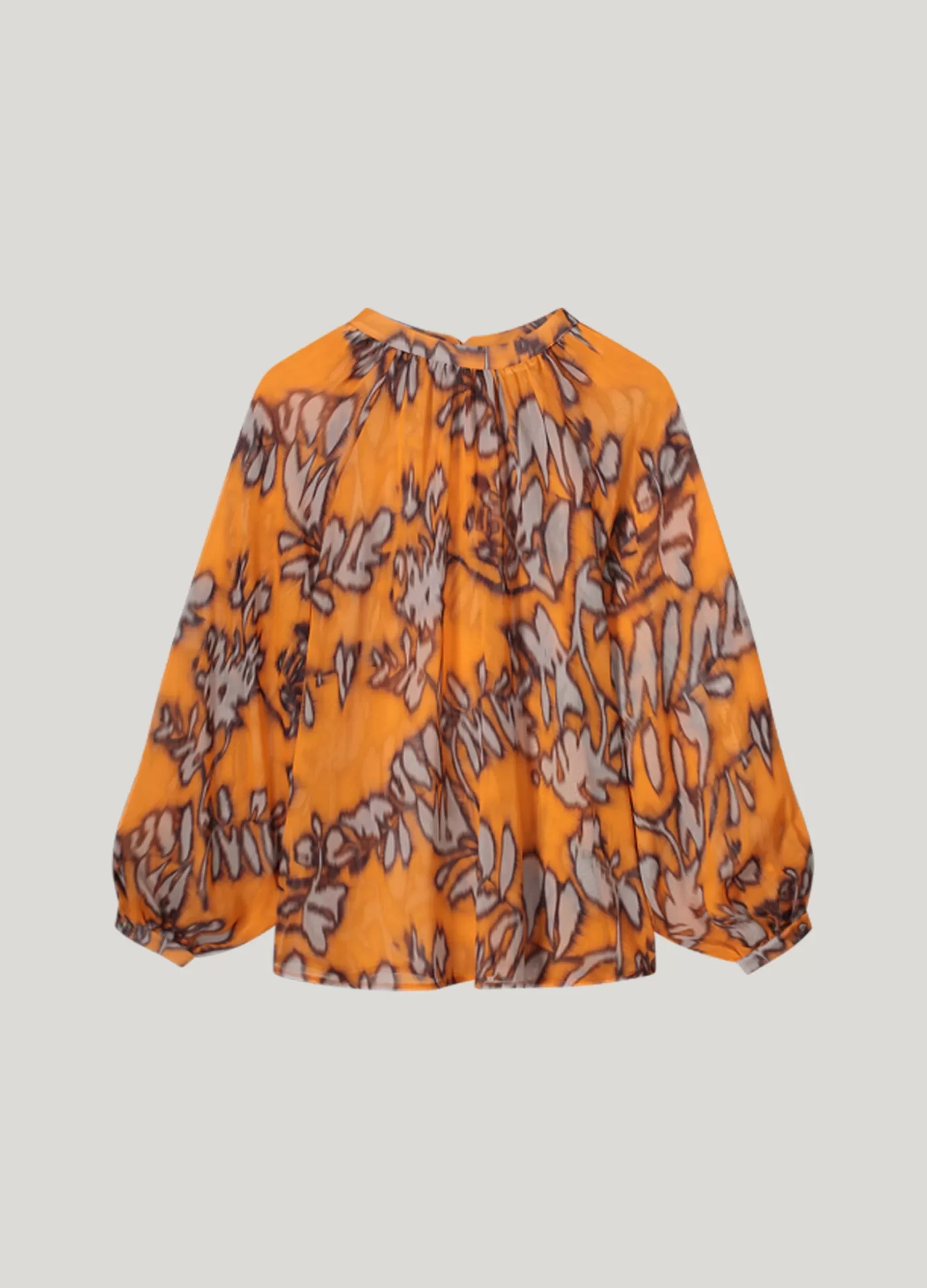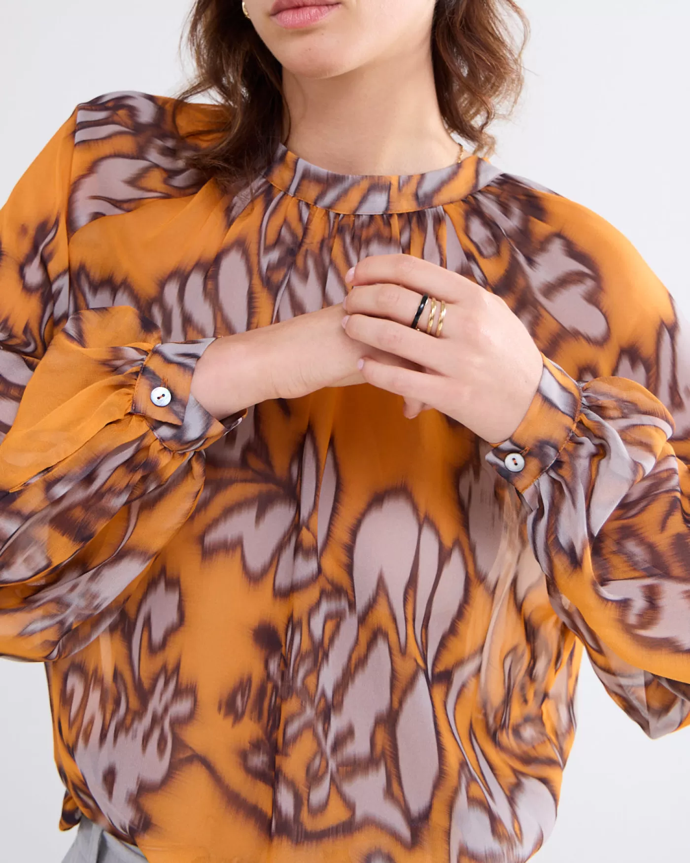 Top die op twee manieren gedragen kan worden: met een hoge iets geplooide hals of met een split en knoopje. Gemaakt van transparante bedrukte stof met raglanmouwen. hoge gerimpelde hals split en knoopje raglanmouwen transparante viscose