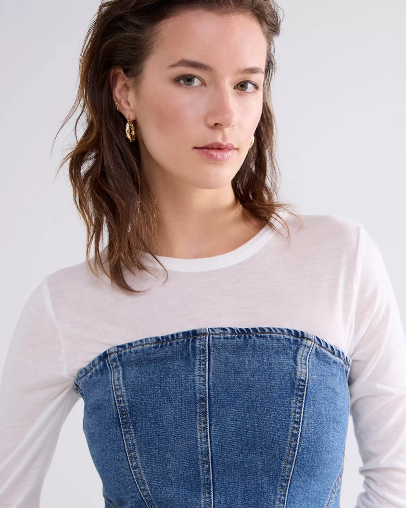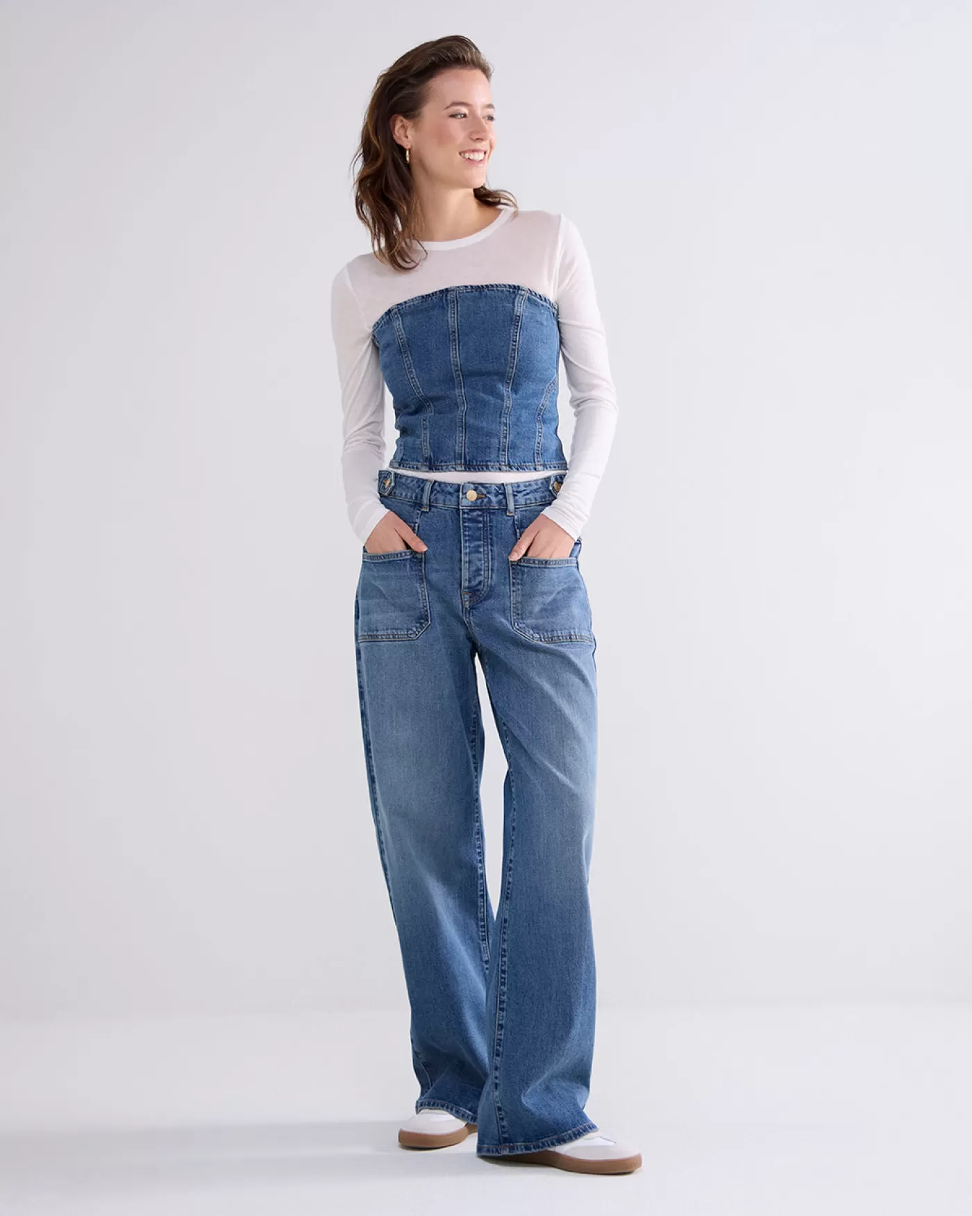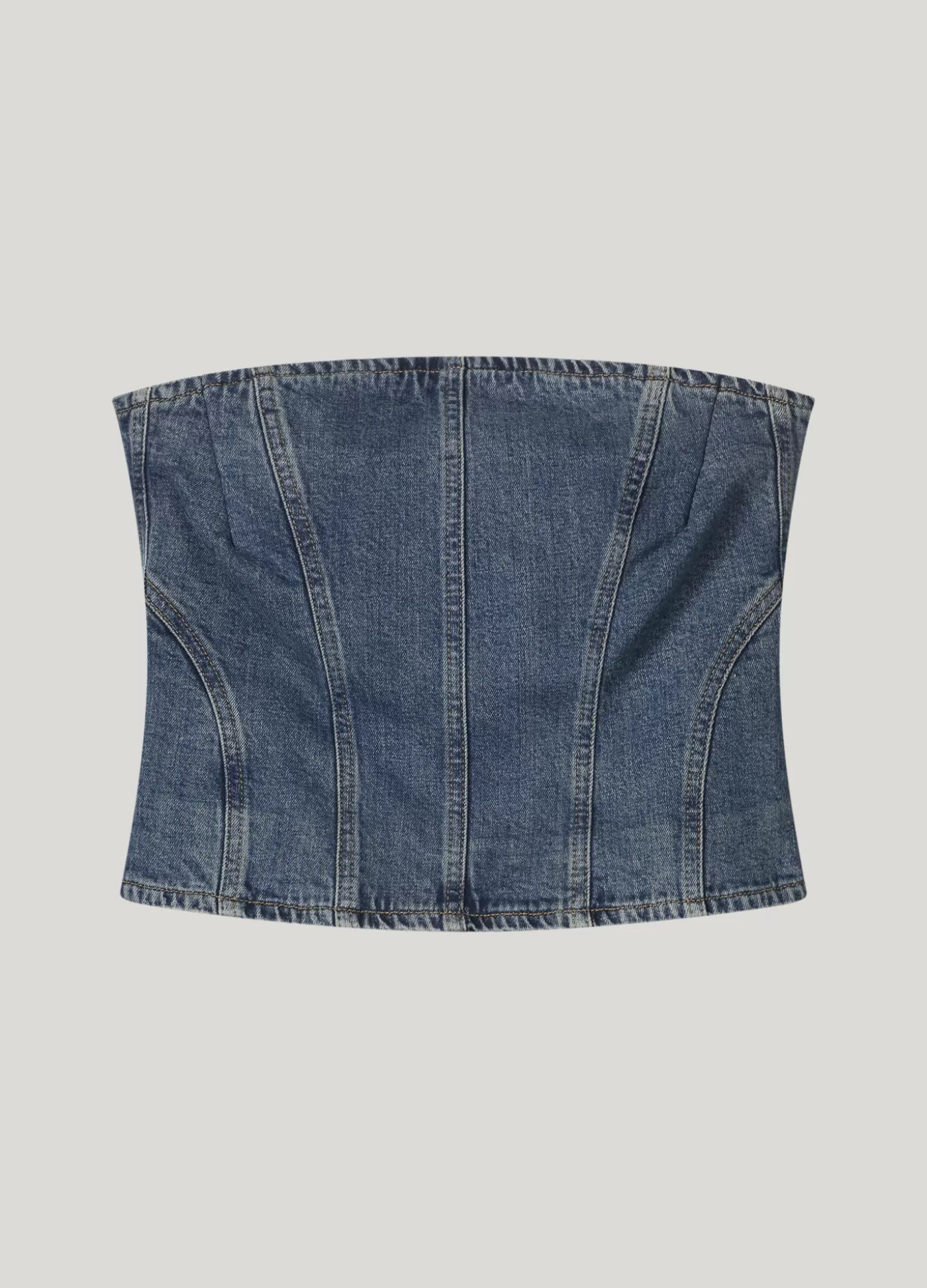 Denim corset van stretchdenim met een katoenen voering. Het corset heeft coupenaadjes aan de voorkant en een ritssluiting aan de achterkant. katoenen voering stretchdenim ritsluiting coupenaadjes