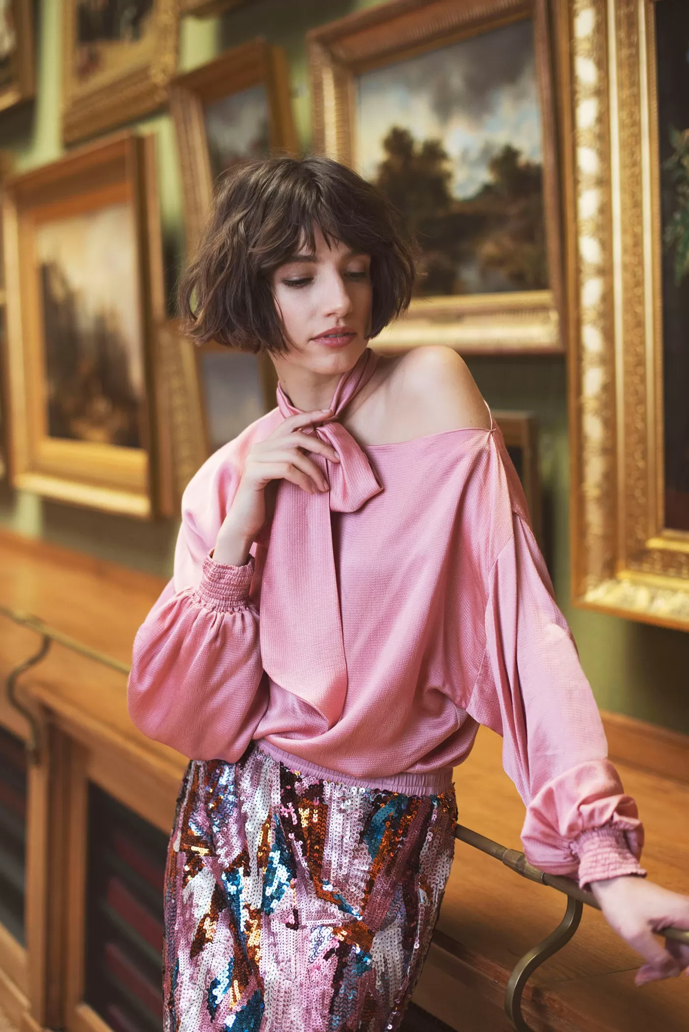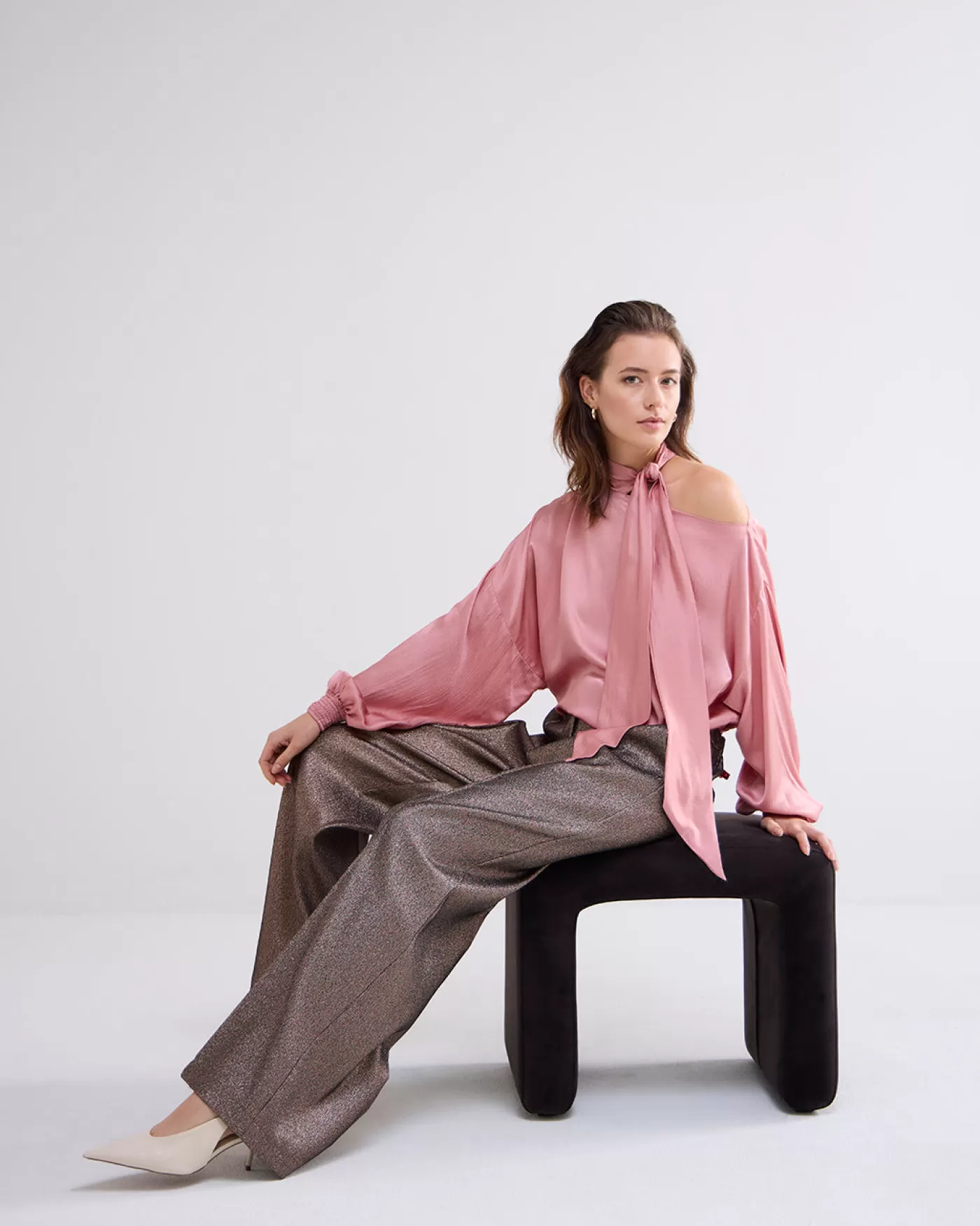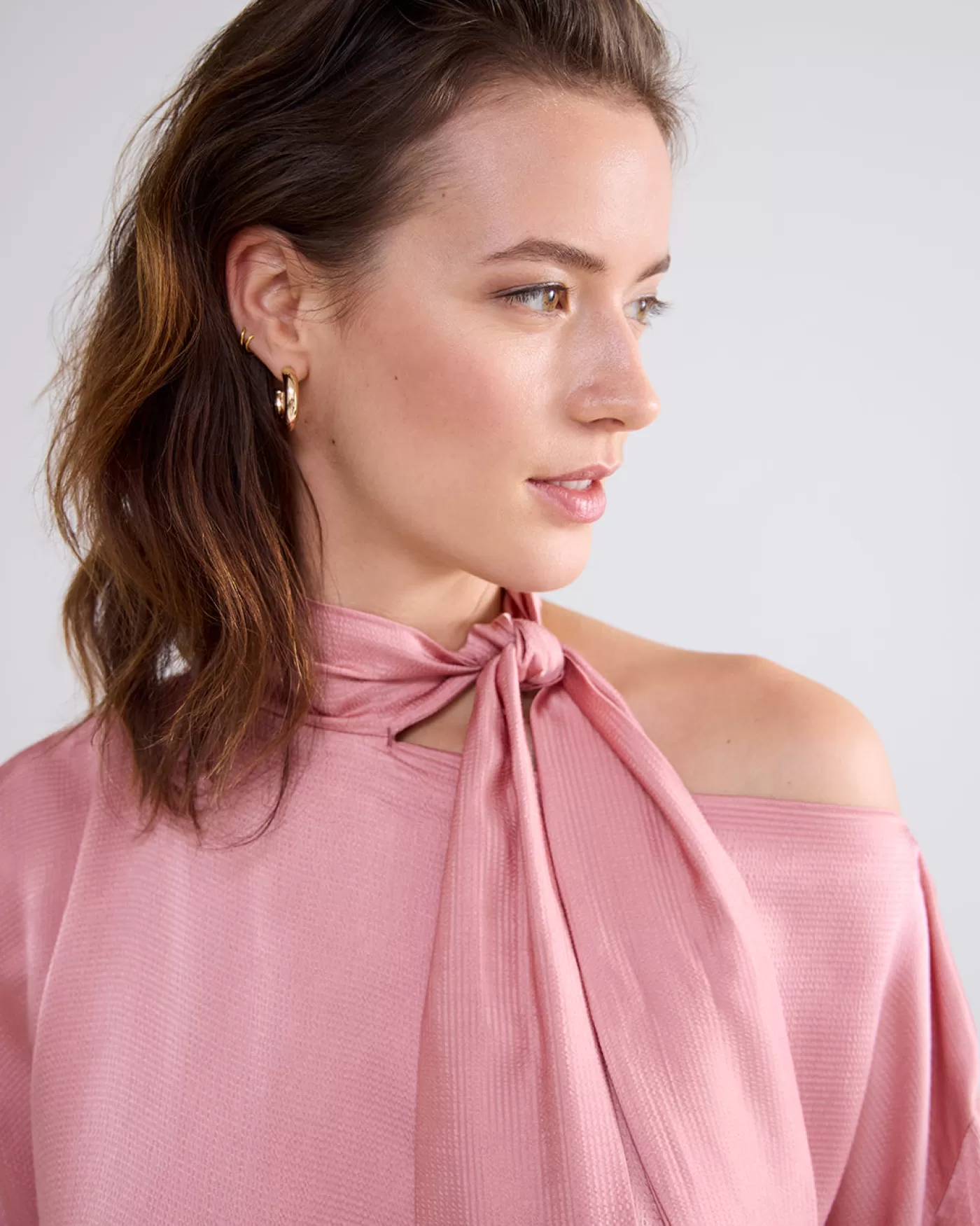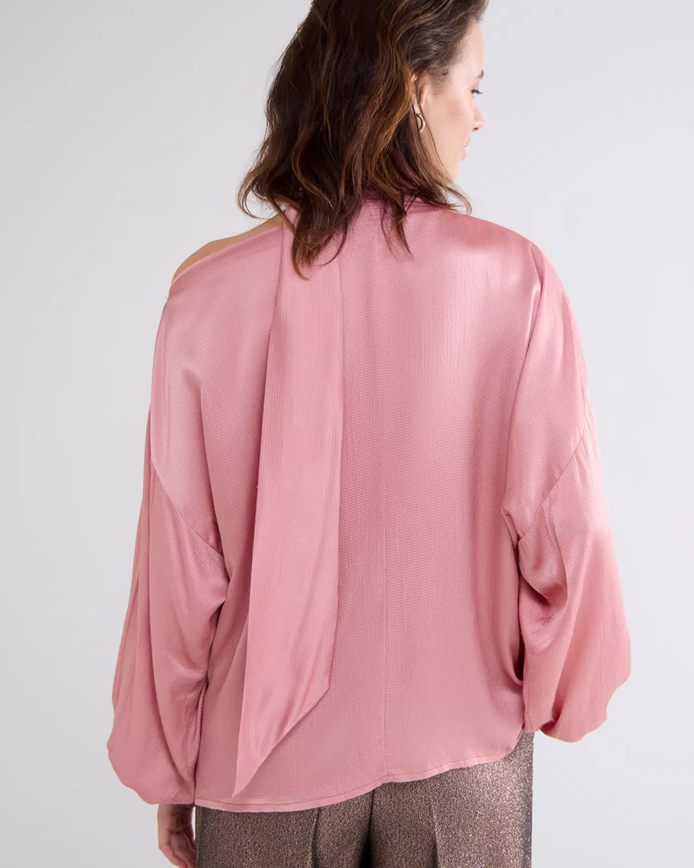 Glanzende top met vleermuismouwen en gesmokte boorden. De strik is aan één zijde van de boothals bevestigd en daardoor…
