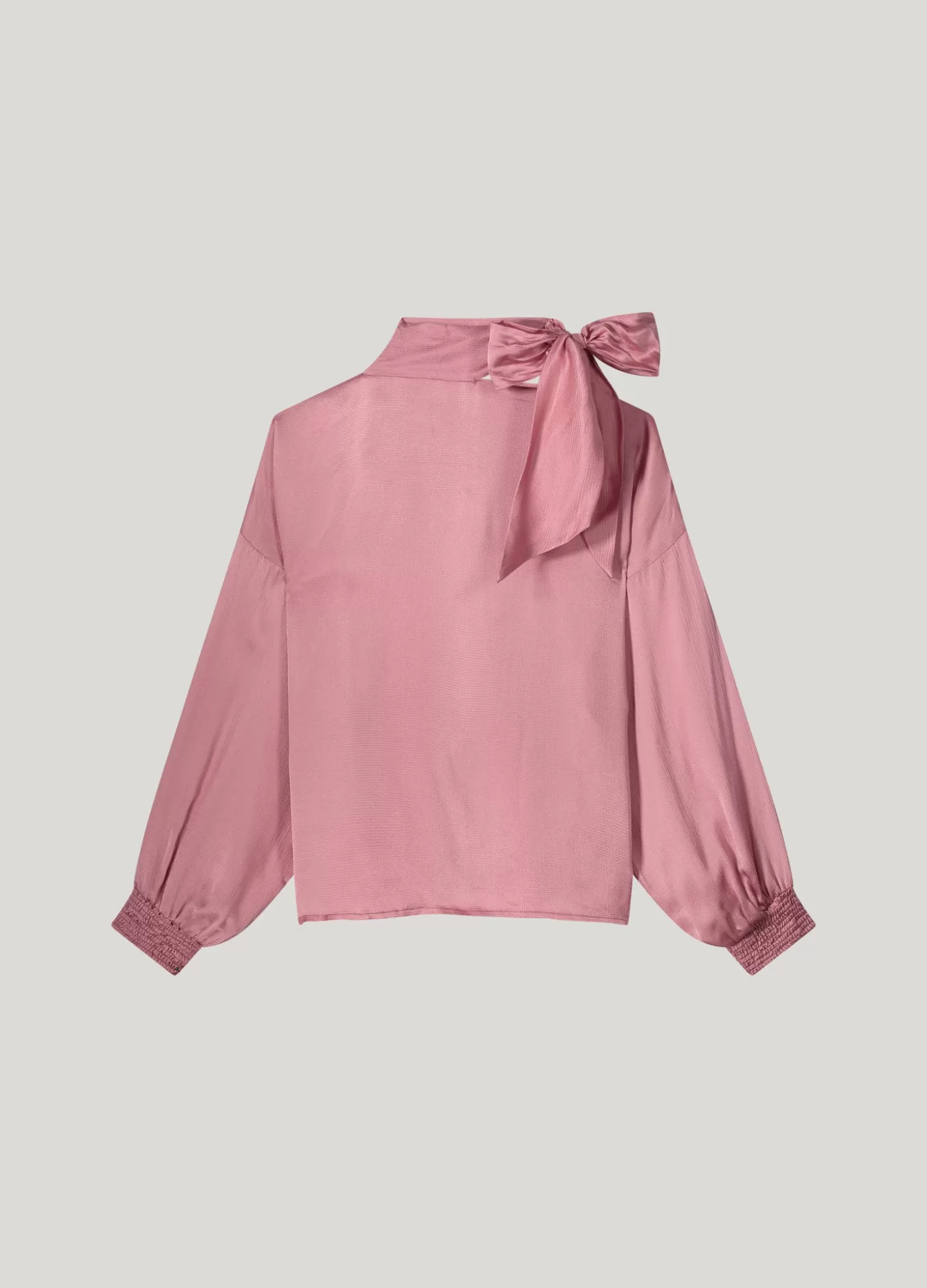 Glanzende top met vleermuismouwen en gesmokte boorden. De strik is aan één zijde van de boothals bevestigd en daardoor wordt er aan de andere kant een iets blote schouder gecreëerd. Boothals Vleermuismouwen Gesmokte boorden Gehamerd viscose met glans