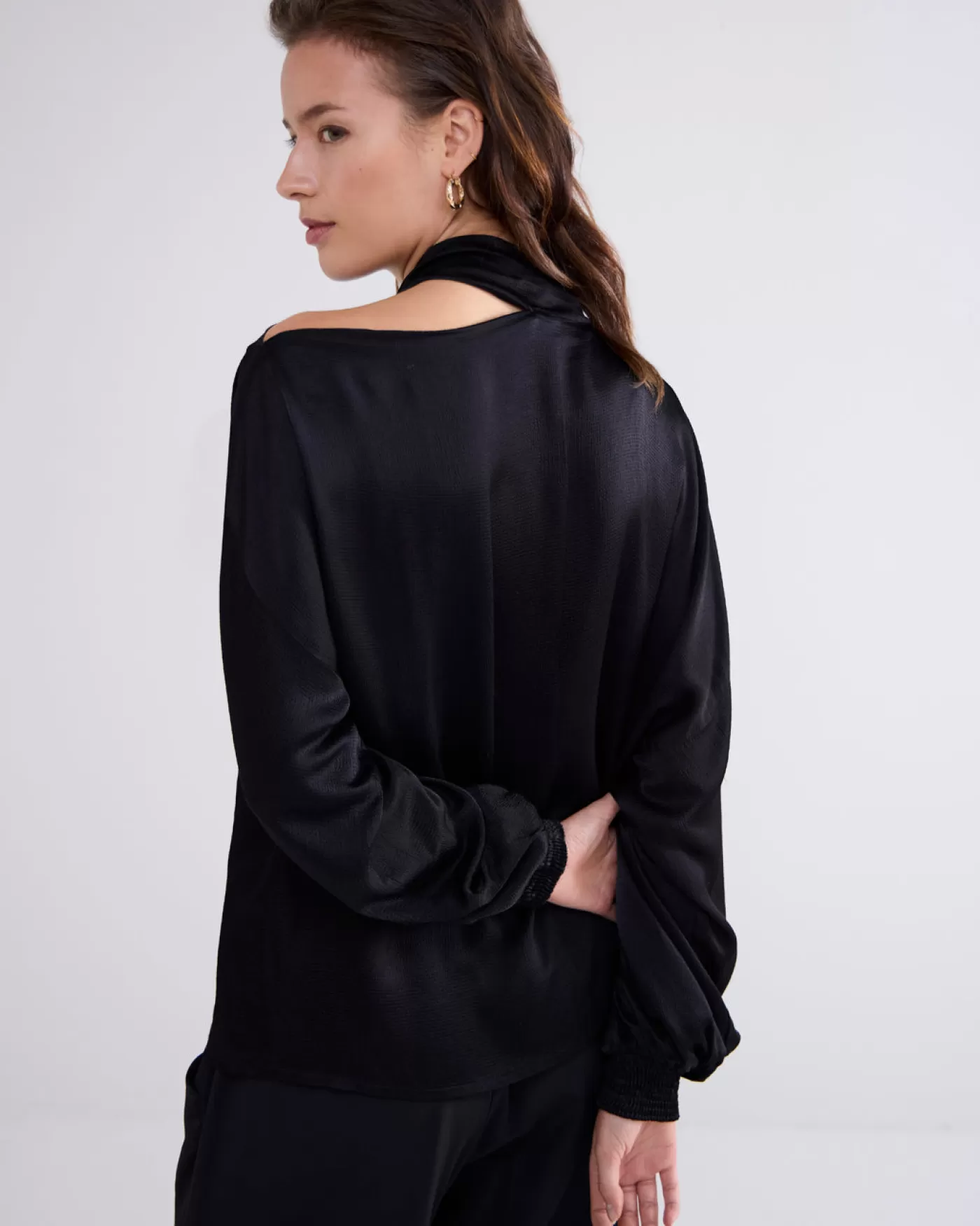 Glanzende top met vleermuismouwen en gesmokte boorden. De strik is aan één zijde van de boothals bevestigd en daardoor…