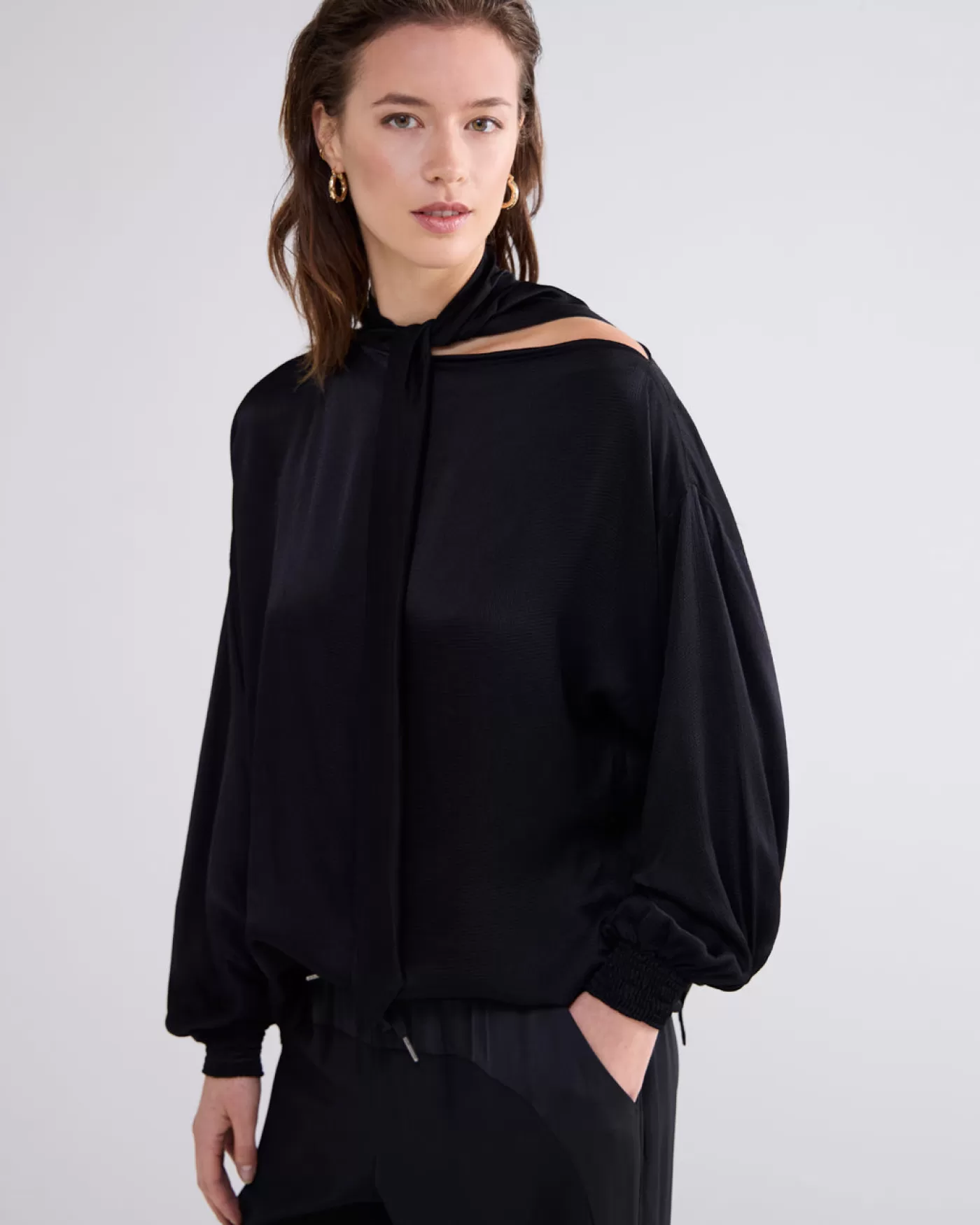 Glanzende top met vleermuismouwen en gesmokte boorden. De strik is aan één zijde van de boothals bevestigd en daardoor wordt er aan de andere kant een iets blote schouder gecreëerd. Boothals Vleermuismouwen Gesmokte boorden Gehamerd viscose met glans