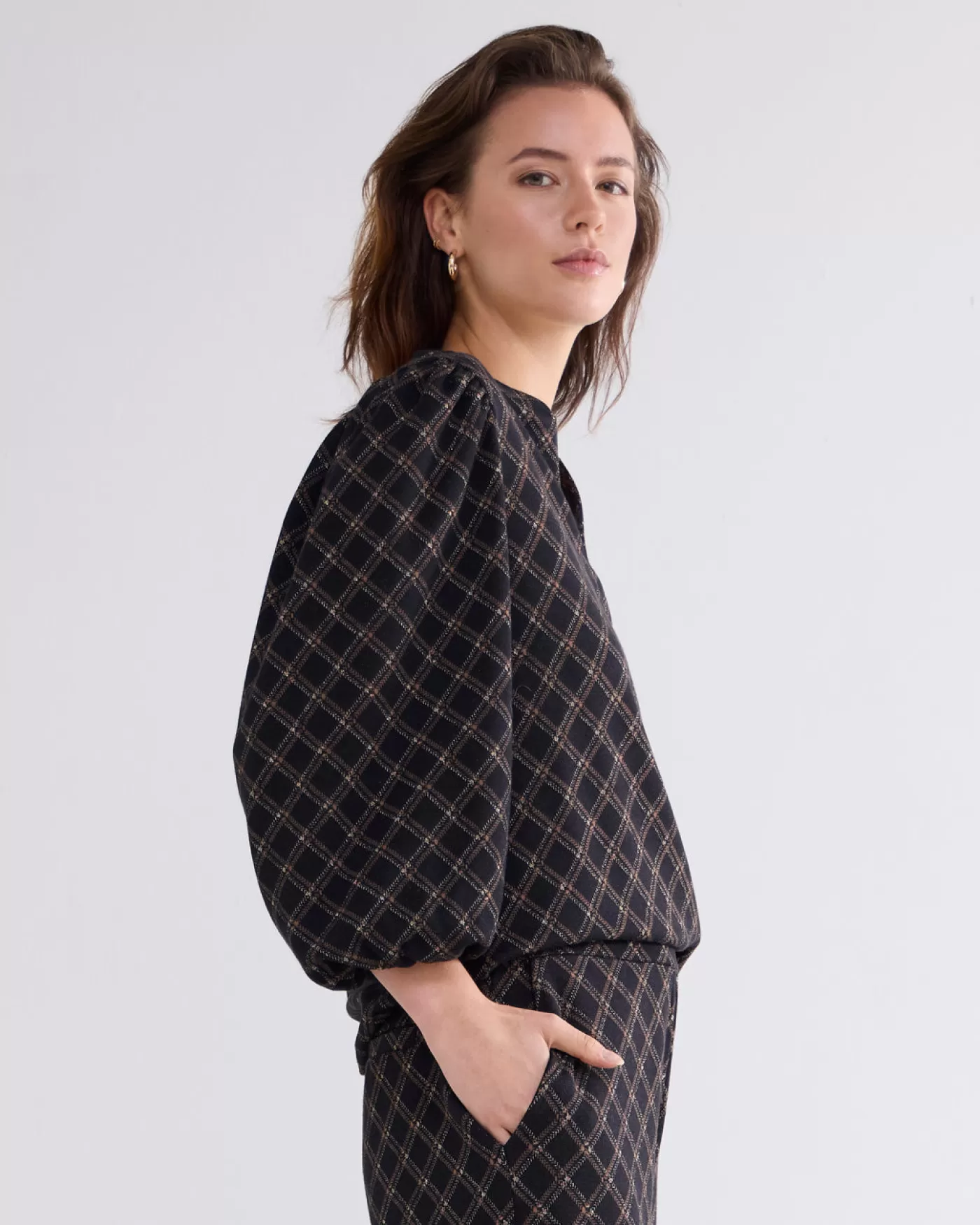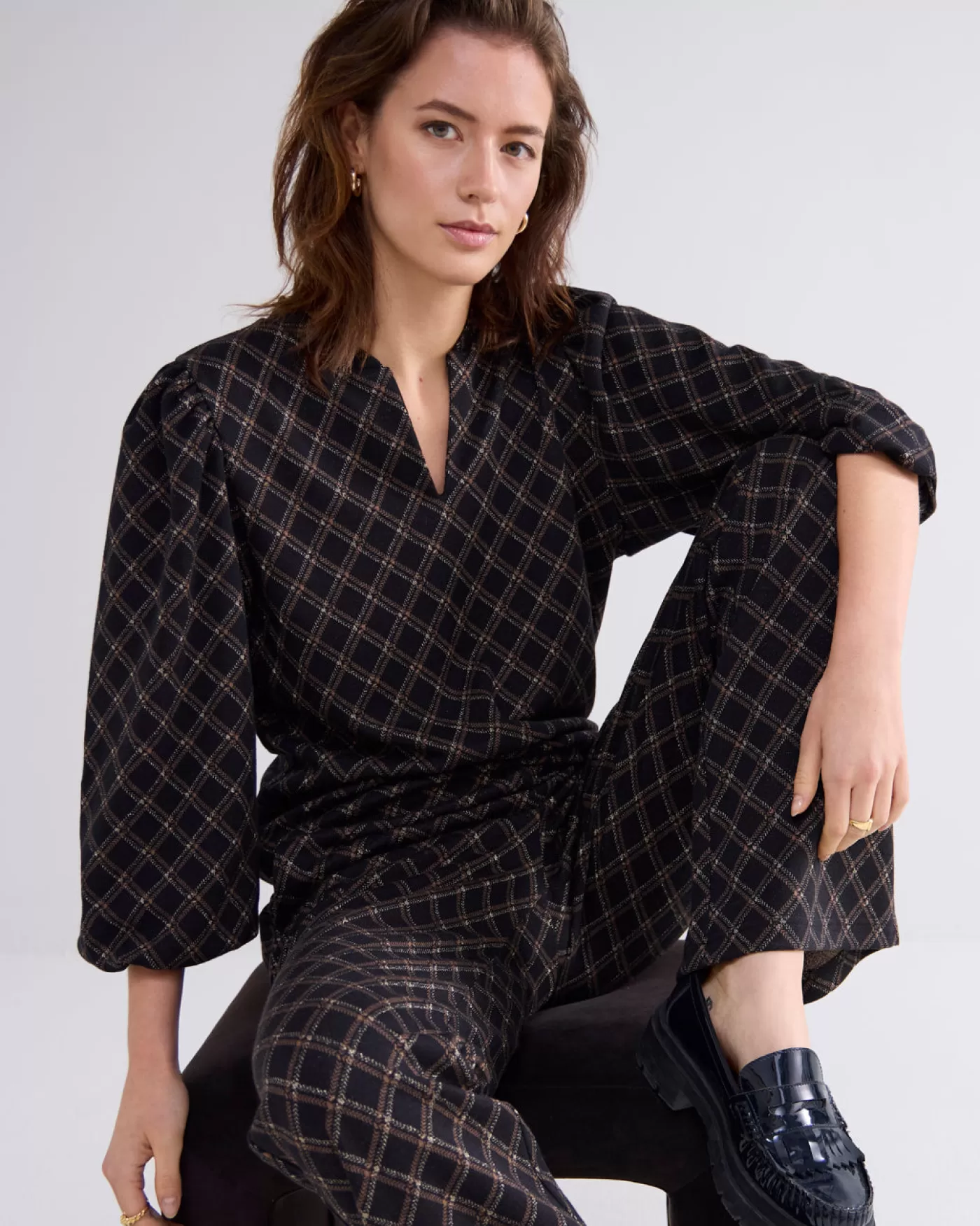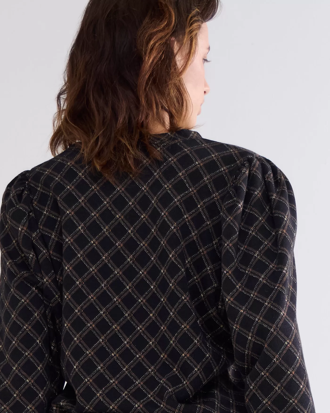 Top met korte ballonmouwen en ronde hals en een ritssluiting aan de achterkant. De top is gemaakt van jacquard met ruitendessin. ronde hals met ritssluiting achter korte ballonmouwen metalen knopen op schouders jacquard met ruitendessin