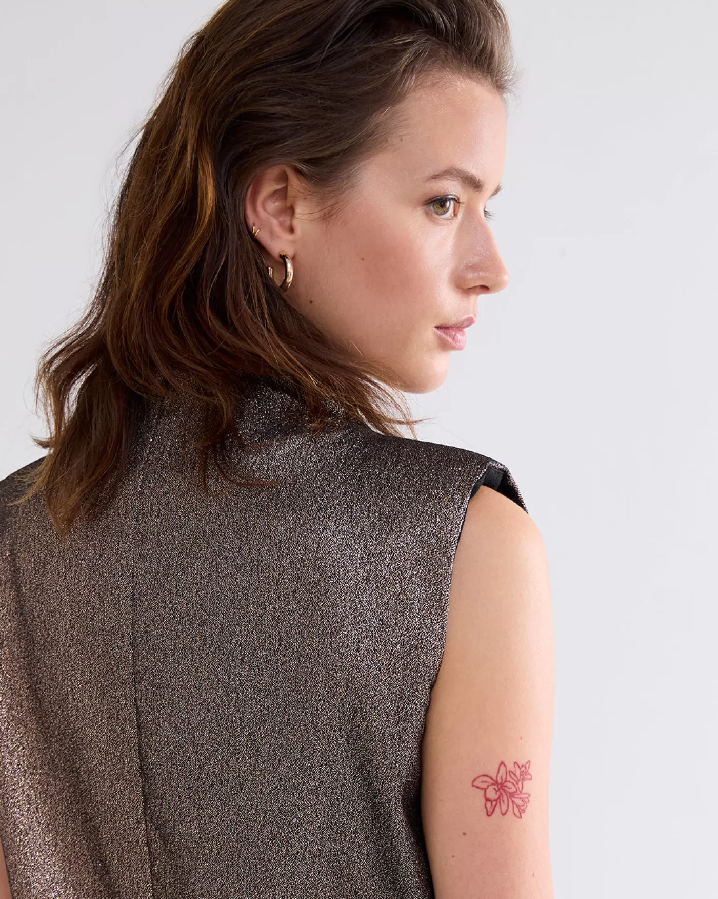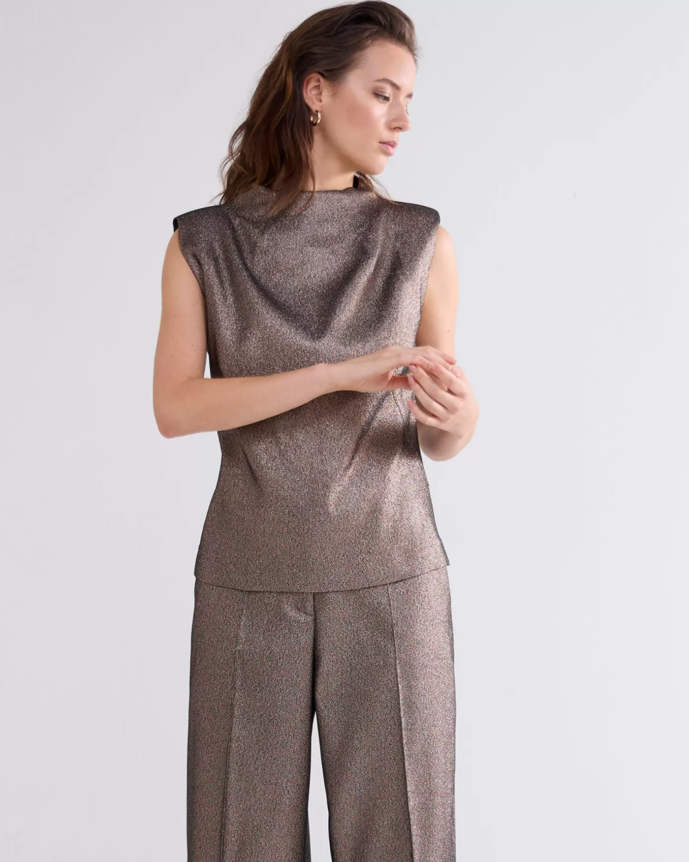 Mouwloze glittertop met een hoge hals en een blinde rits in het achterpand. De top is afgewerkt met kleine splitjes aan …
