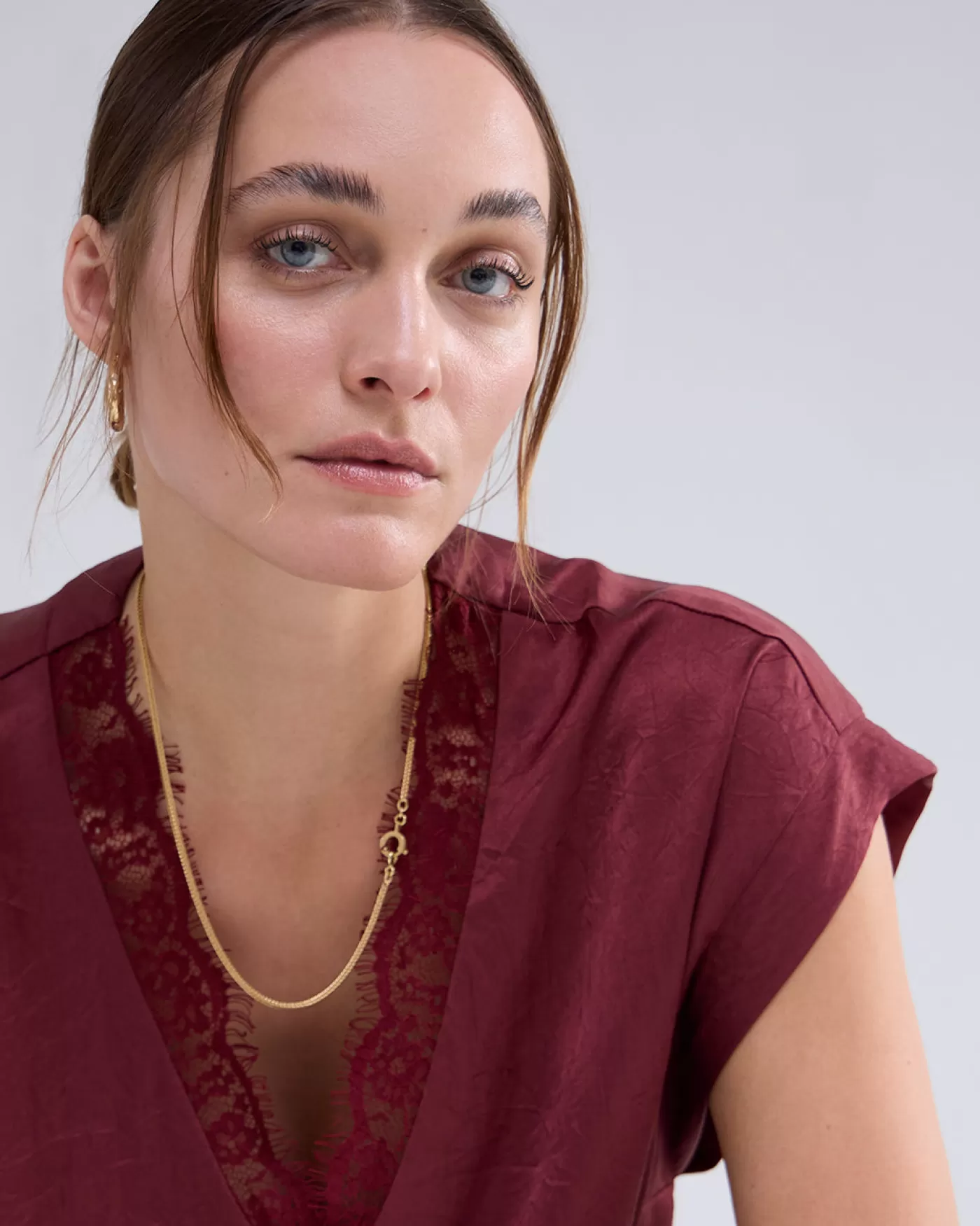 Mouwloze top met een elegante V-hals afgewerkt met kant. De top is gemaakt van een satijnlook stof met licht gehamerd effect. mouwloos V-hals met kant luchtig en elegant gehamerd satijnlook