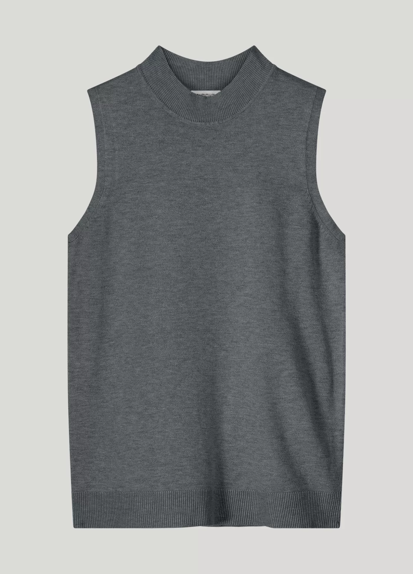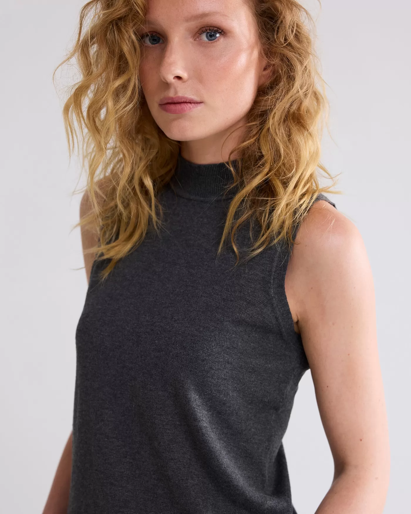 Fijngebreide mouwloze top met een opstaand rib-boordje. De top is gebreid in een compacte viscose polyamide garen met ge…