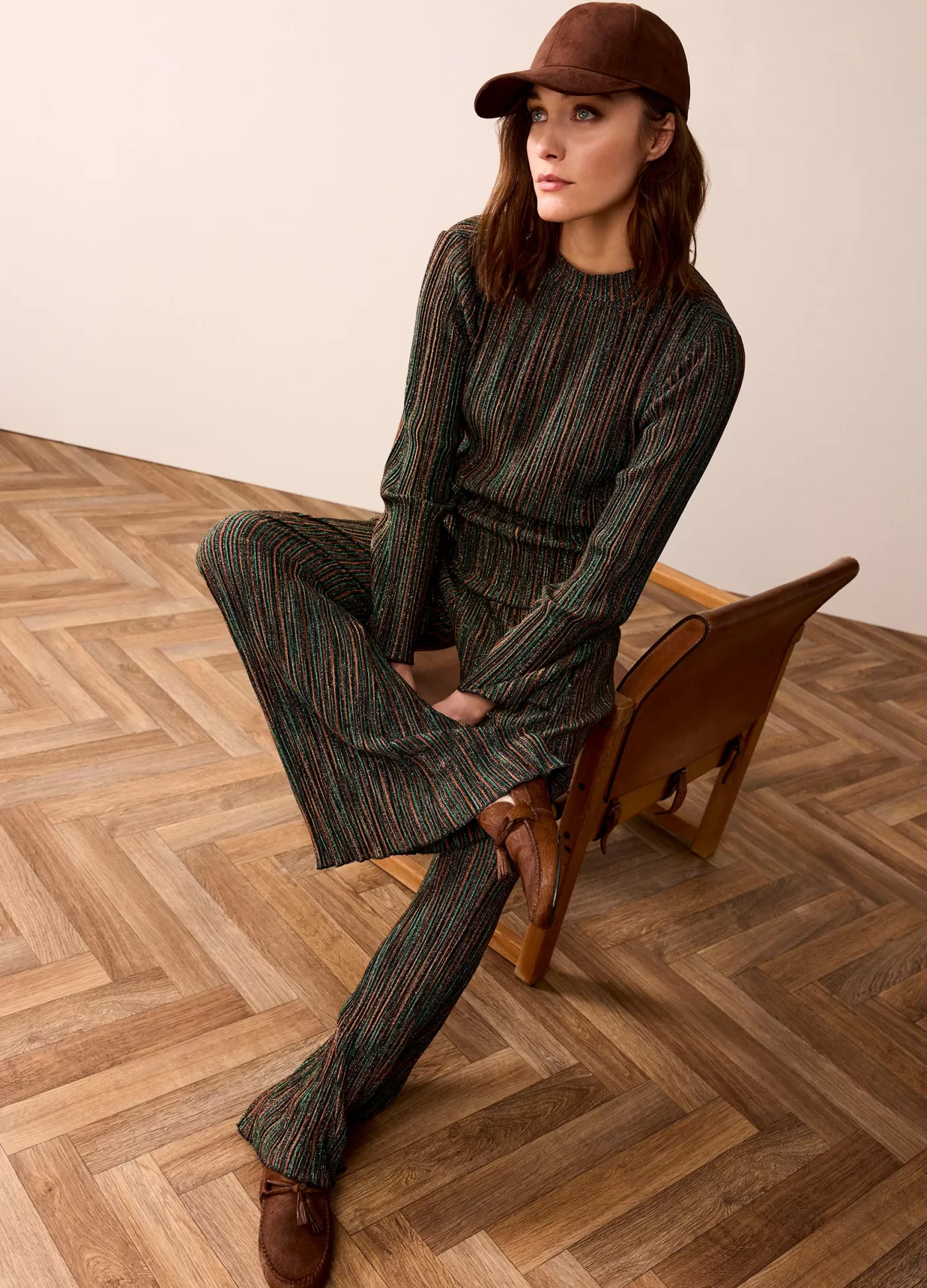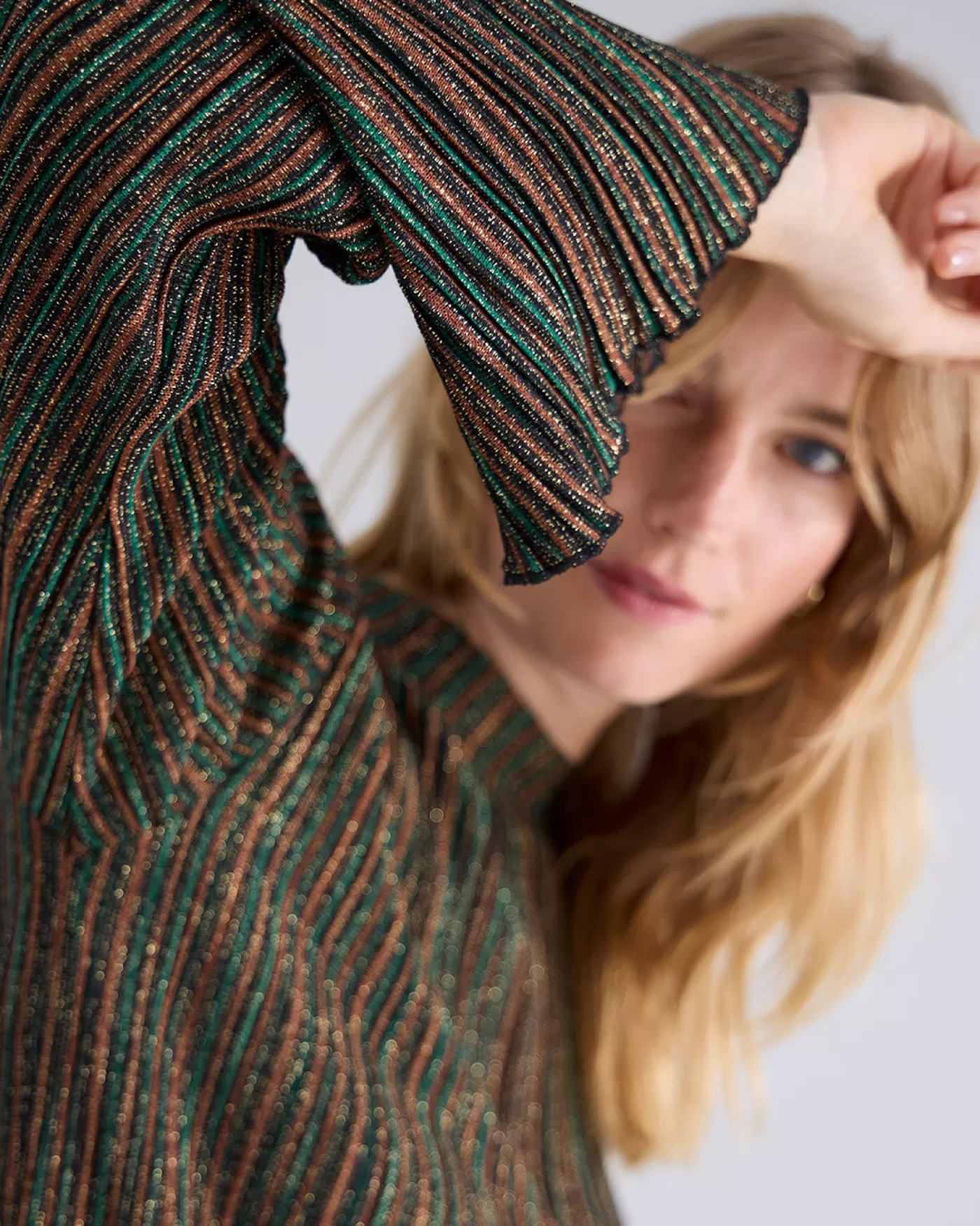 Plissé jersey top met een opstaande kraag en lange trompetmouwen. De top heeft een meerkleurig streepdesign voorzien van goudkleurig, glinsterend garen. opstaande kraag lange trompetmouwen gestreepte plissé jersey goudkleurige garen