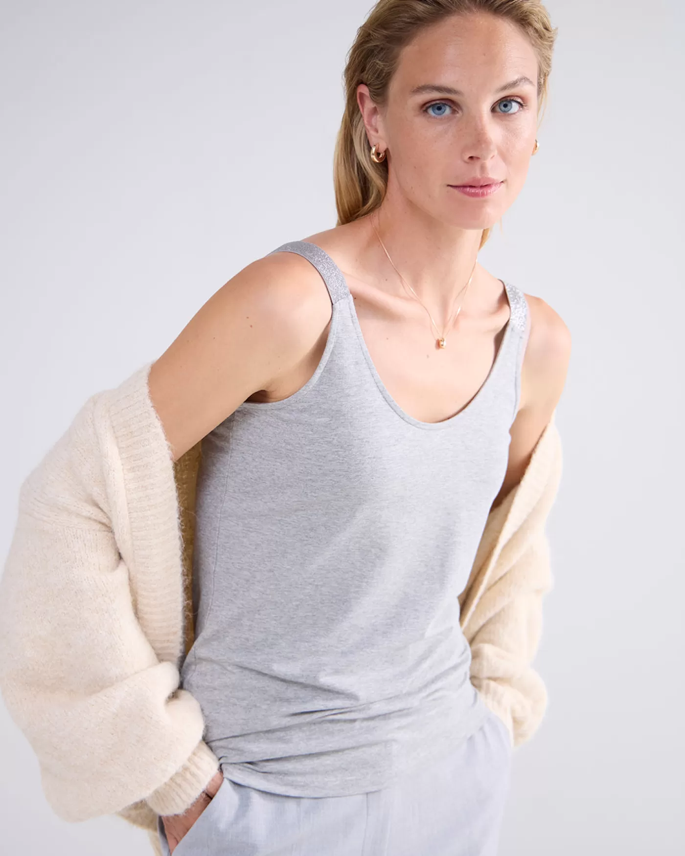 Klassiek hemdje met glitterbandjes dat aan beide kanten gedragen kan worden. Het singlet is gemaakt van stretchkatoen en…