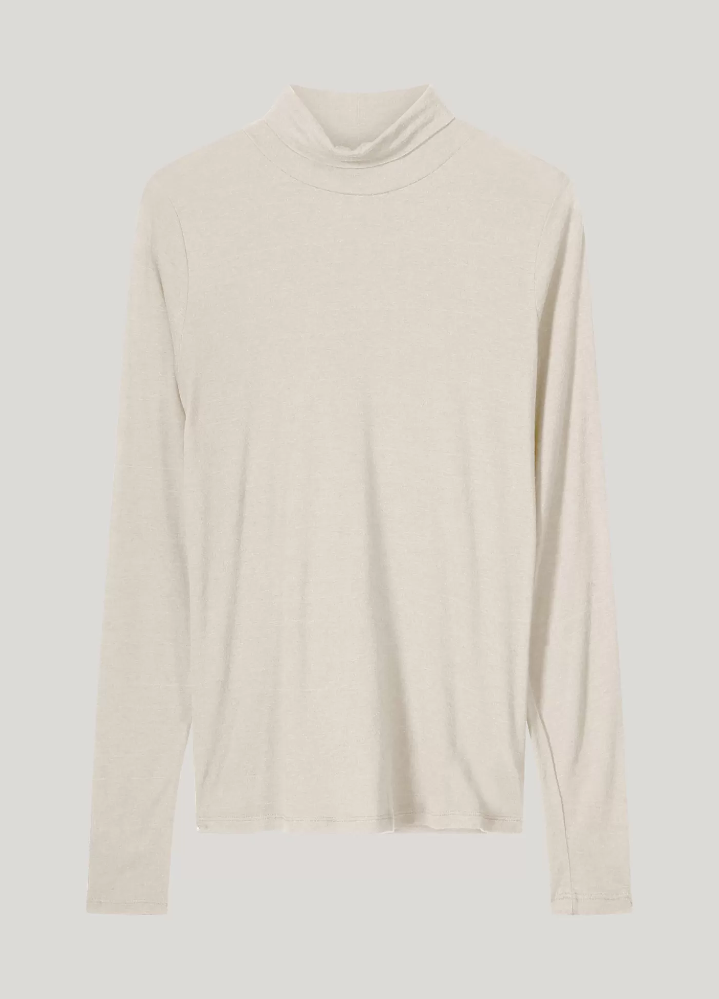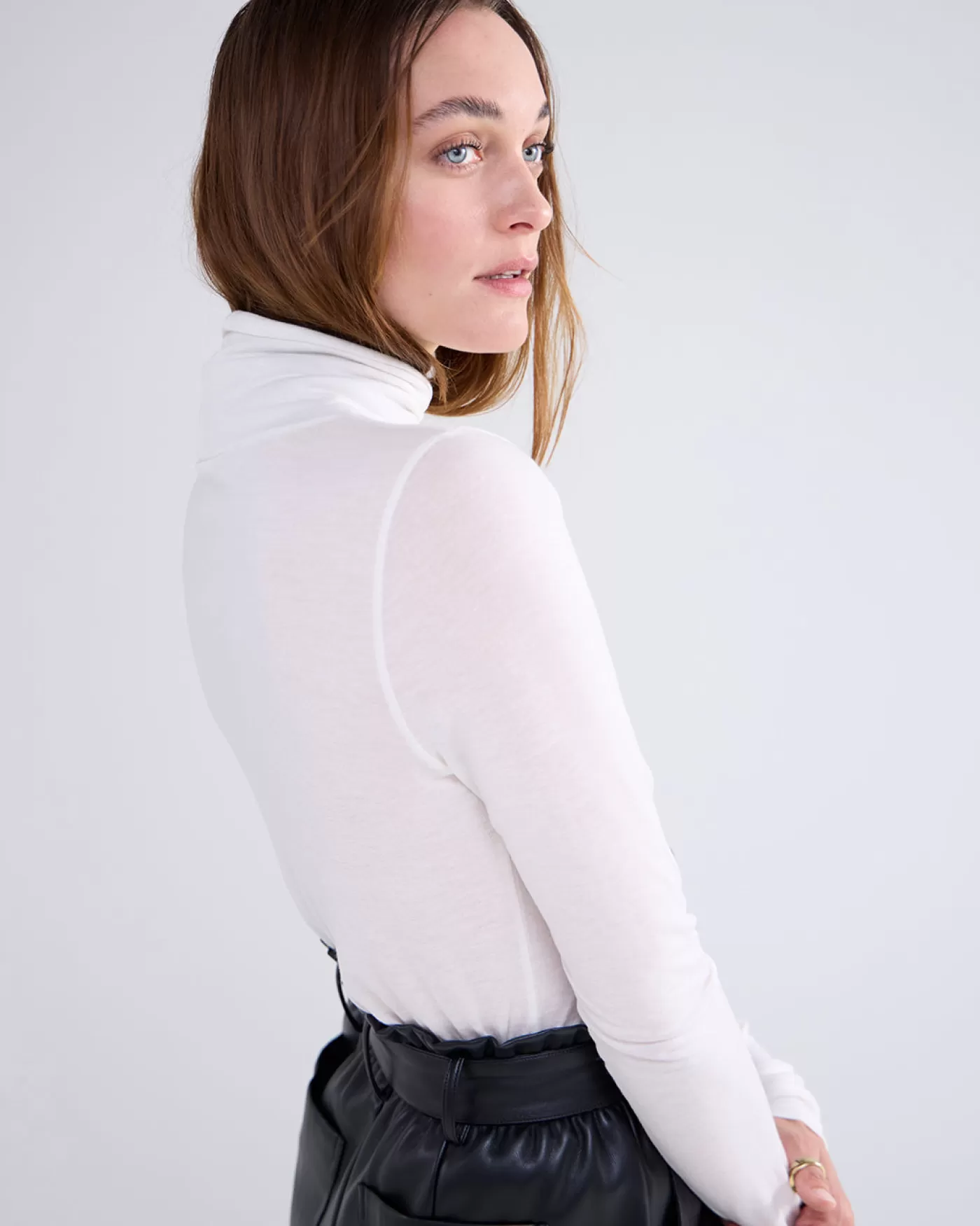 Nauwsluitende dunne coltrui met lange mouwen. De top is gemaakt van een viscose-wolmix in een rekbare jersey kwaliteit.l…