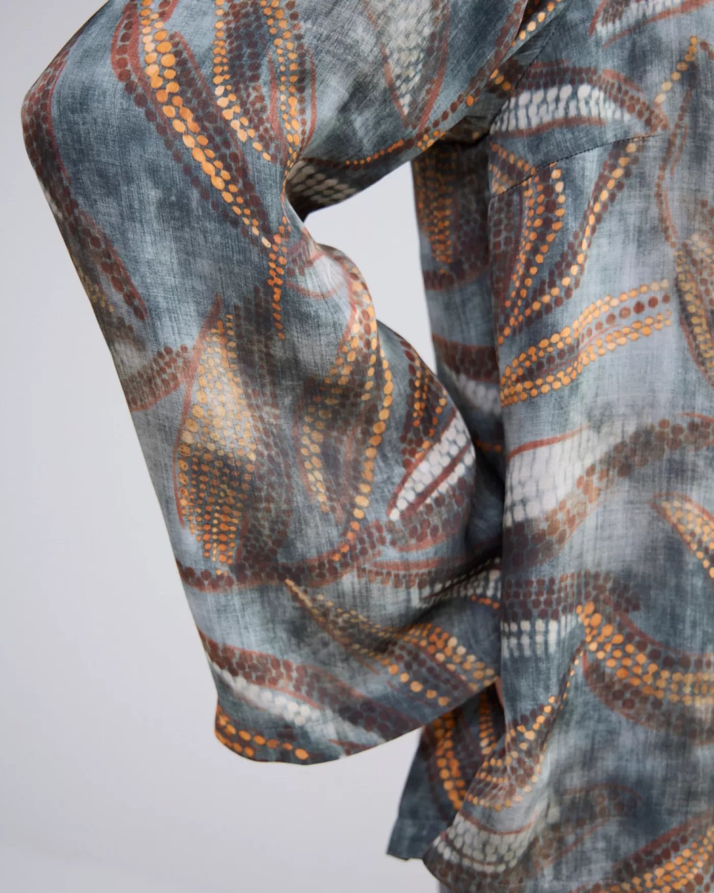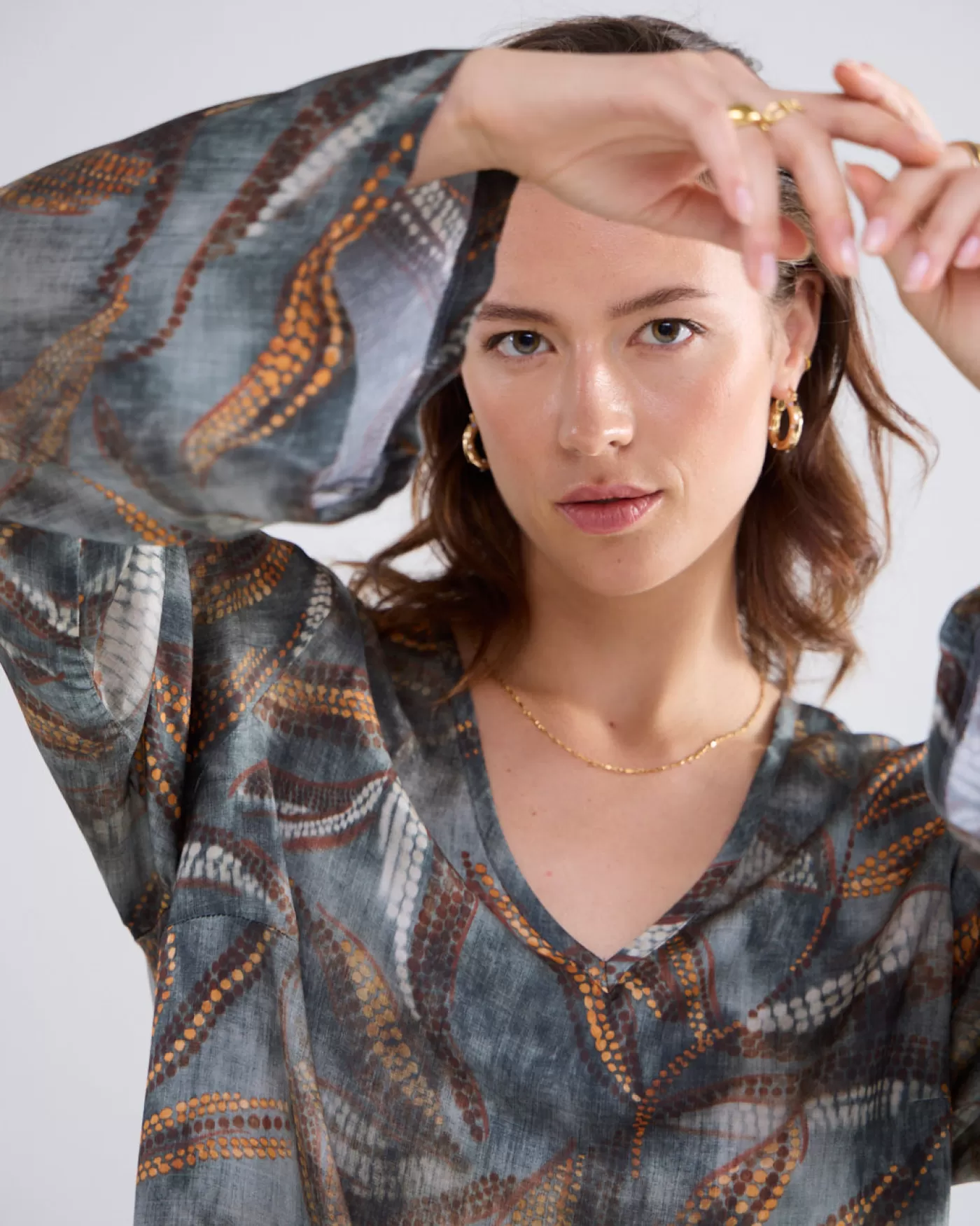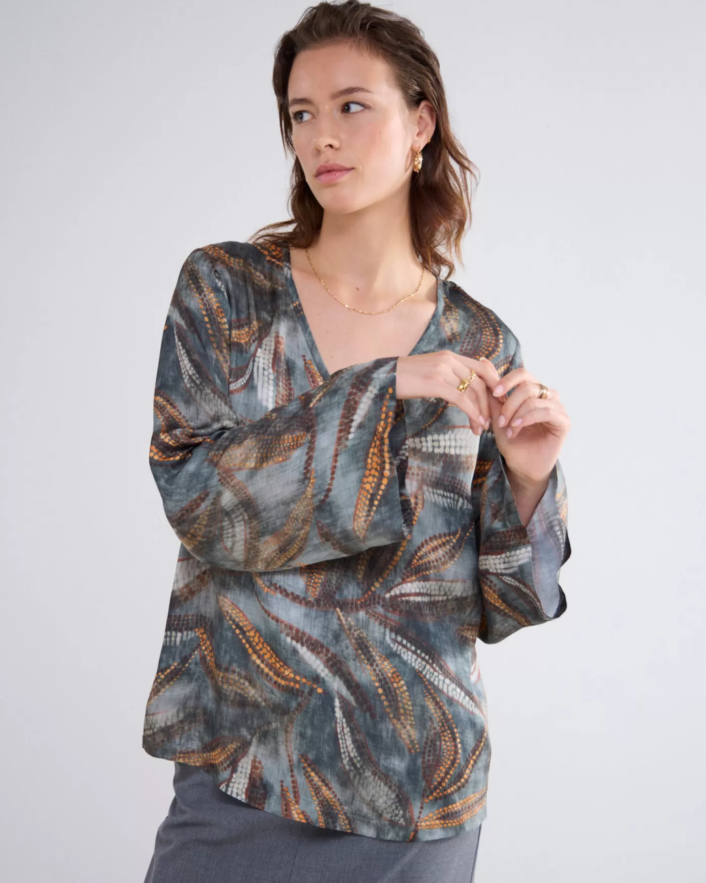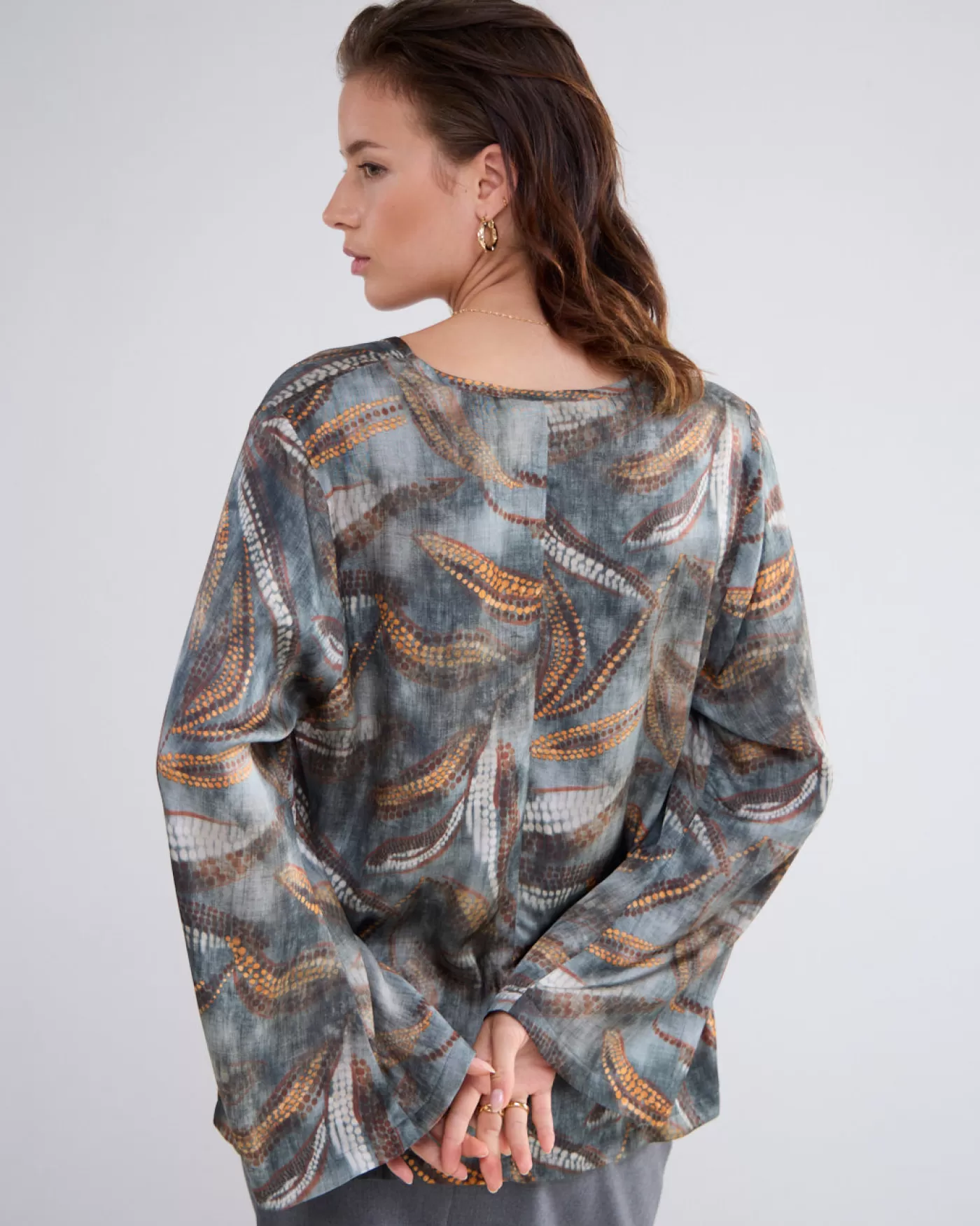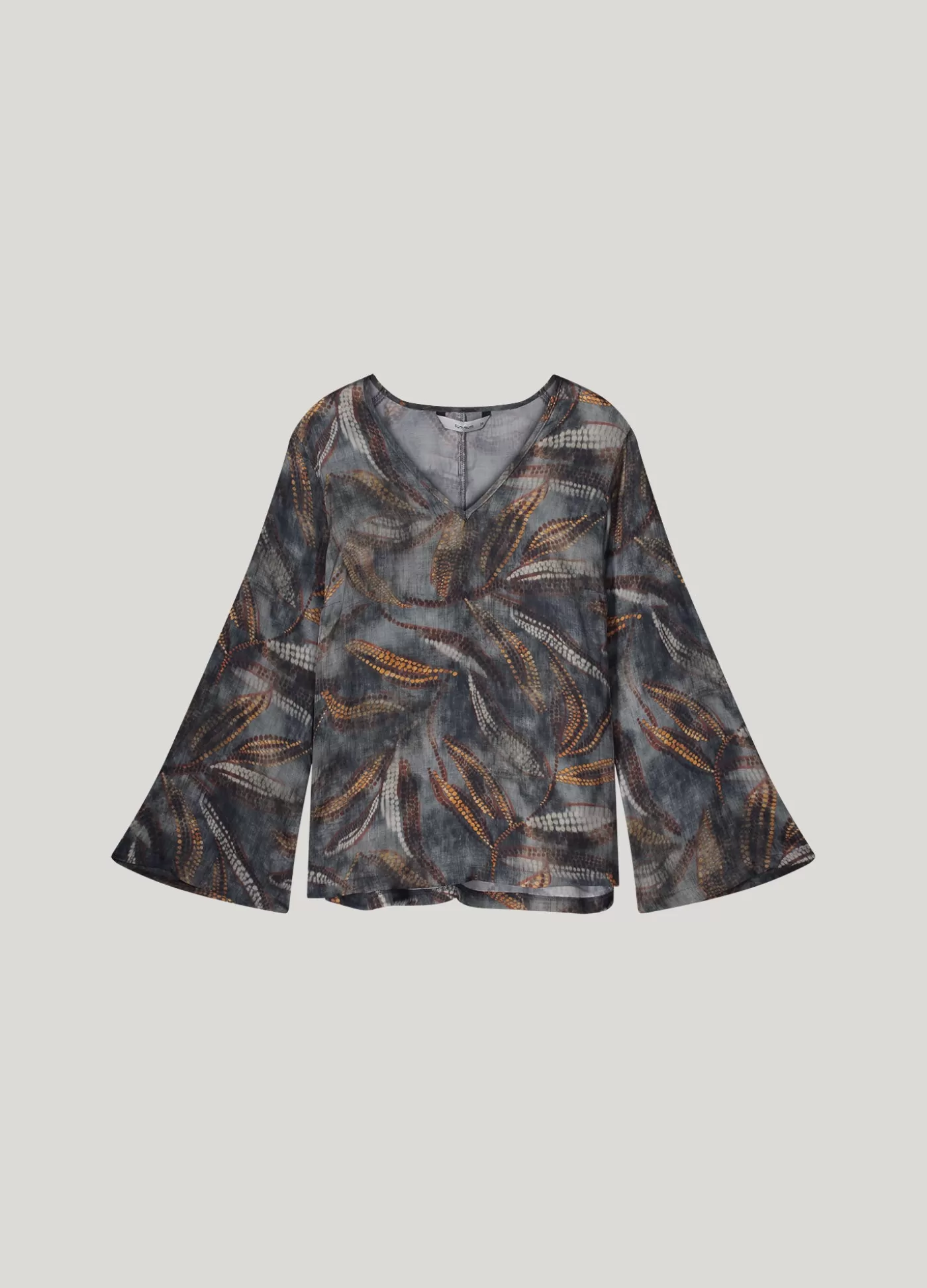 Top met een V-hals en iets uitlopende mouwen, gemaakt van licht glanzende soepele bedrukte stof. De top heeft een rechte snit. V-hals uitlopende mouwen soepele geprinte stof licht glanzend