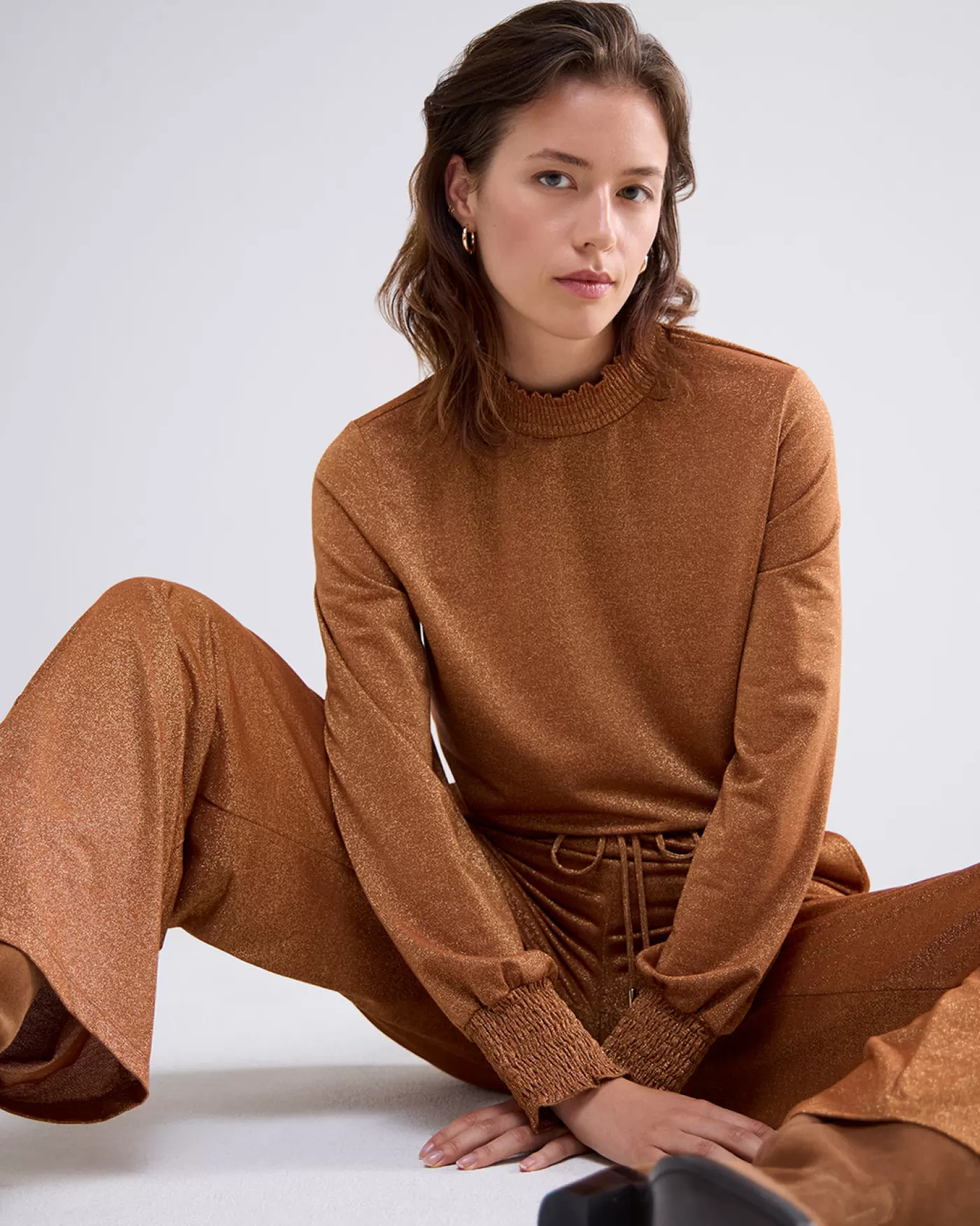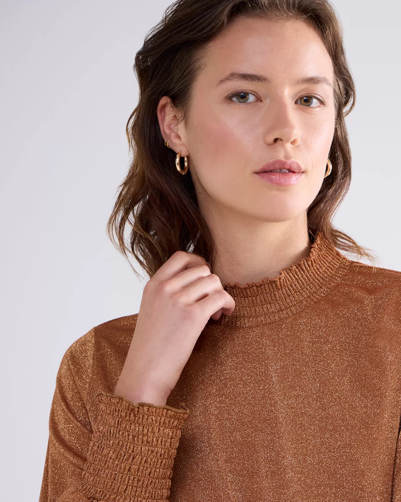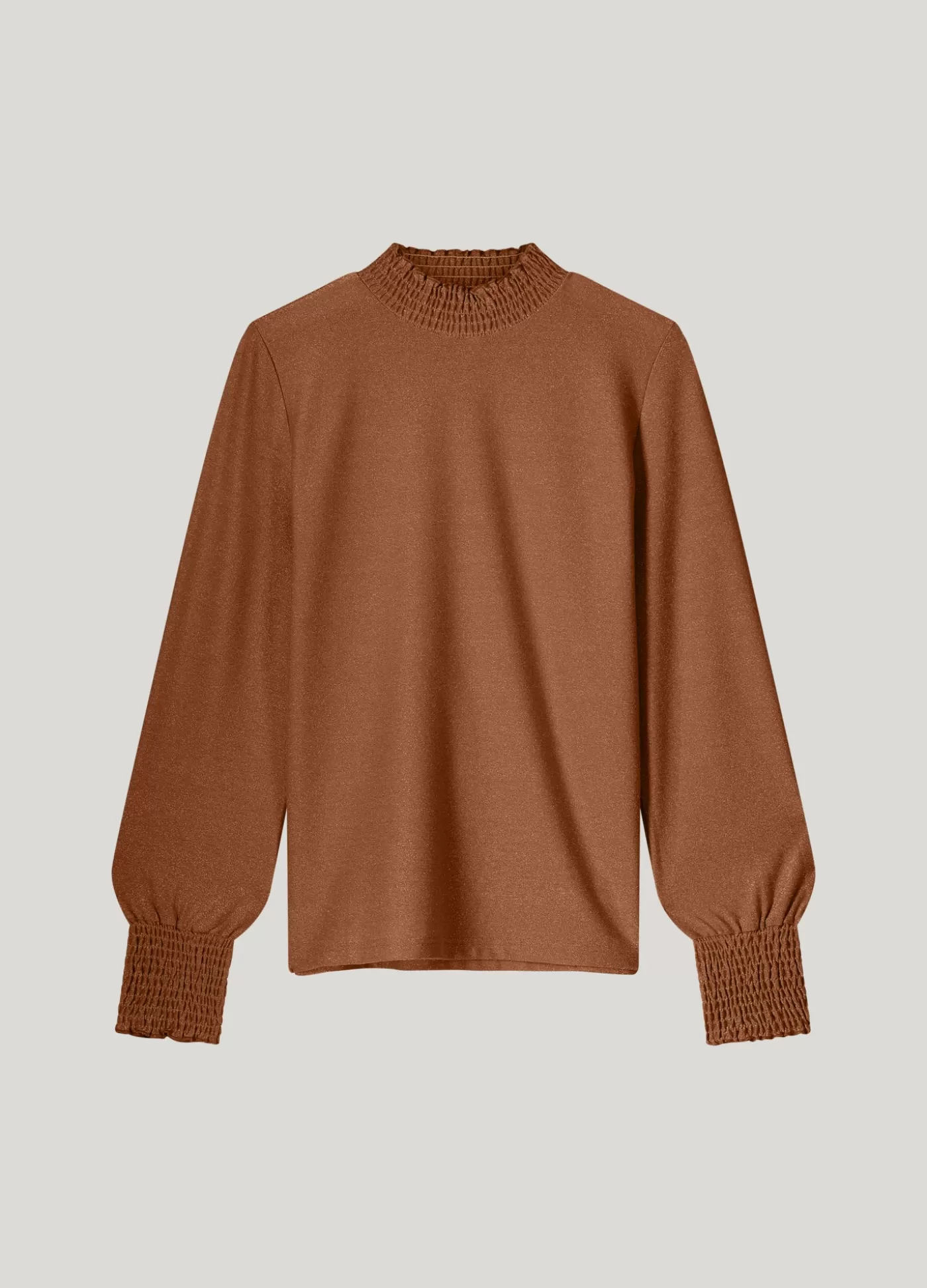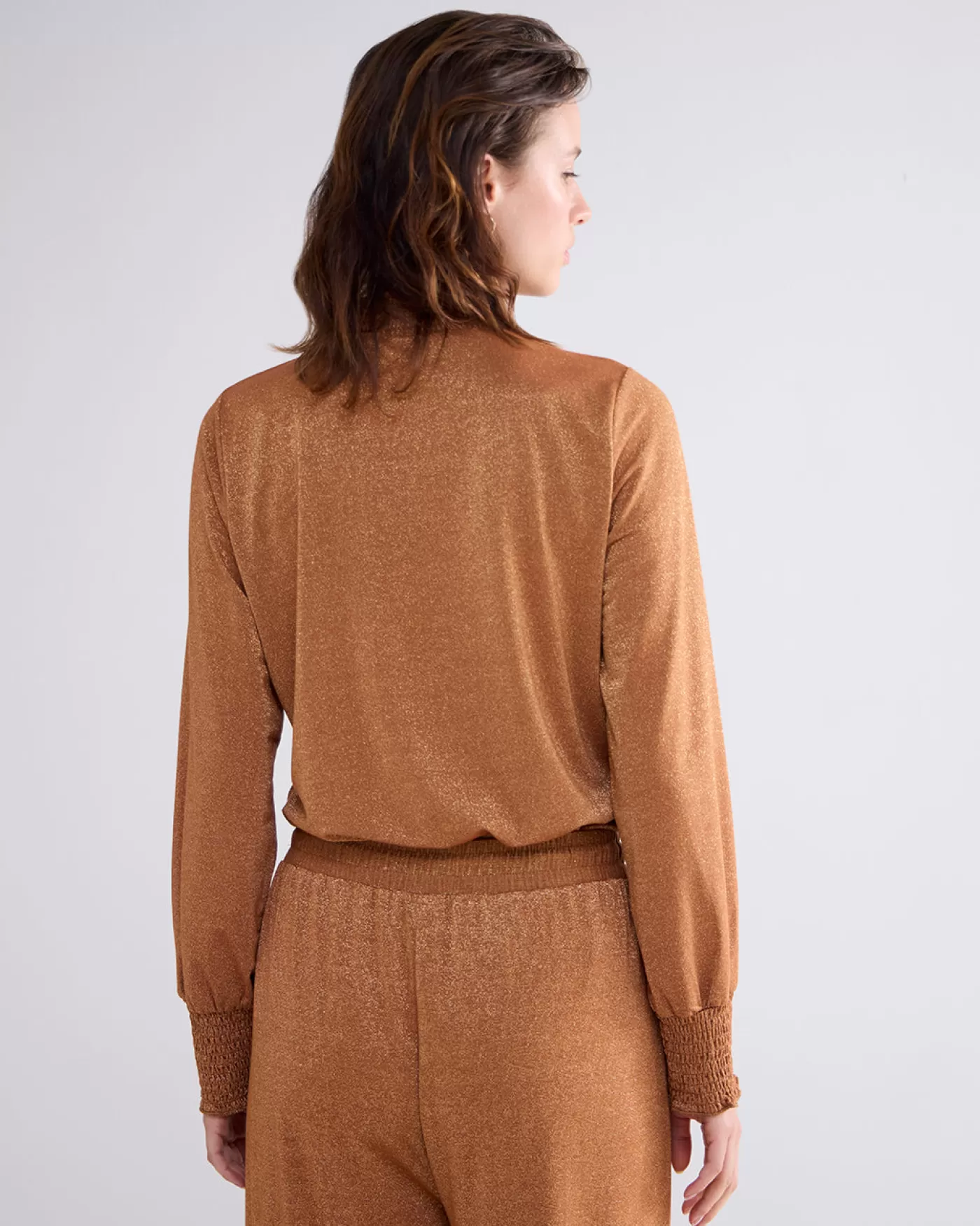 Blouse met normale pasvorm en lange mouwen, voorzien van gesmokte manchetten en een opstaande halslijn. Gemaakt van jersey stof met metallic garen. normale fit gesmokte manchetten opstaande halslijn metallic garen jersey