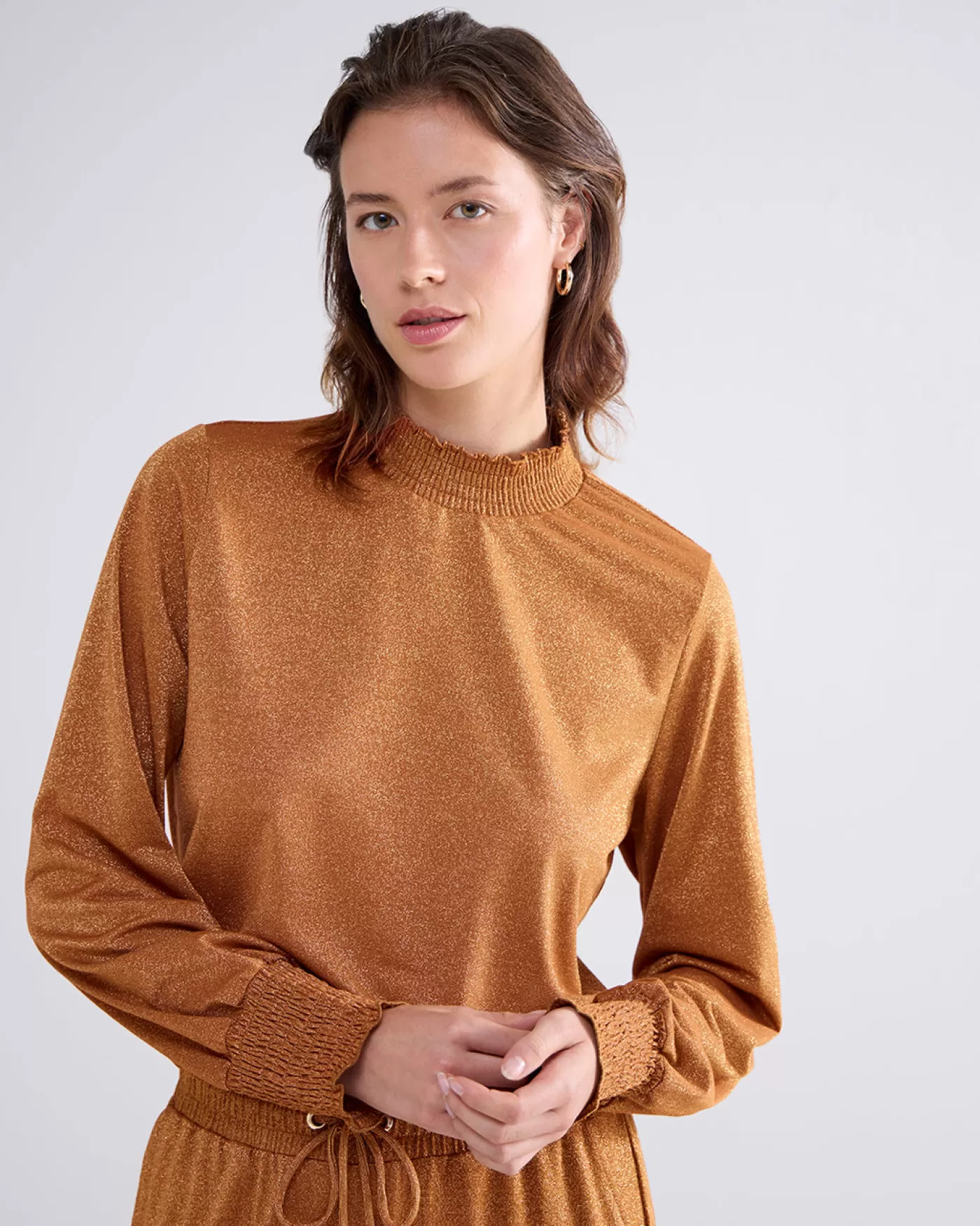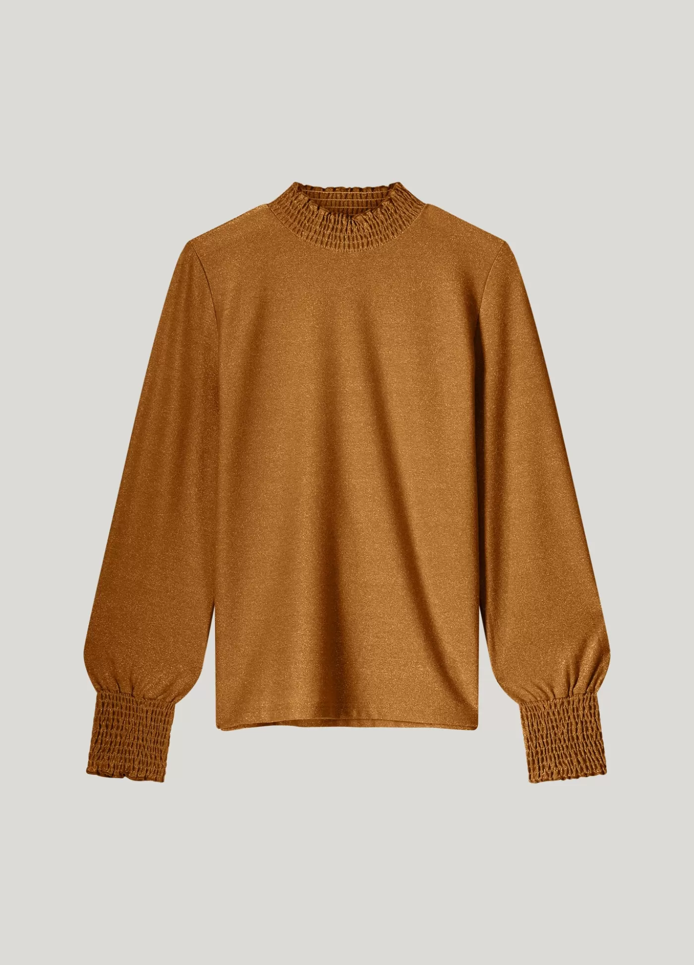 Blouse met normale pasvorm en lange mouwen, voorzien van gesmokte manchetten en halslijn. De blouse is gemaakt van jersey stof met metallic garen. normale fit gesmokte manchetten opstaande halslijn metallic garen jersey