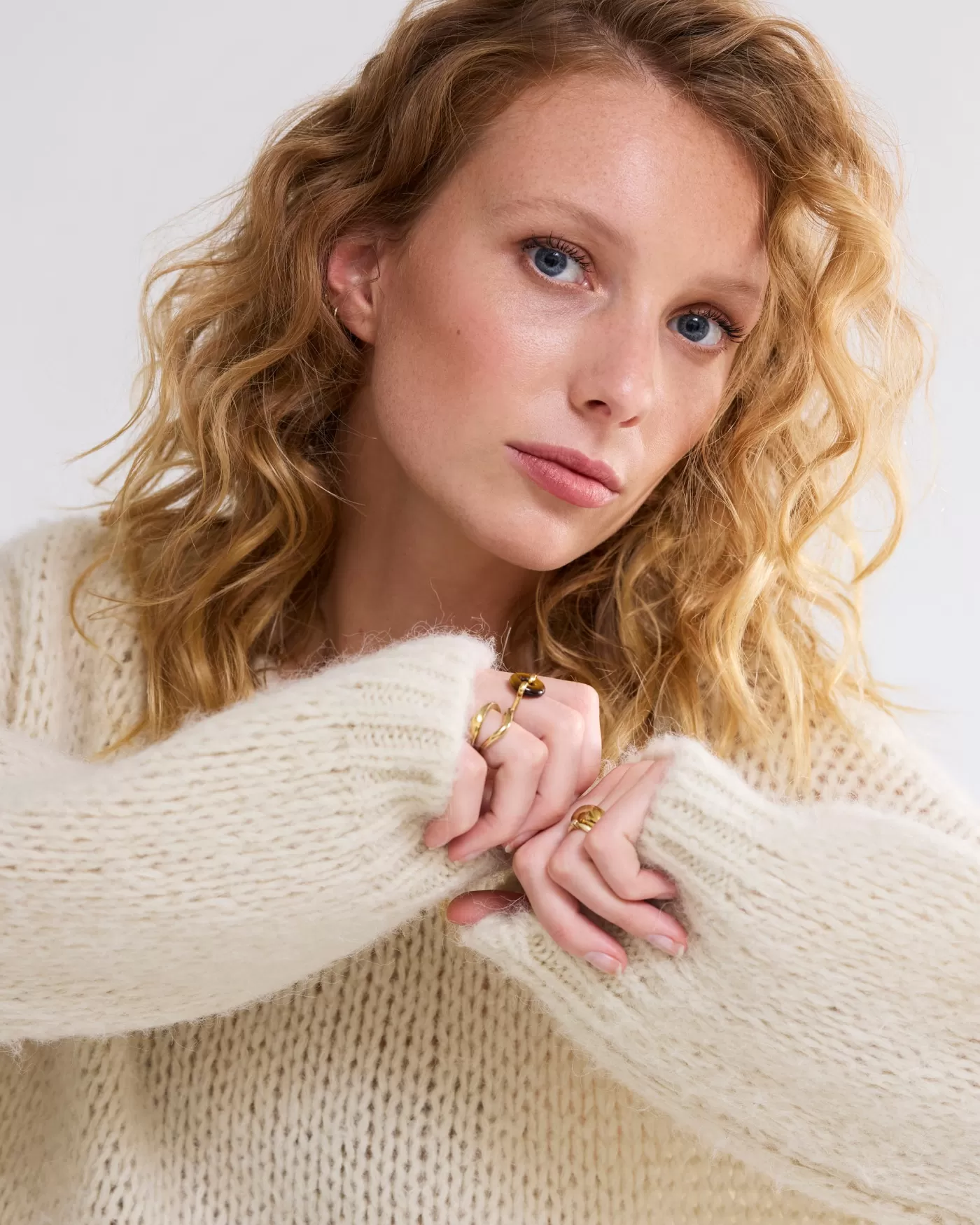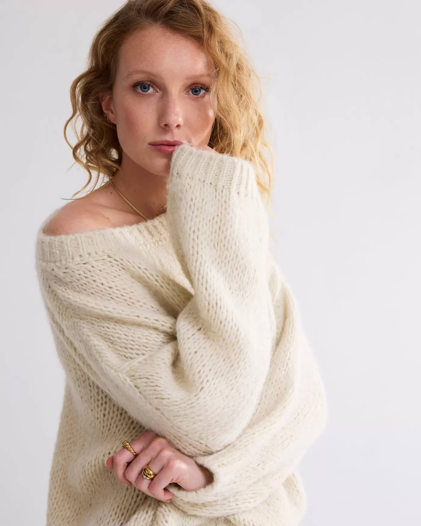 Boxy trui in een grove steek. Voorzien van een ruime ronde hals en een boxy fit. Gemaakt van een blend met alpaca wol. boxy fit grove steek ruime ronde hals alpaca wol blend