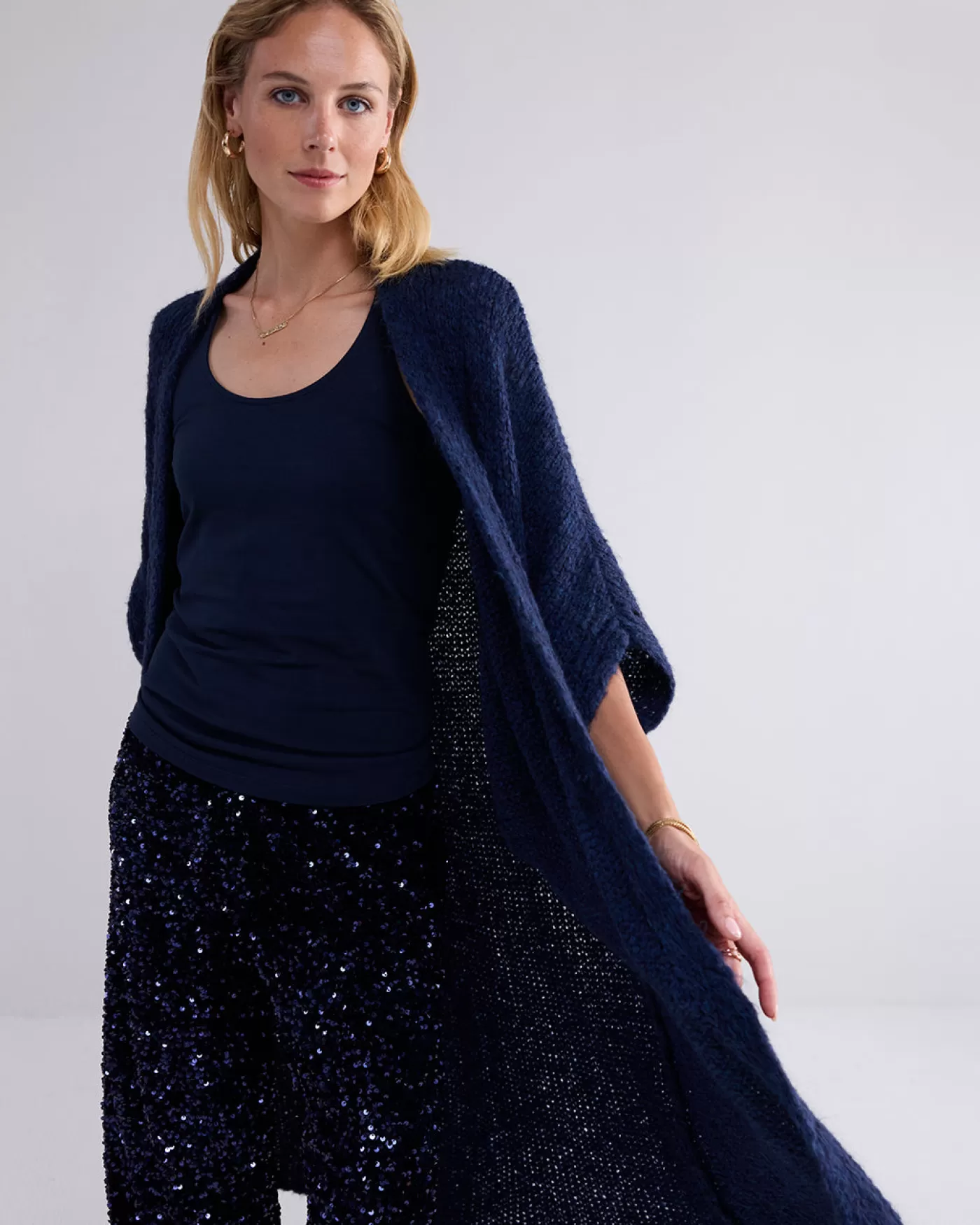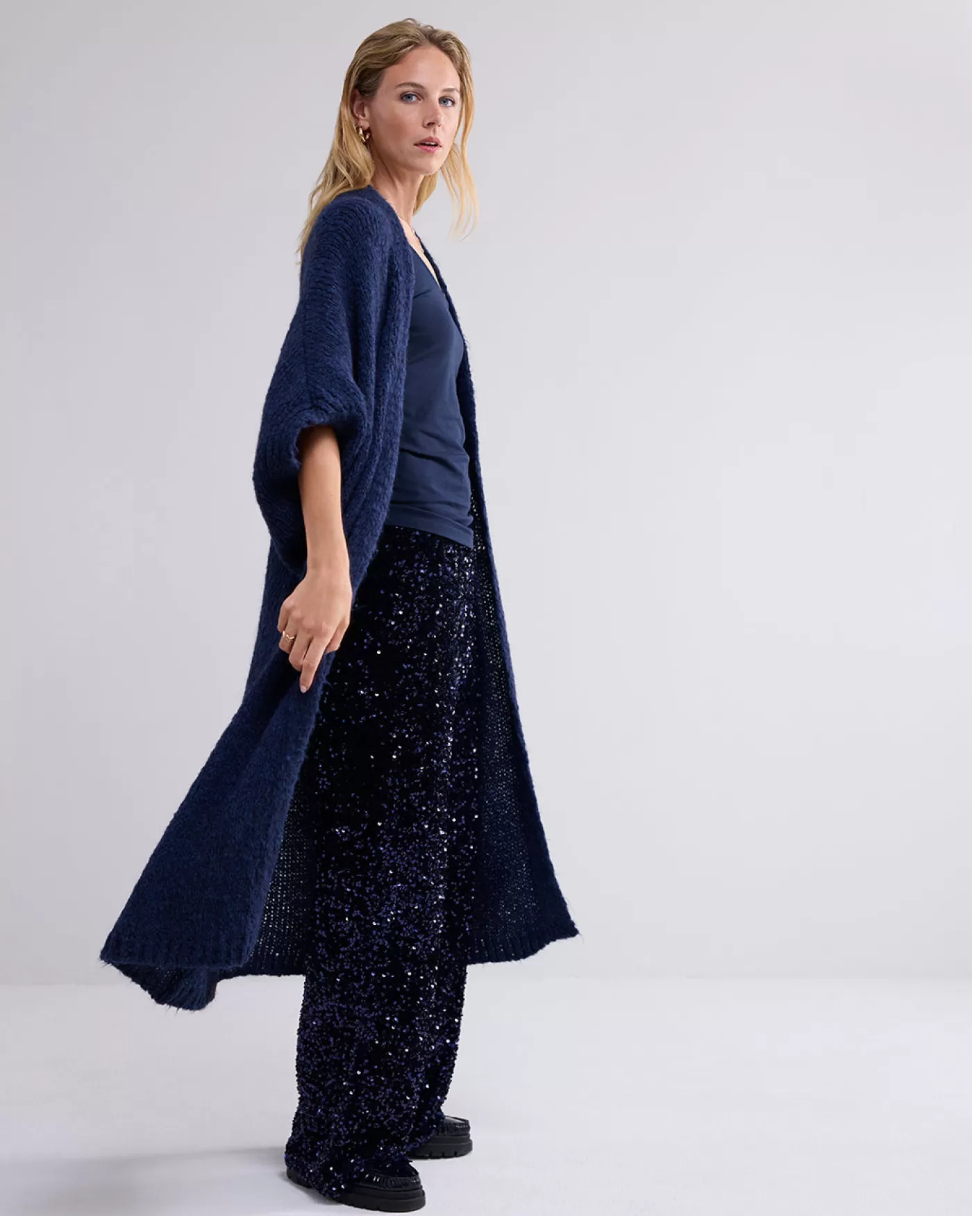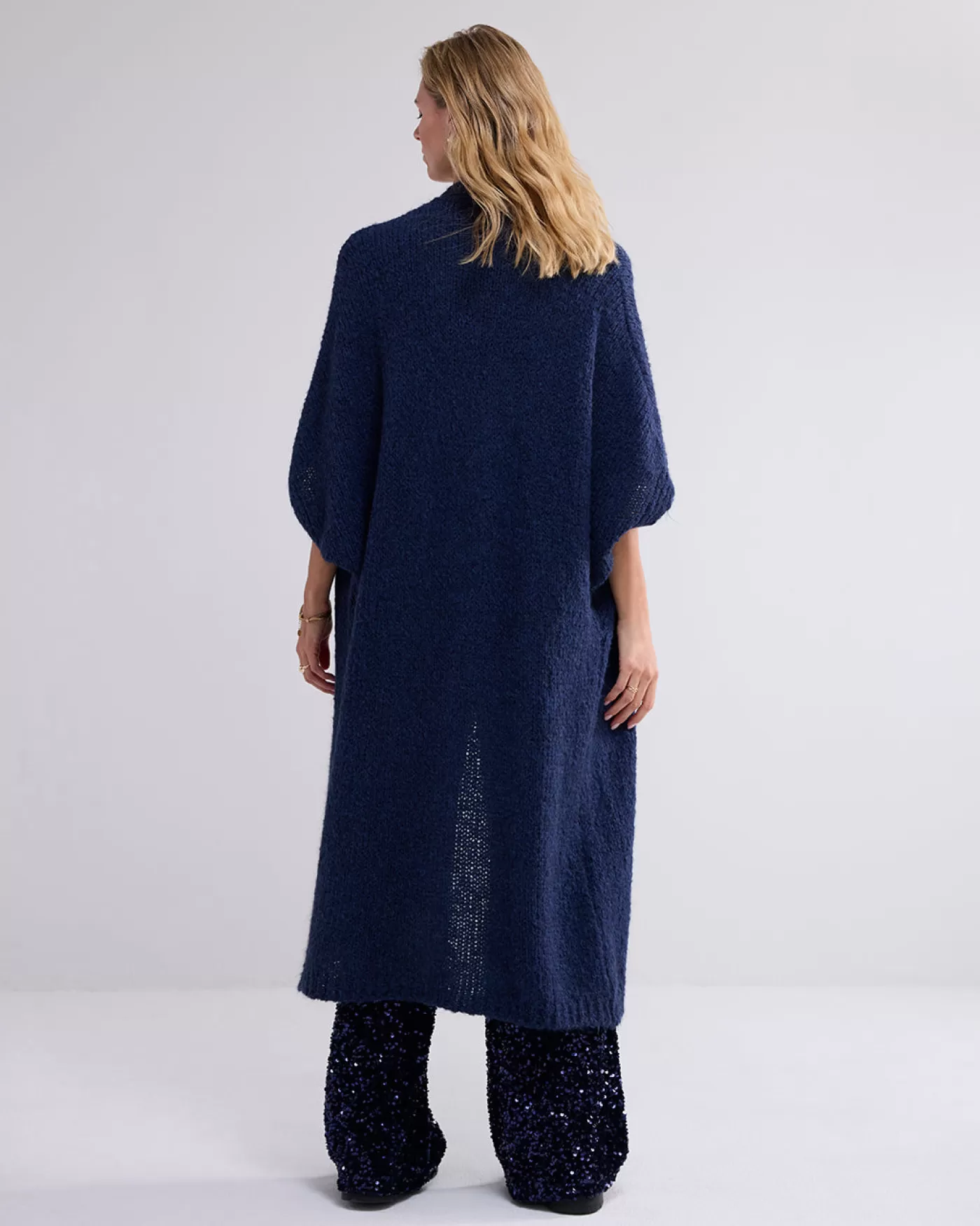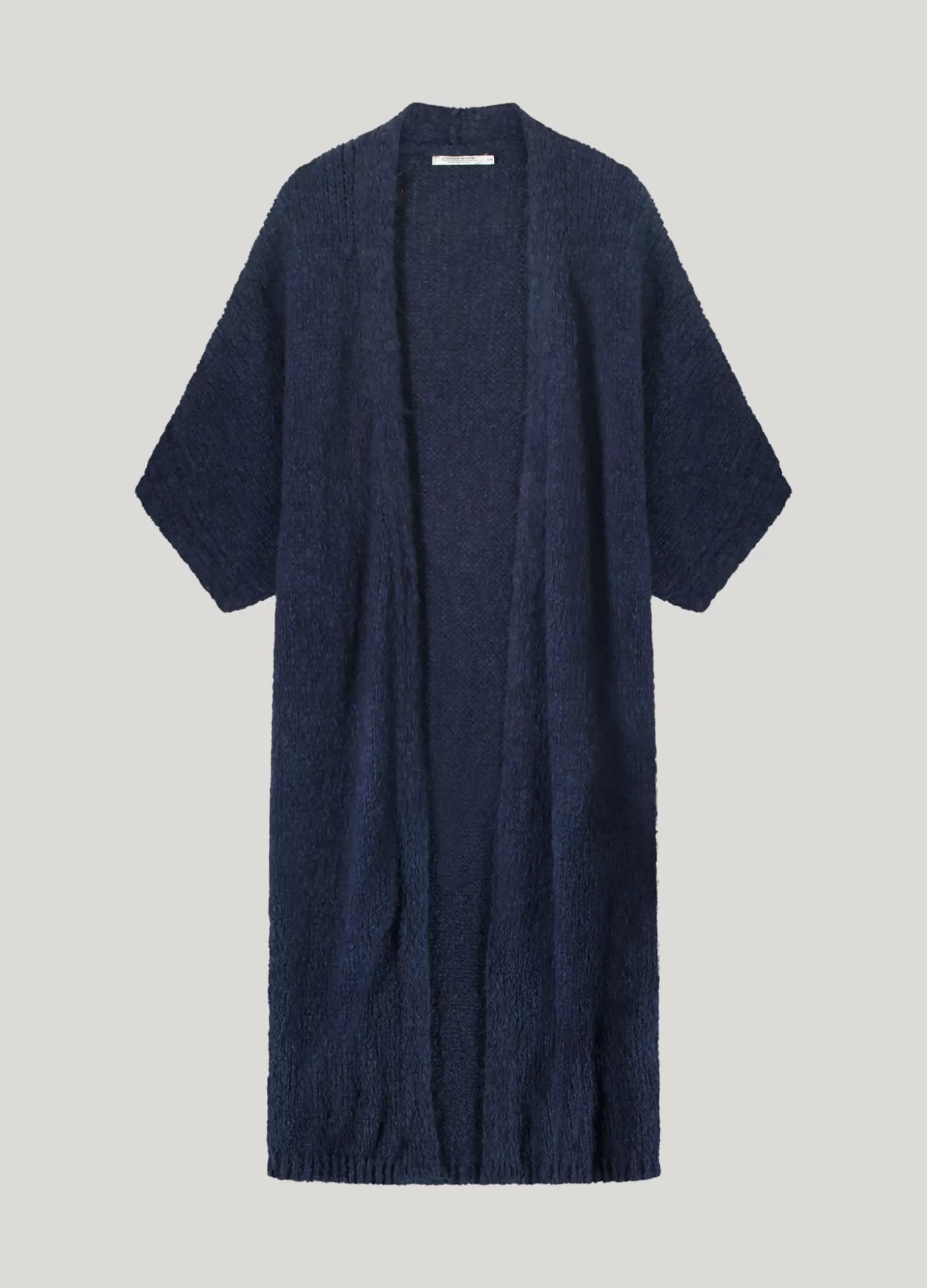 Lang kimonovest in een oversized pasvorm en gemaakt van een mohair blend. Het vest is uitgevoerd in een grove steek en heeft 3/4 mouwen. oversized fit 3/4 mouwen mohair blend grove steek