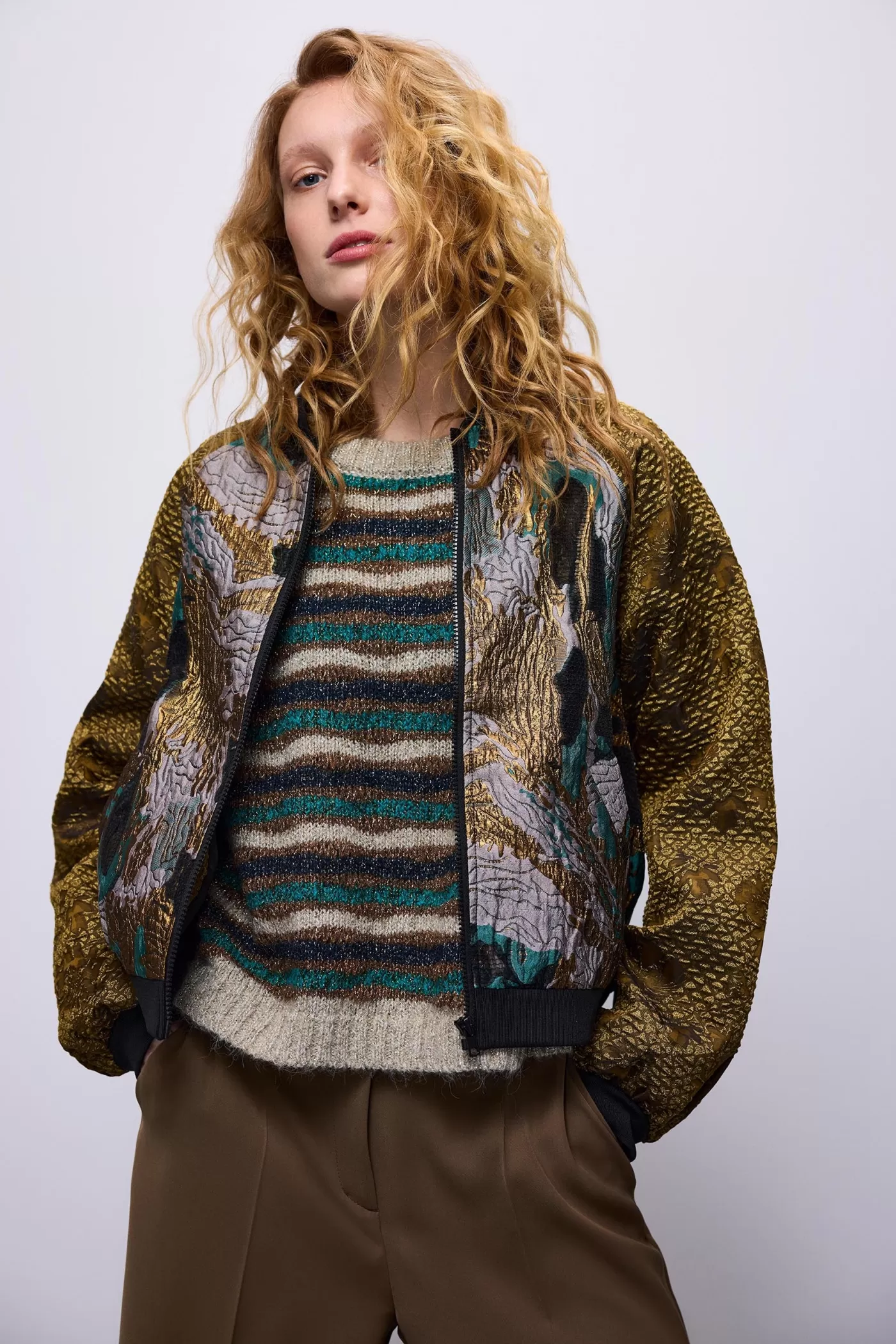 Boxy trui met een ruime ronde hals en ontworpen met meerkleurige, metallic strepen. De trui is gebreid van een lurex en alpaca blend garen. boxy fit ruime ronde hals meerkleurige ingebreide strepen lurex en alpaca blend garen