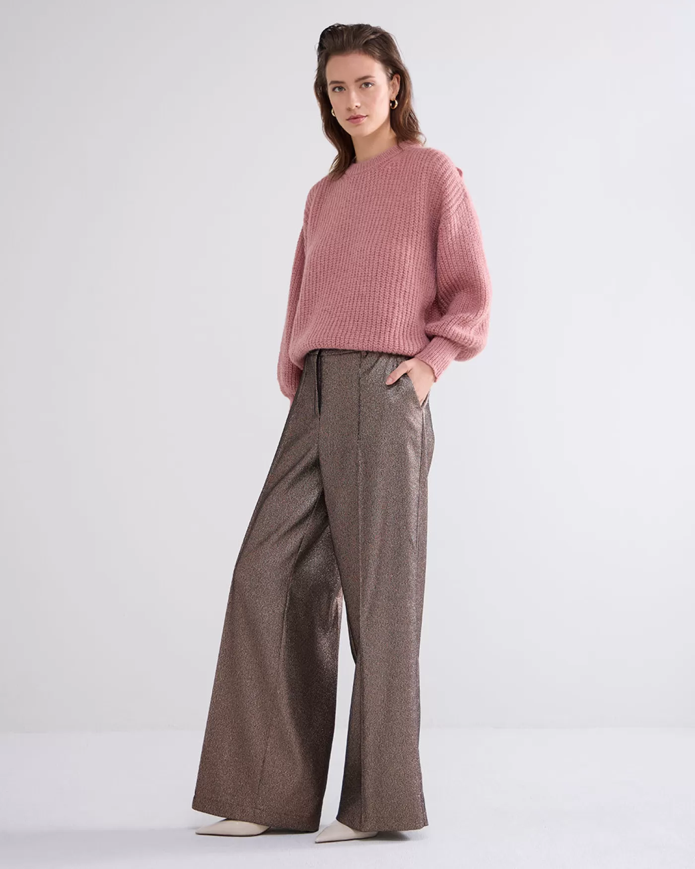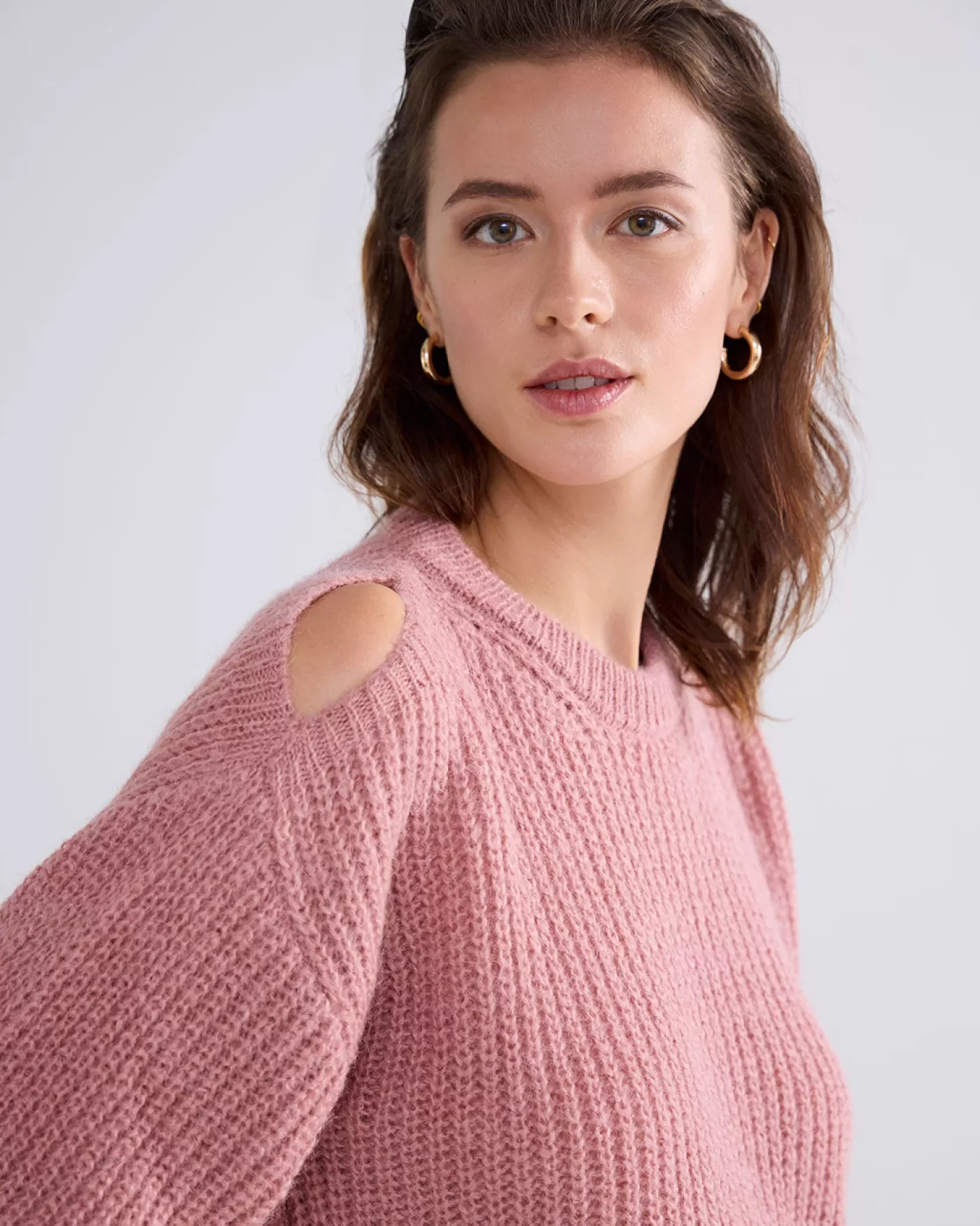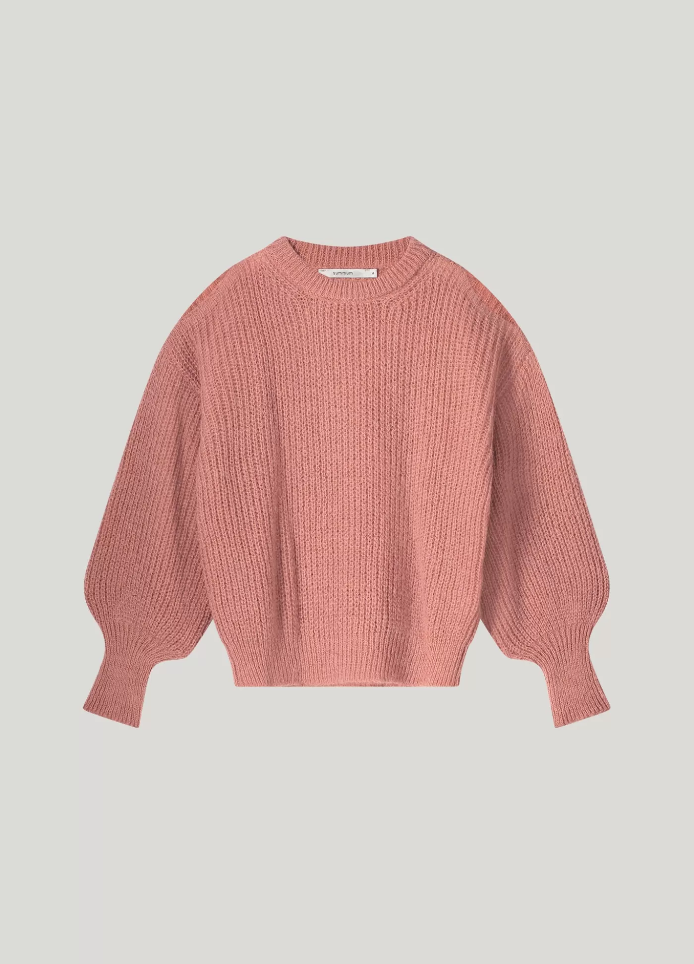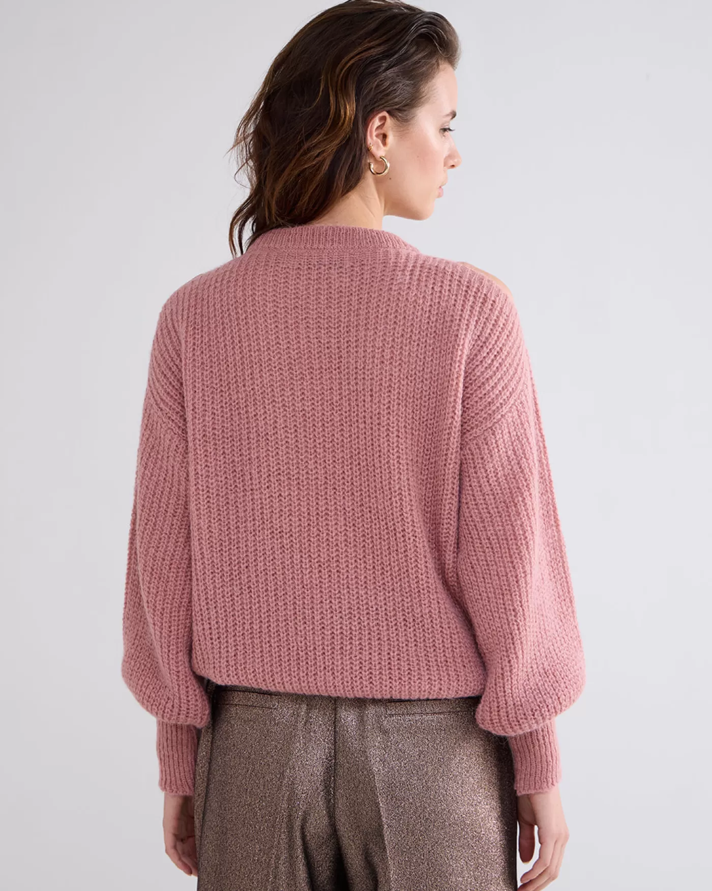 Oversized trui met pofmouwen en openingen bij de schouders. De trui is gebreid in een patent steek. Gebreid in een luchtig alpaca blend garen. openingen bij de schouders ronde halslijn pofmouwen alpaca blend wolmix