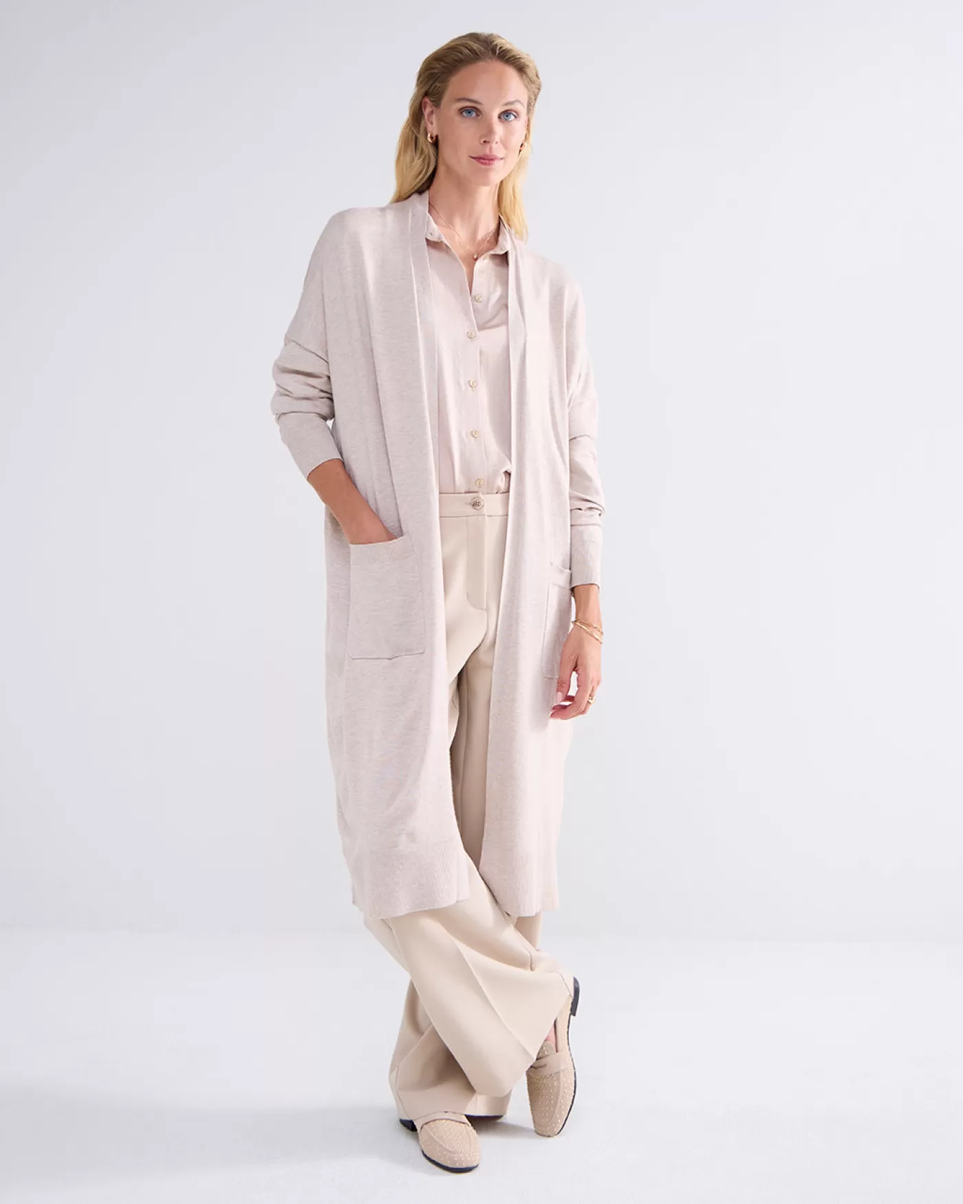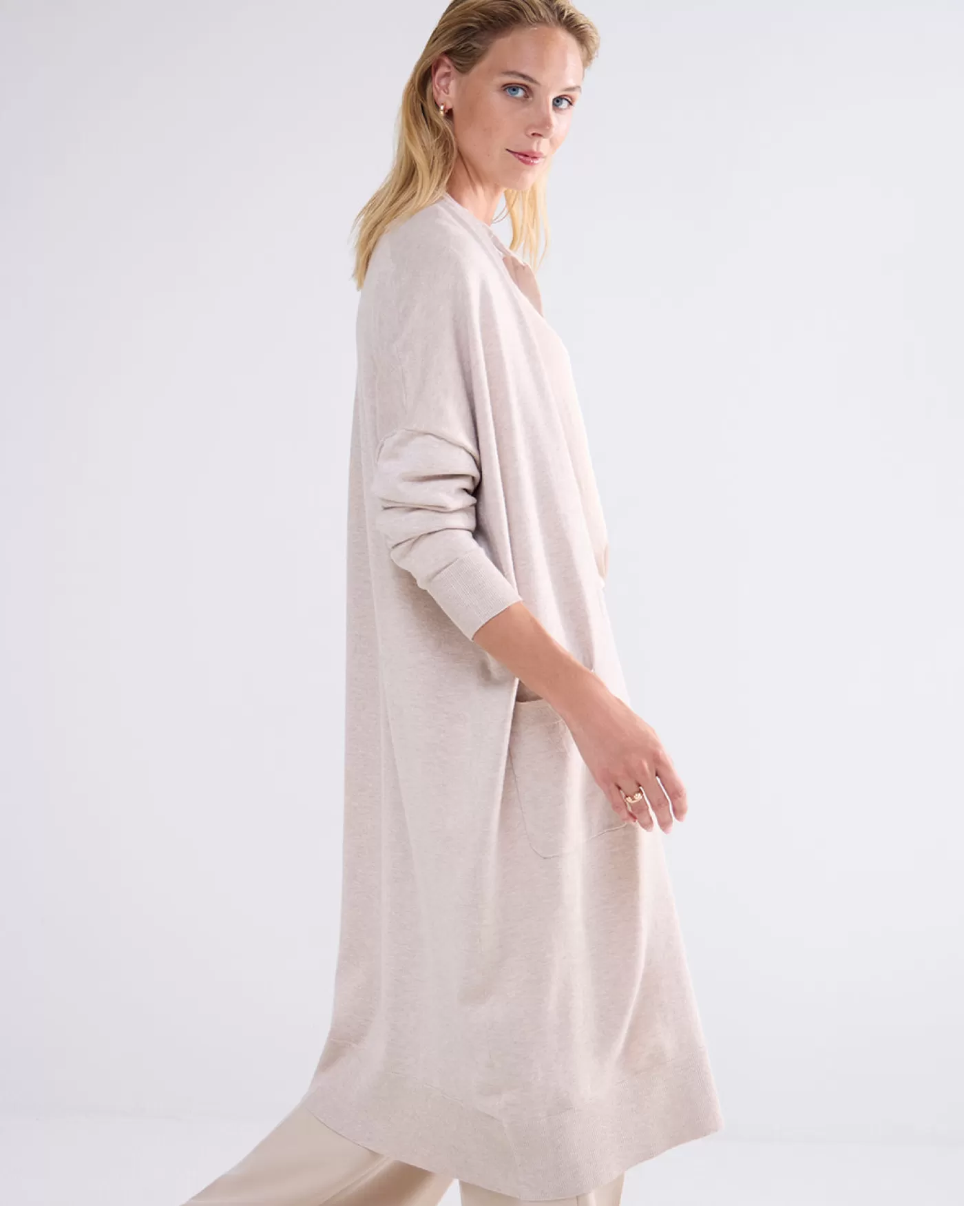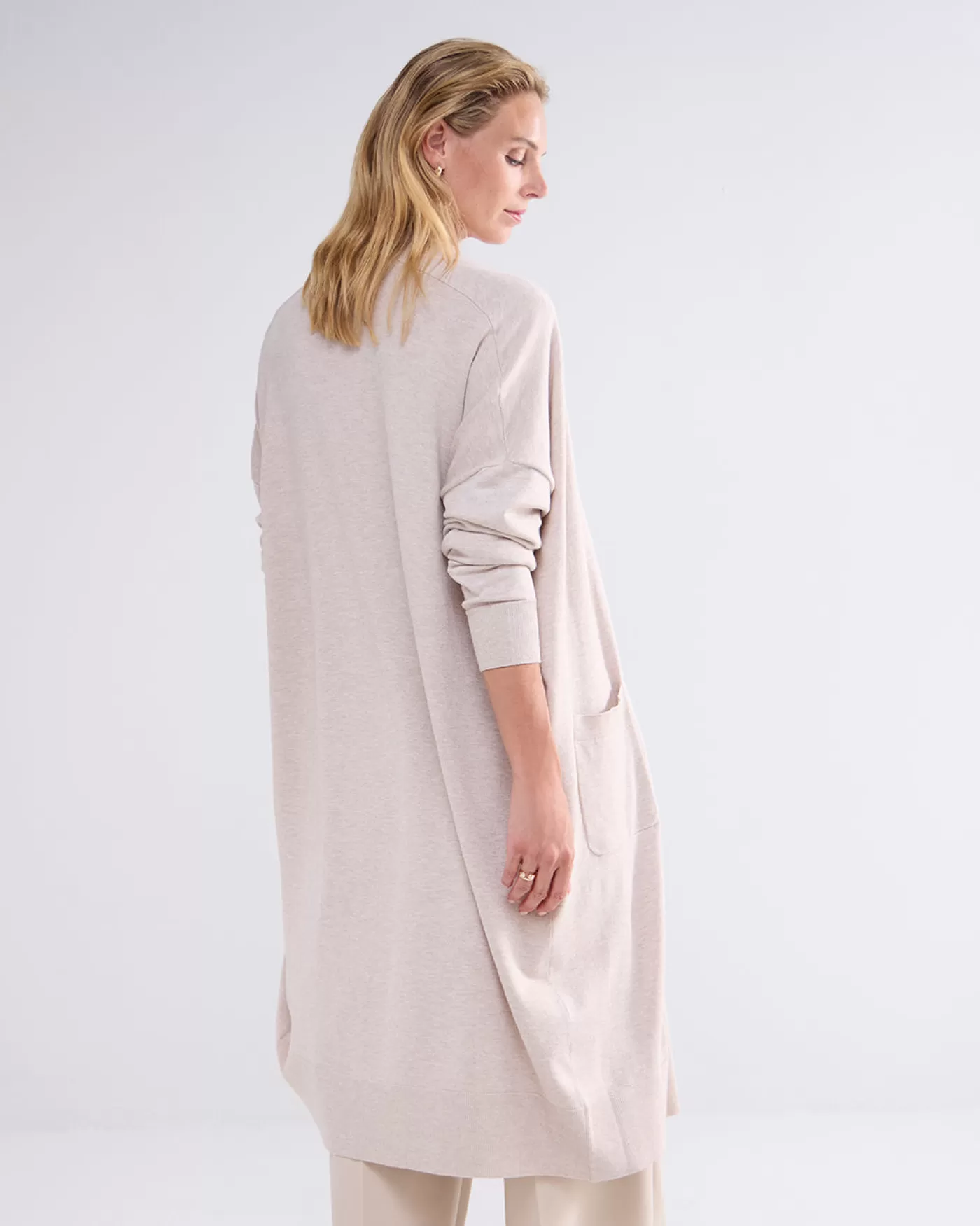 Oversized lang vest met zakken op het voorpand. Het vest is gebreid in een compact viscose polyamide garen en is afgewerkt met geribde boorden. oversized pasvorm zakken voor lang model viscose polyamide garen