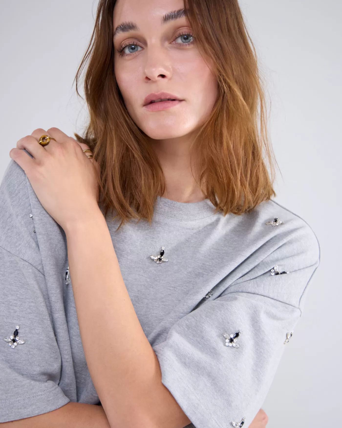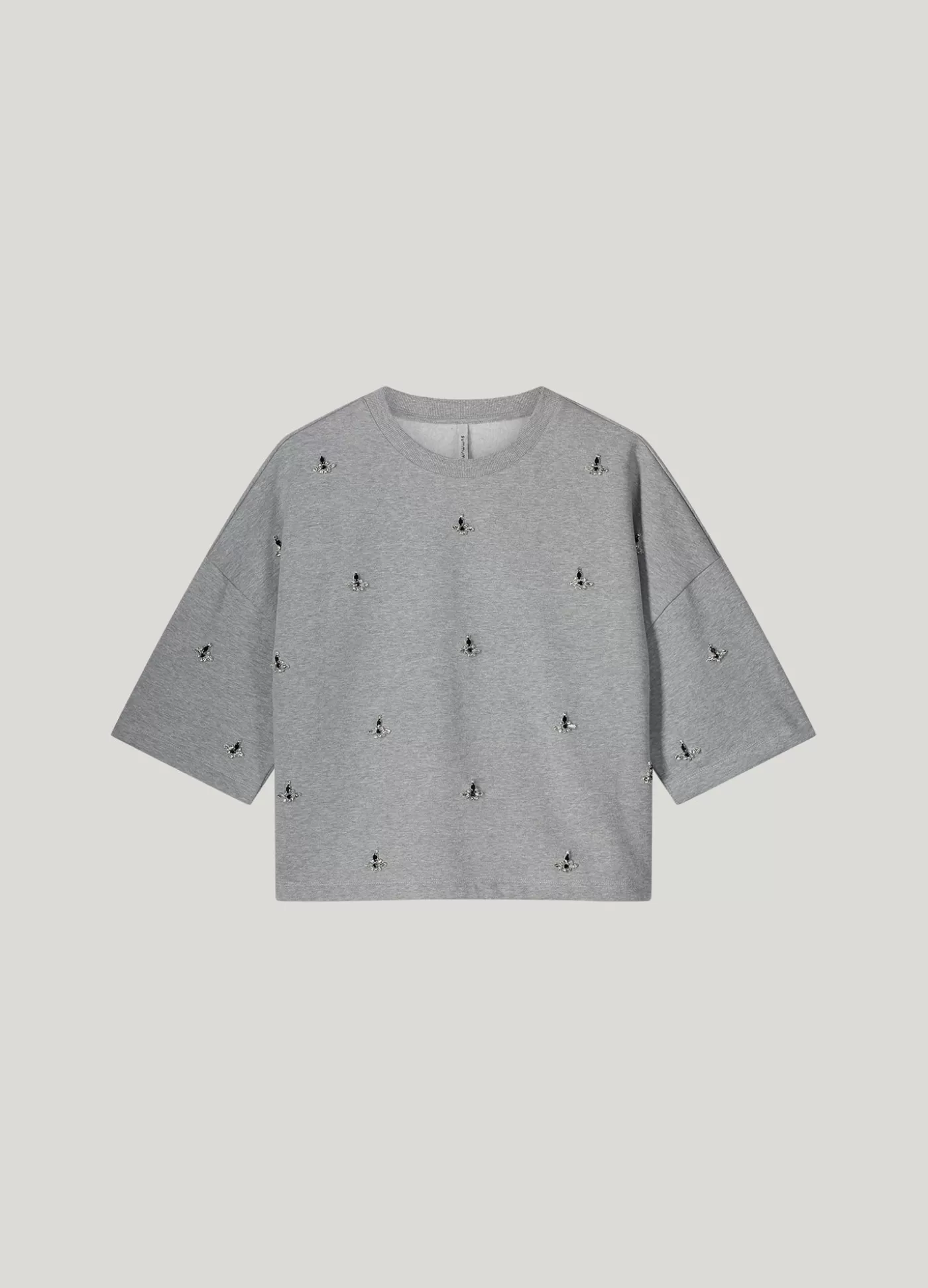 Sweater top met ronde hals en korte mouwen, versierd met strass-decoraties. Gemaakt van comfortabele katoenen jersey kwaliteit. ronde hals korte mouwen geborduurd strass katoenen jersey “
