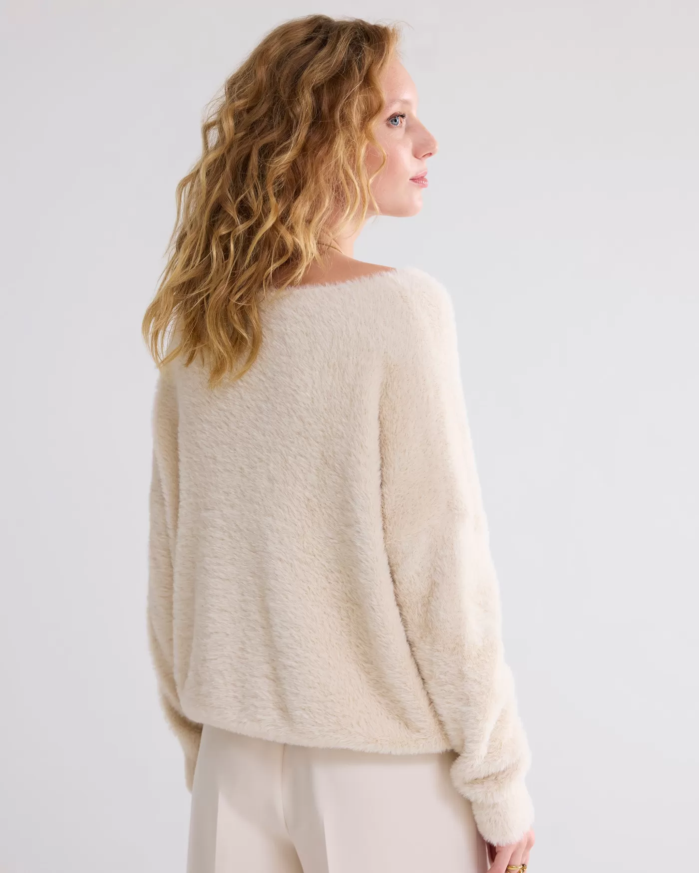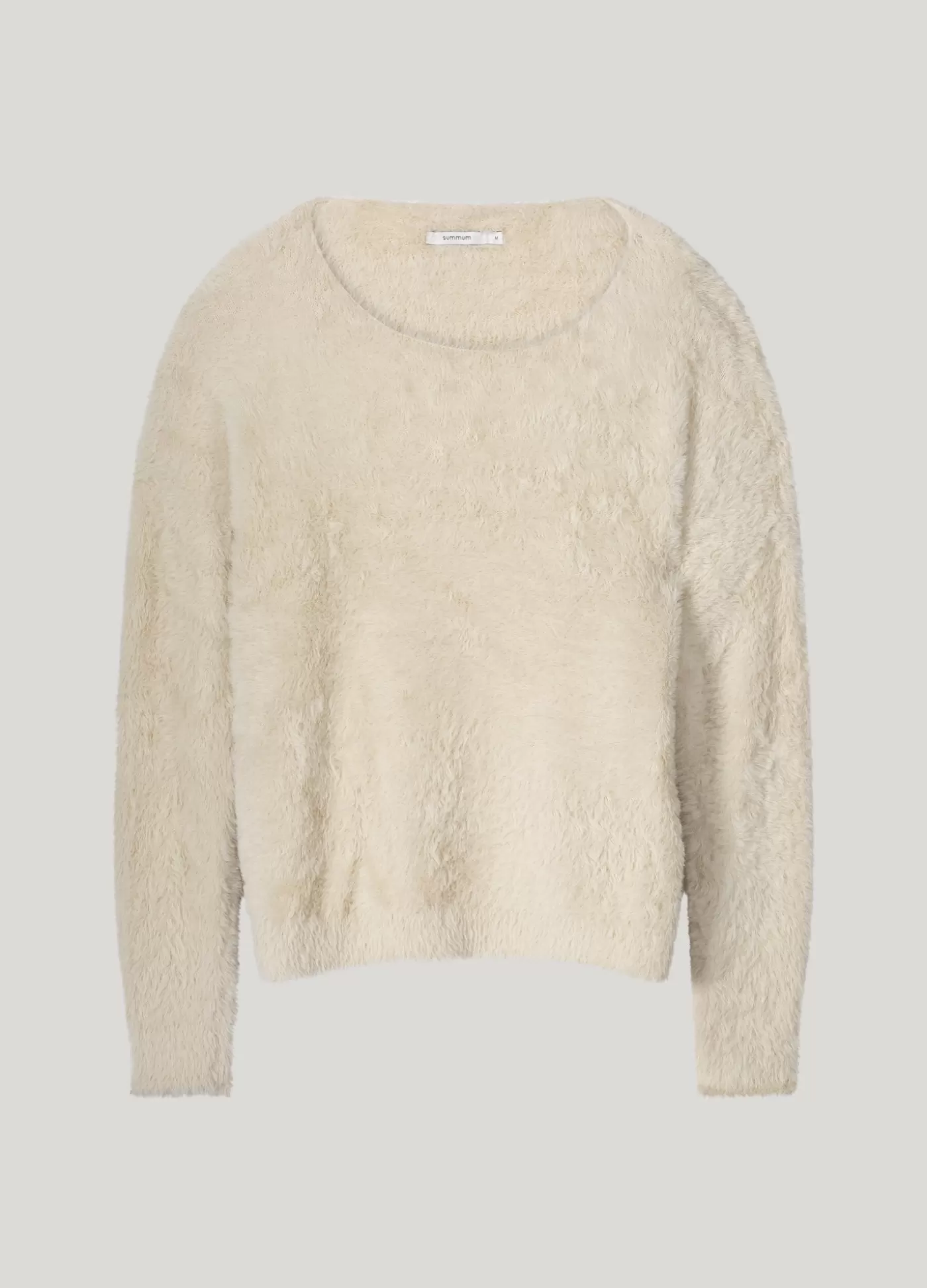 Boxy oversized sweater met een ruime boothals en gebreid in een bont look garen. De trui heeft een ruime fit en onzichtbare naden . brede ronde hals boxy gebreid in nepbont garen ruime fit