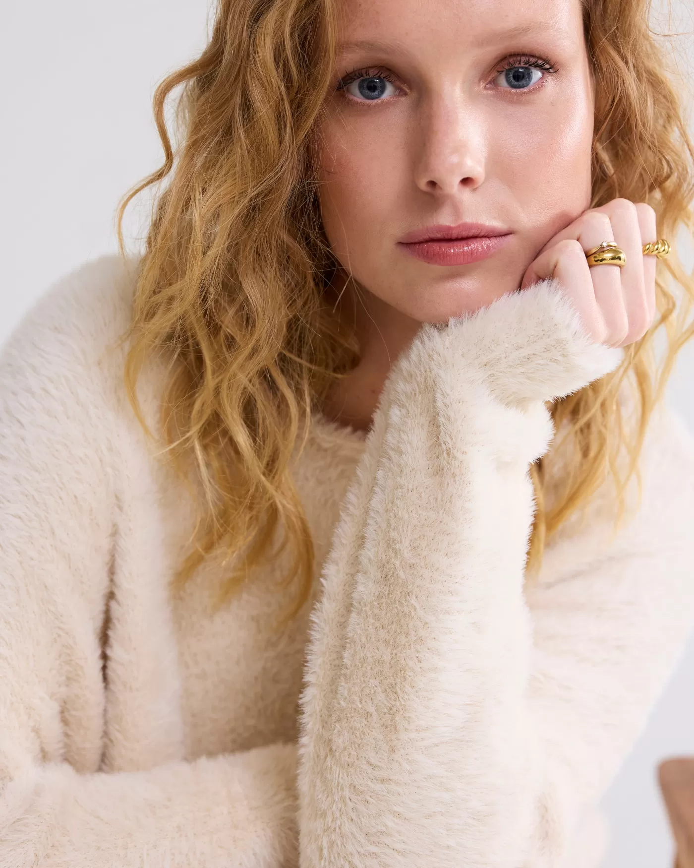 Boxy oversized sweater met een ruime boothals en gebreid in een bont look garen.De trui heeft een ruime fit en onzichtba…