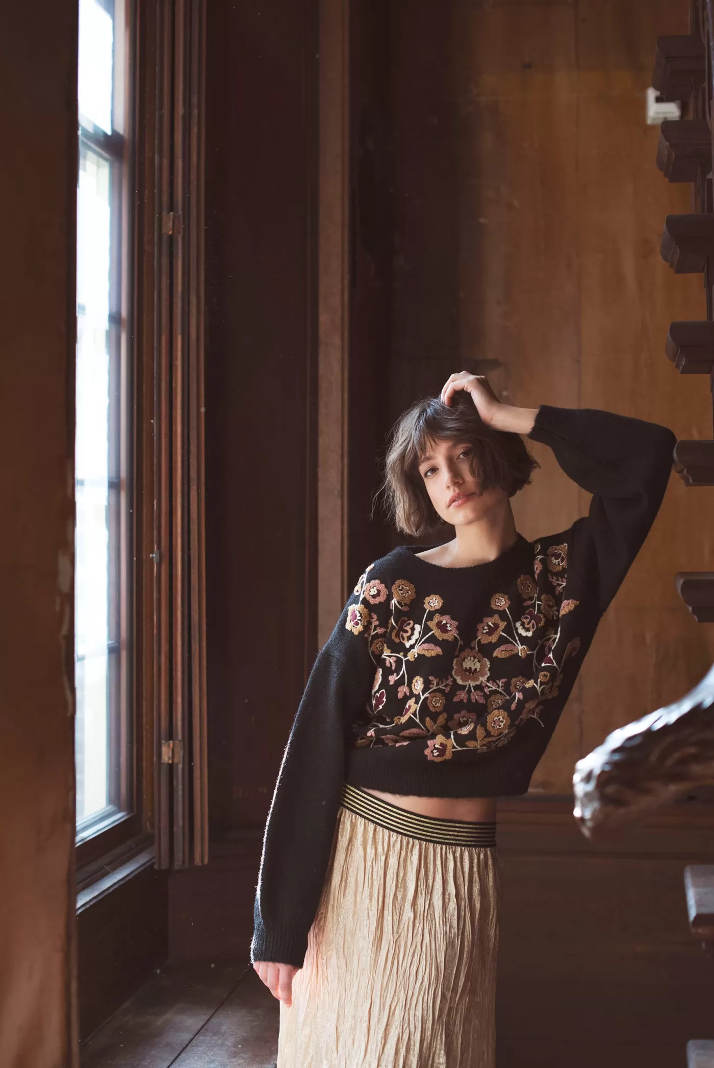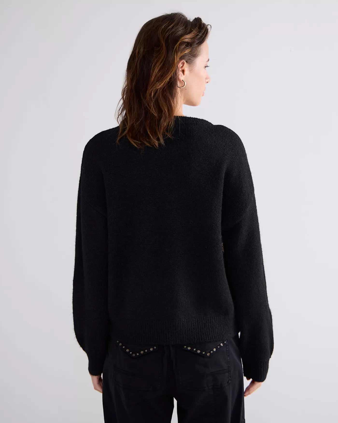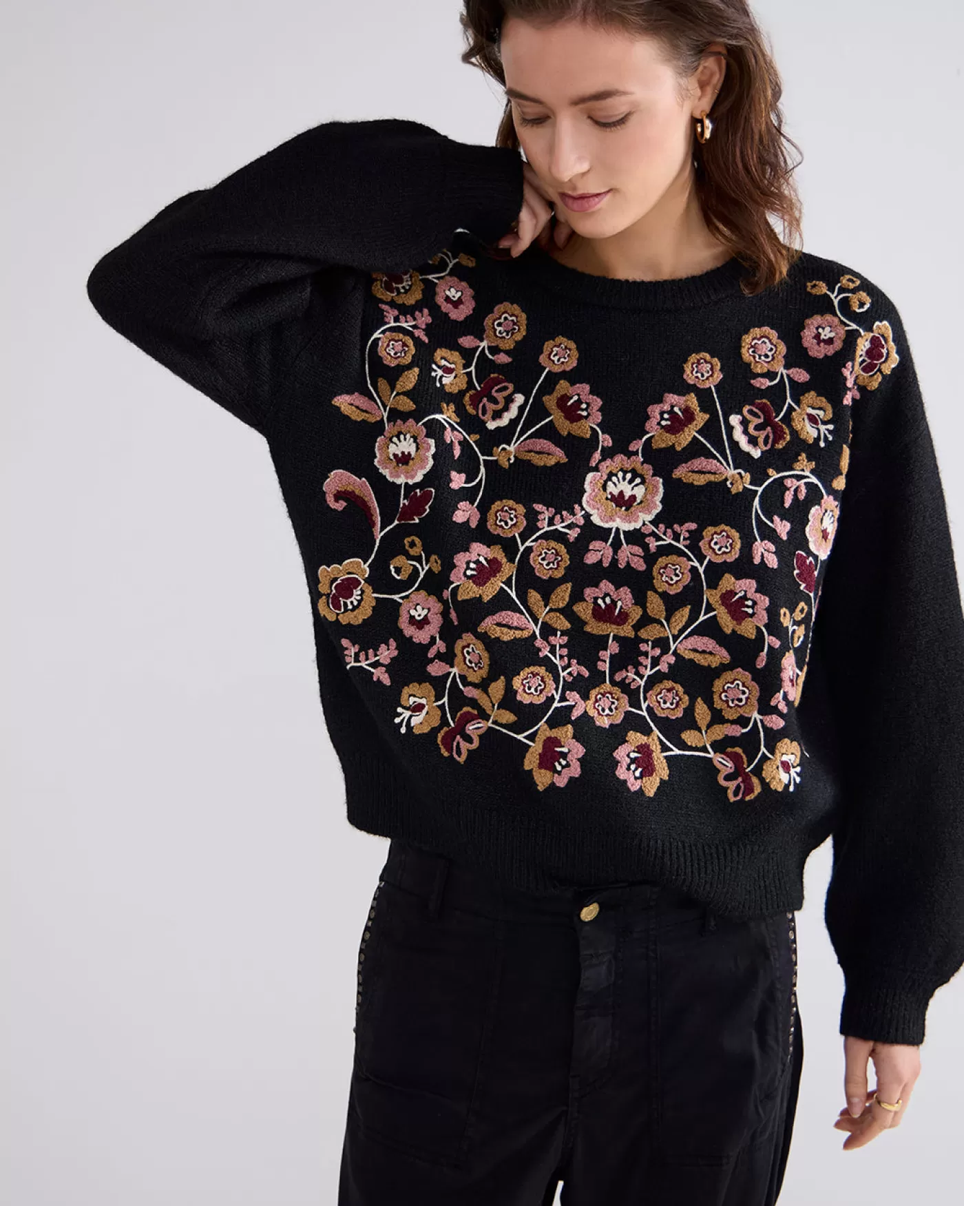Boxy sweater met brede pofmouwen en voorzien van een kleurrijk bloemenborduursel op het voorpand. De trui is gebreid in …