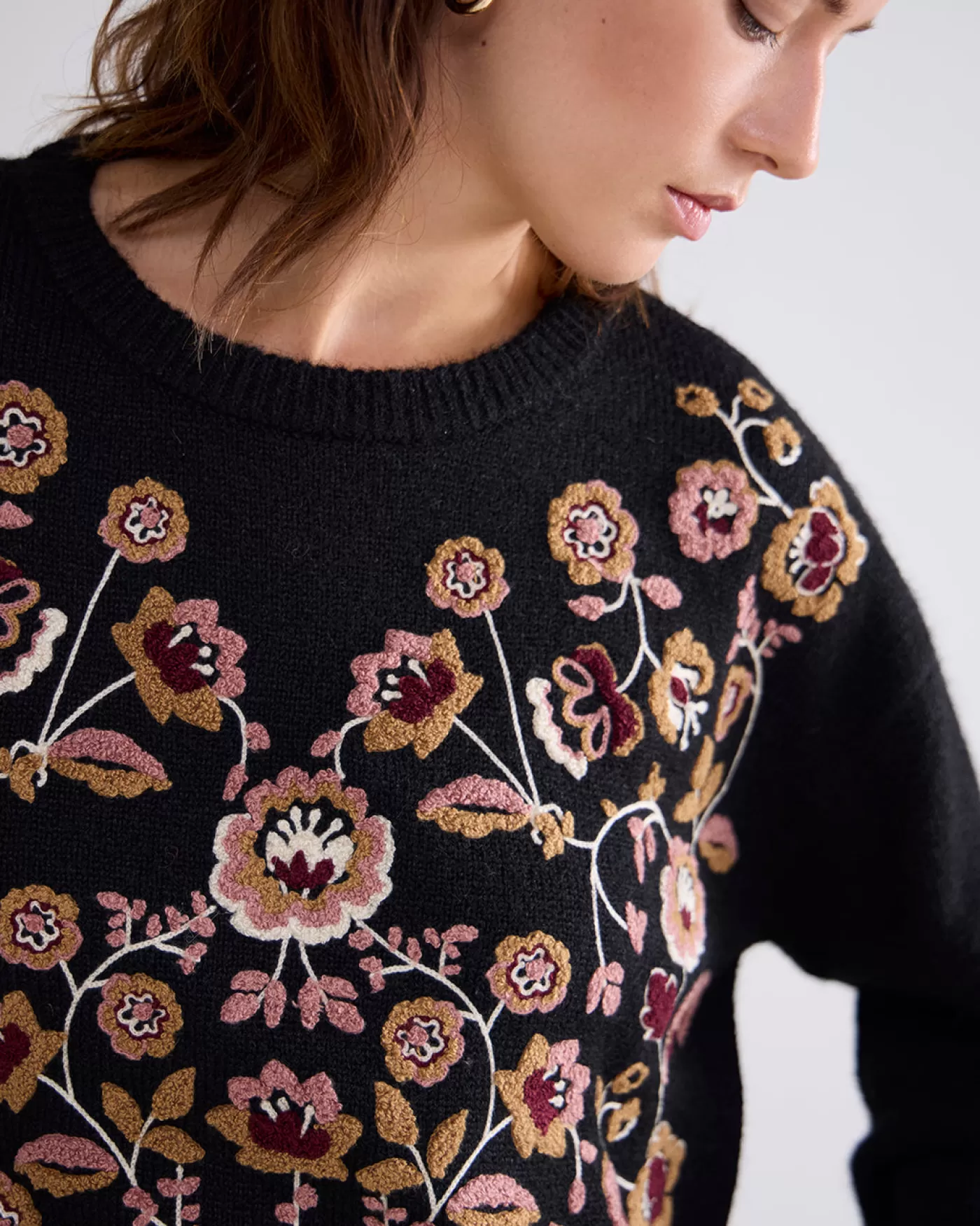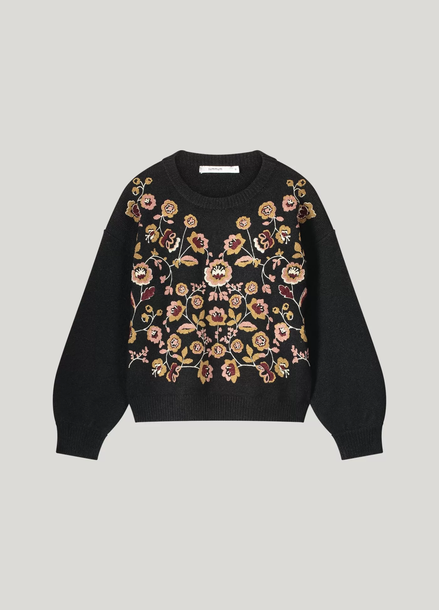 Boxy sweater met brede pofmouwen en voorzien van een kleurrijk bloemenborduursel op het voorpand. De trui is gebreid in een zeer zachte garen. brede pofmouwen kleurrijk bloemenborduursel zacht gebreid boxy pasvorm
