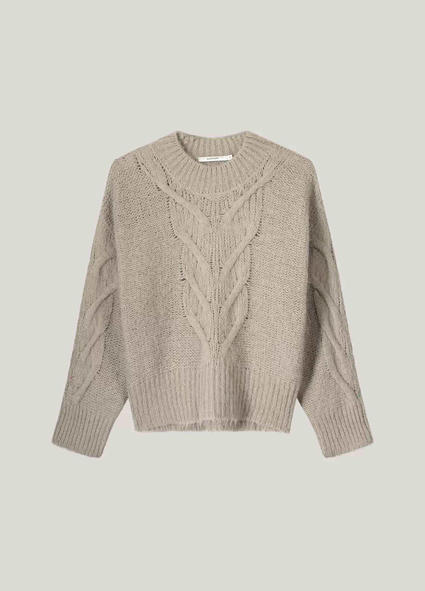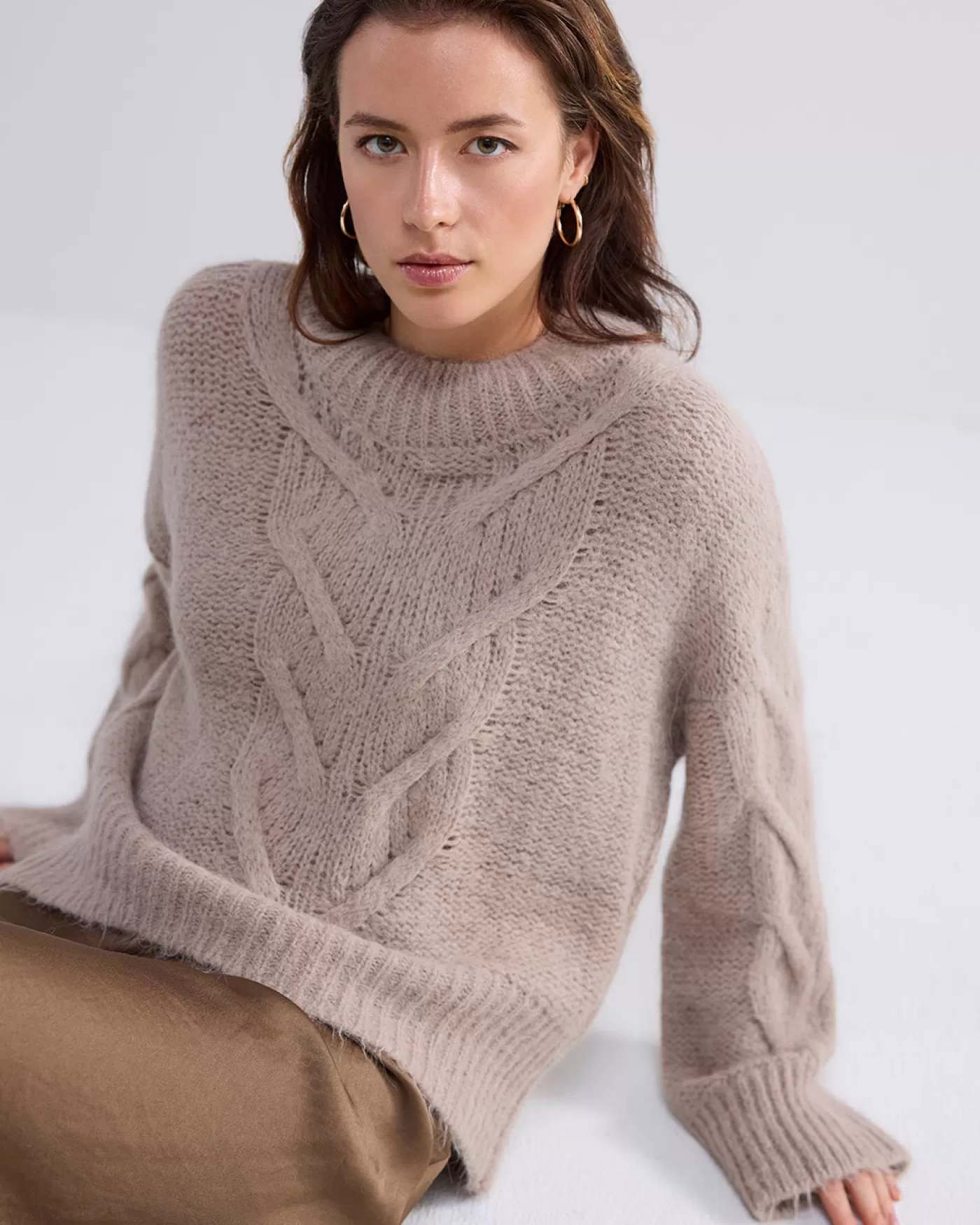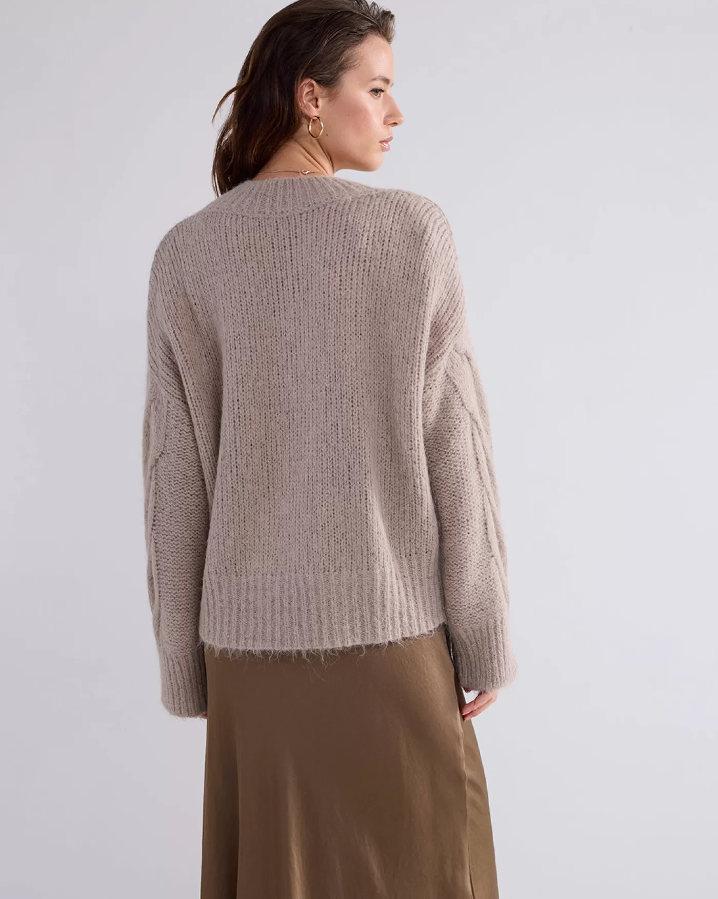 Stoere maar vrouwelijke trui met grote ingebreide kabels op het voorpand en de mouwen. Gemaakt van een prachtige blend van 50% alpaca en 50% polyamide. normale fit ingebreide kabels alpaca-polyamide blend brede geribde boorden