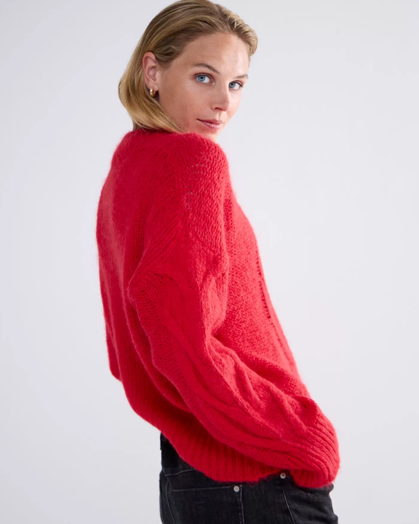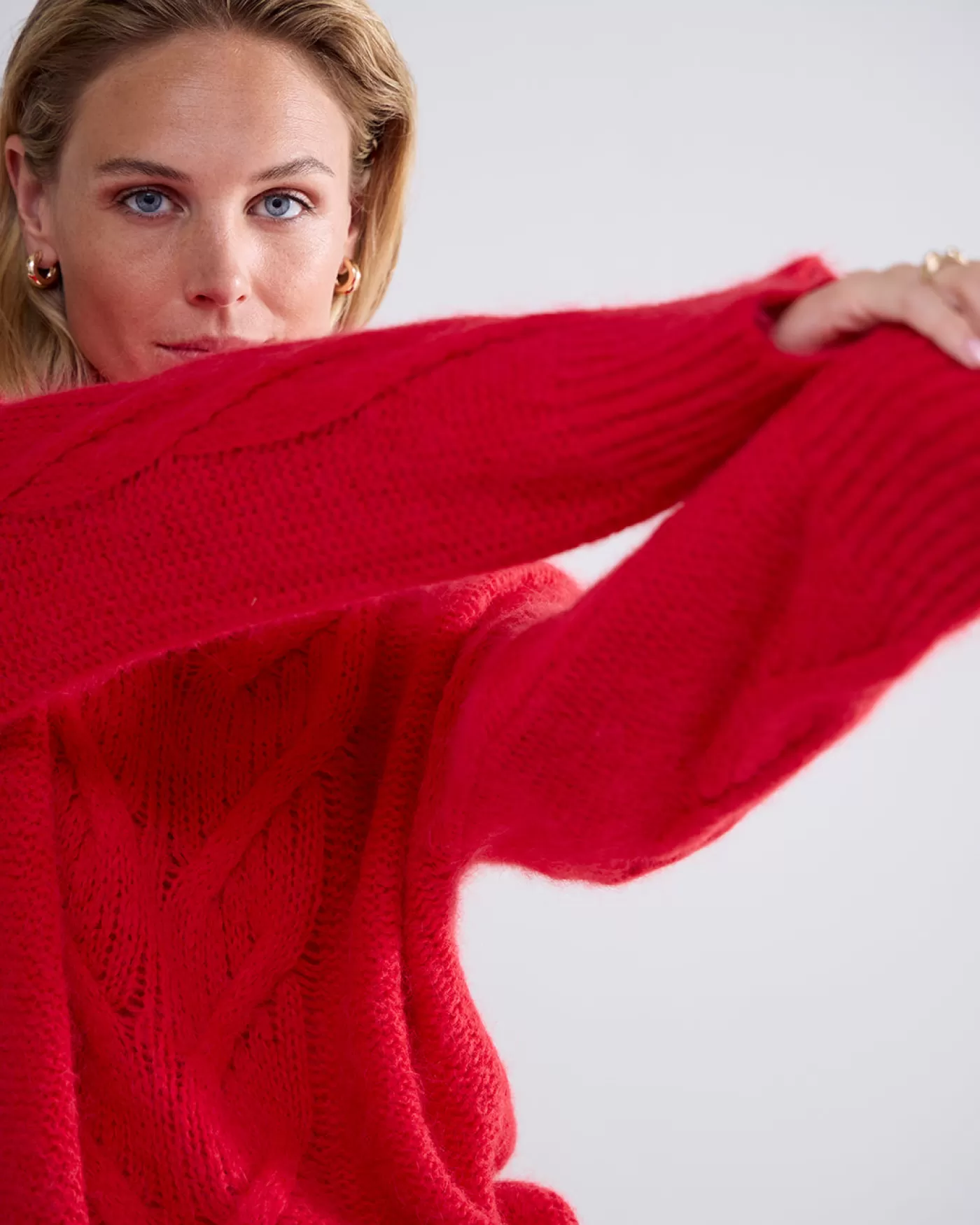 Stoere trui met grote ingebreide kabels op het voorpand en de mouwen. Gemaakt van een prachtige blend van 50% alpaca en …