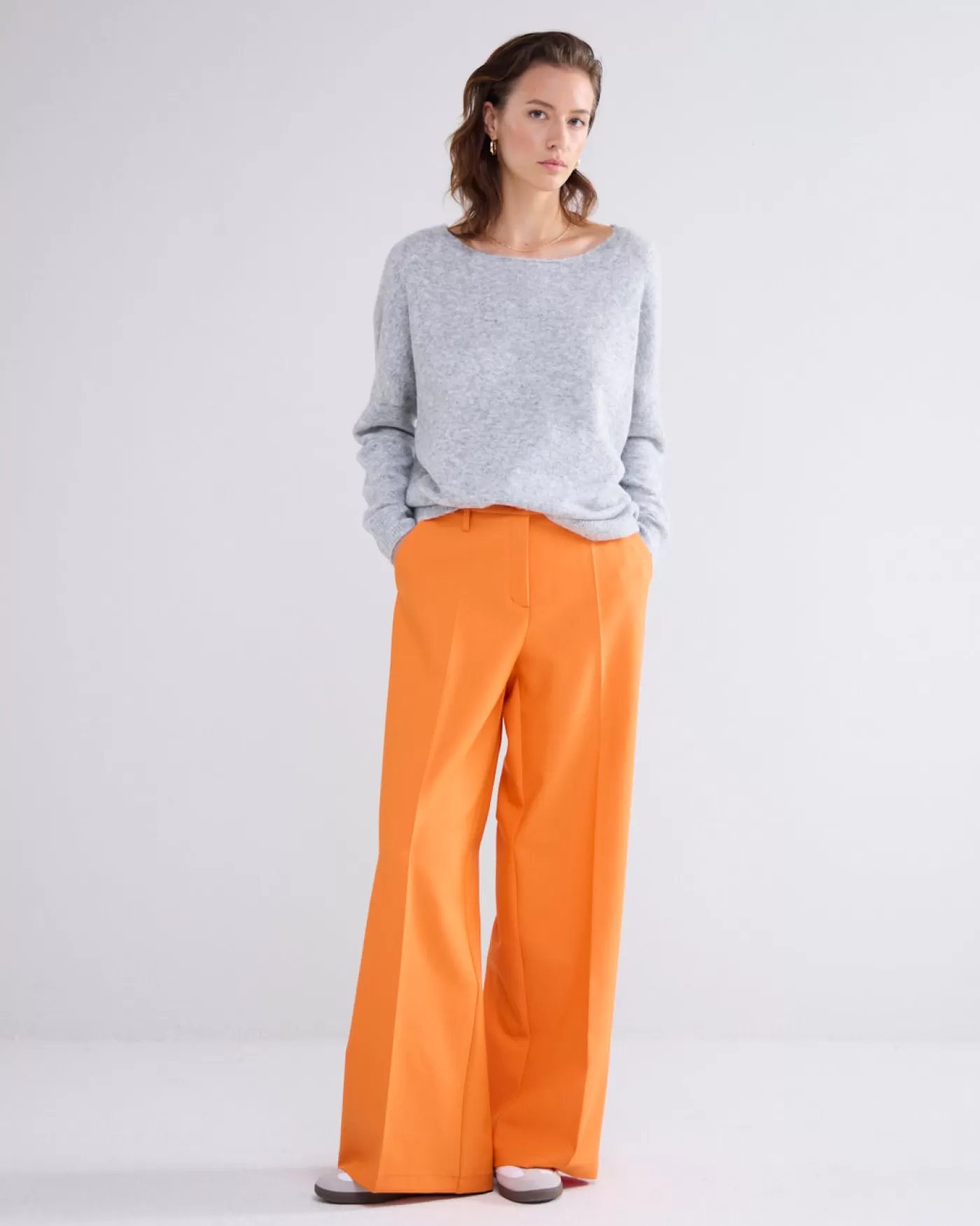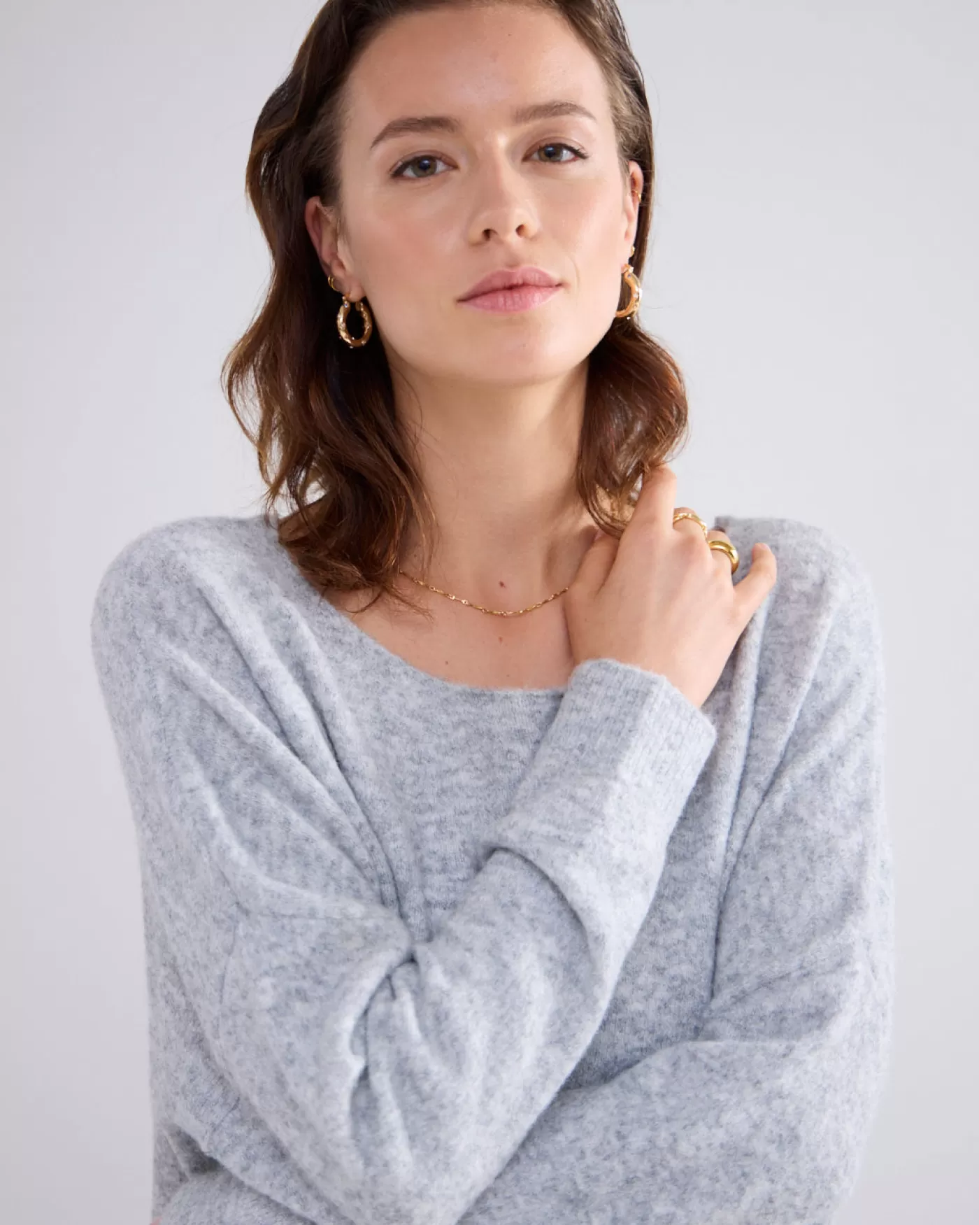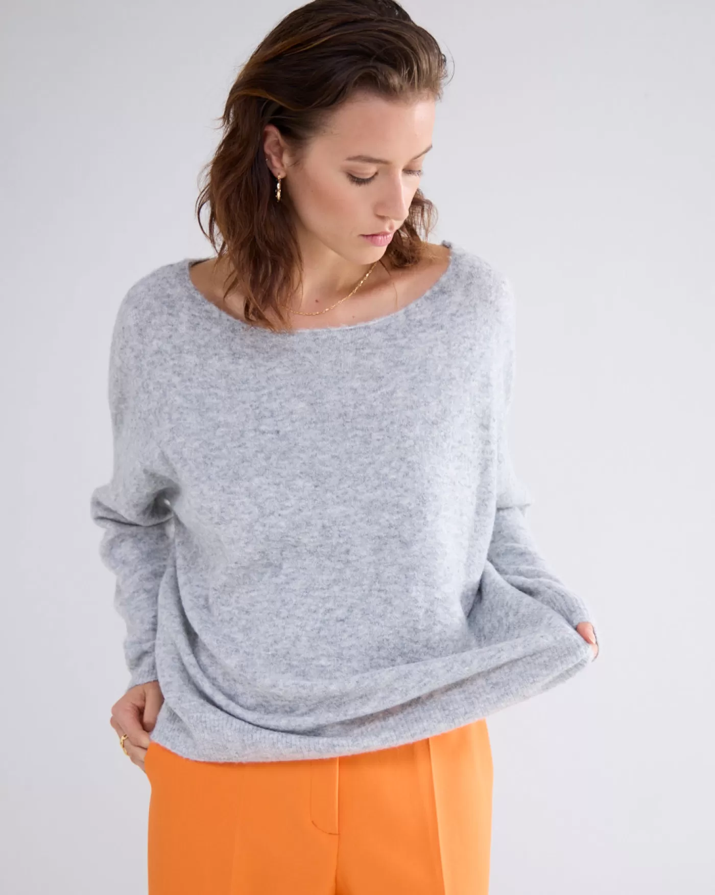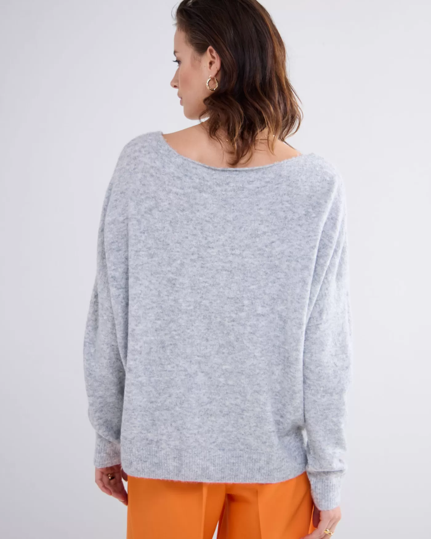 Trui met wijde boothals en ruime fit op de body, gebreid in een gemêleerd garen. De mouwen hebben een normale pasvorm.W…