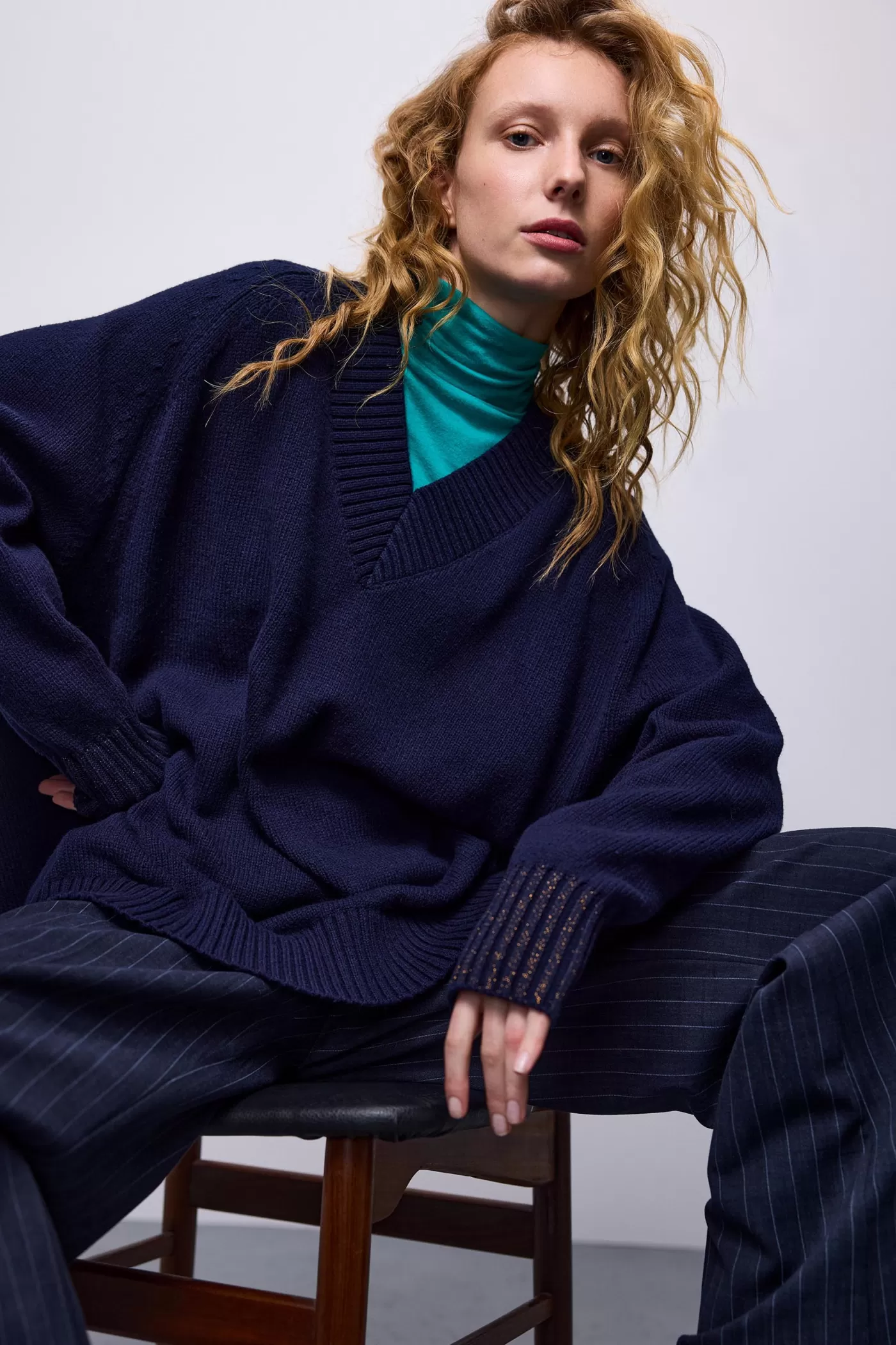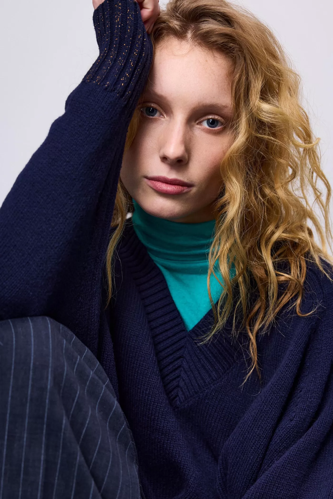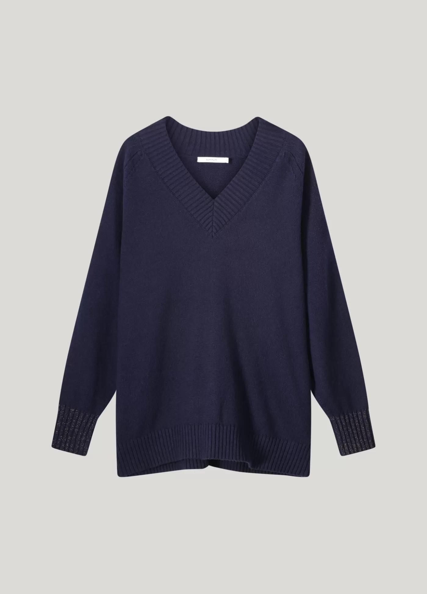 V-hals trui met raglanmouwen en brede boorden. De trui is uitgevoerd in een katoen-wol blend en verrijkt met lurex garen bij de manchetten voor een subtiele glans. V-hals raglanmouwen Brede boorden met lurex garen Katoen en merinowol blend