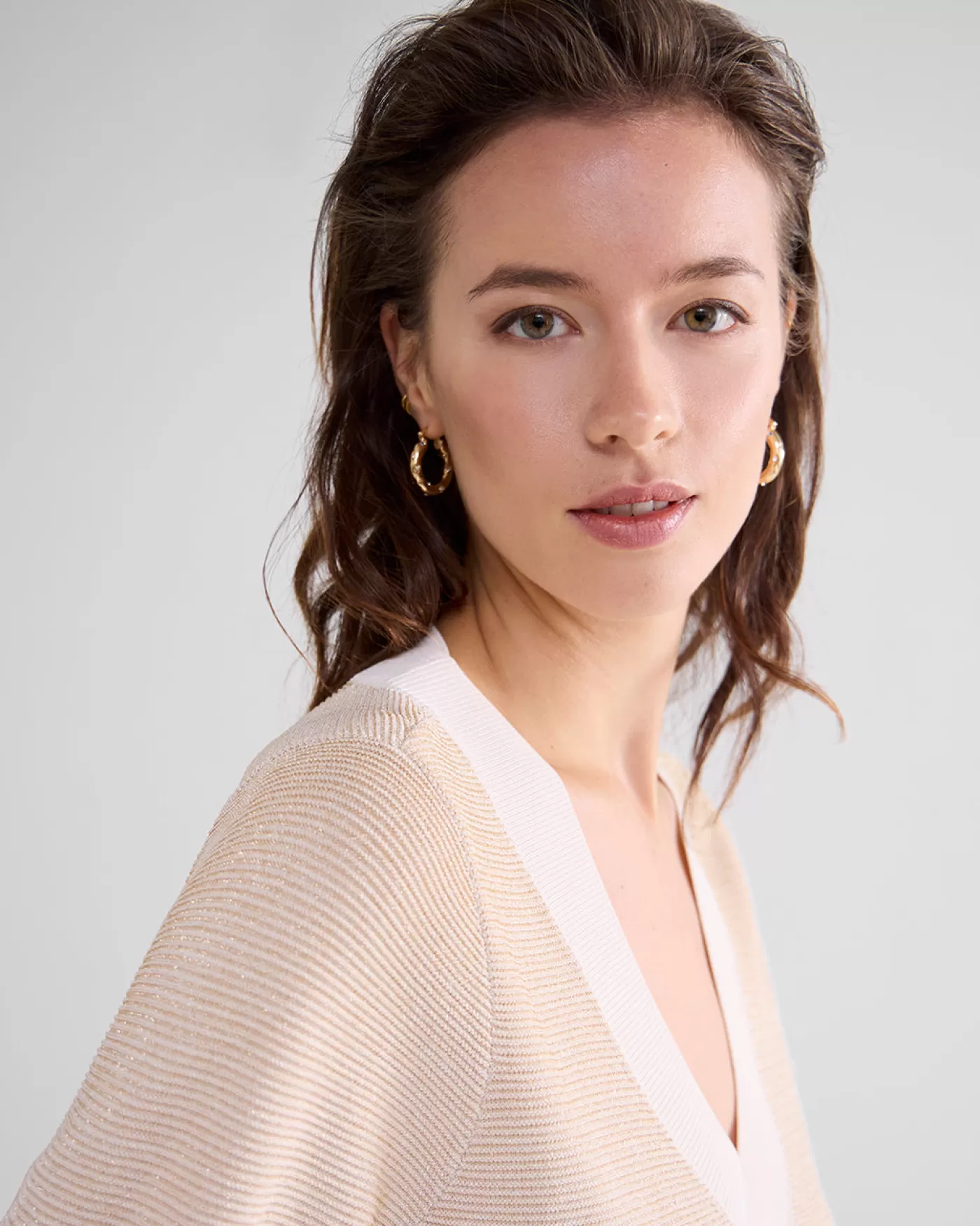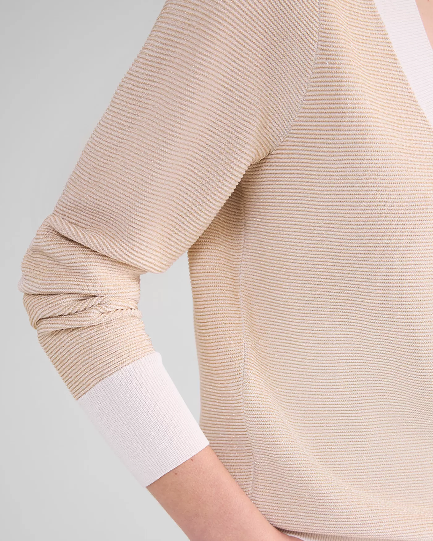 Diepe V-hals sweater, gebreid in een fijne ribbelsteek en verweven met gouden lurex. De trui heeft normale pasvorm. diepe V-hals fijne ribbelsteek gouden lurex ruime pasvorm