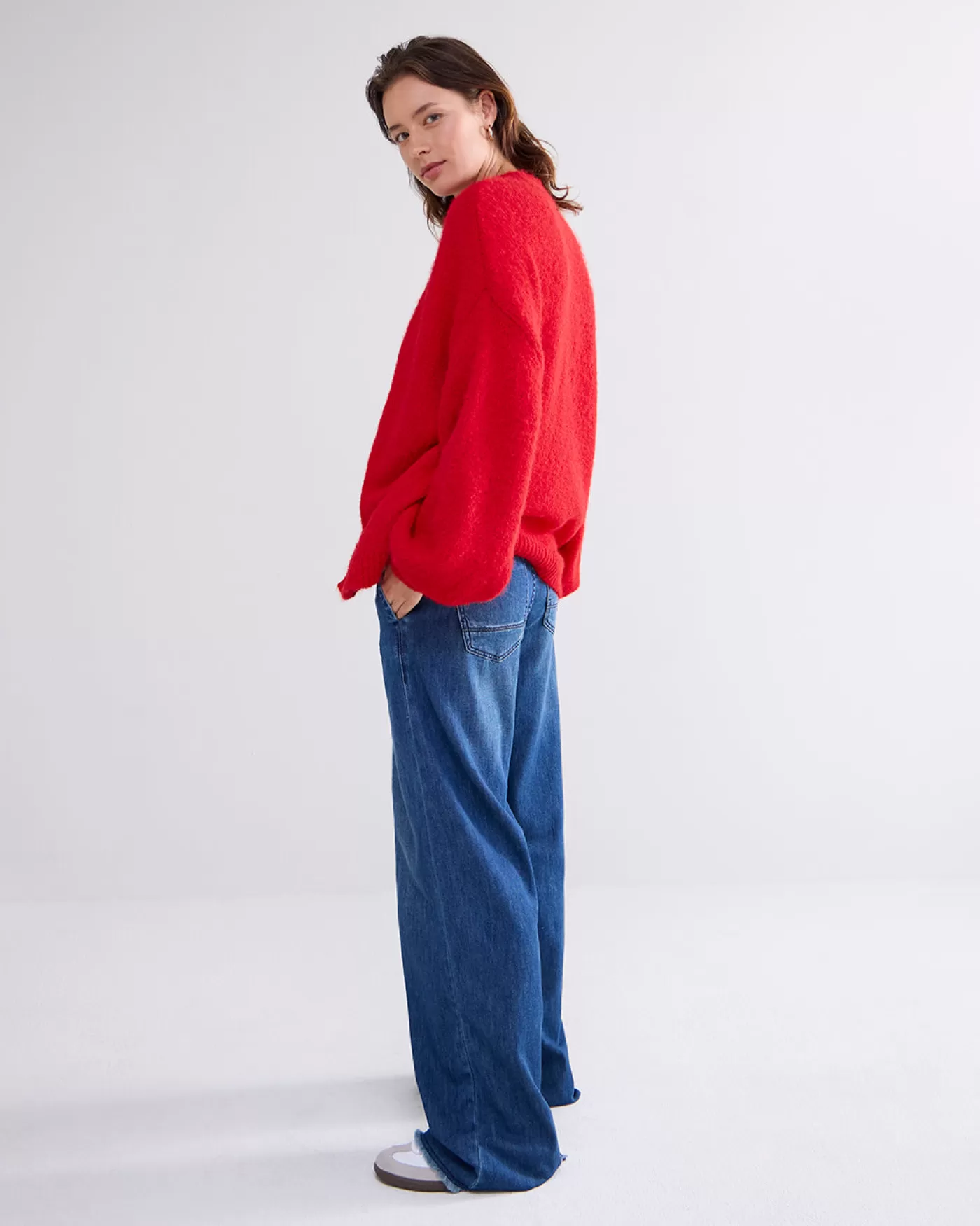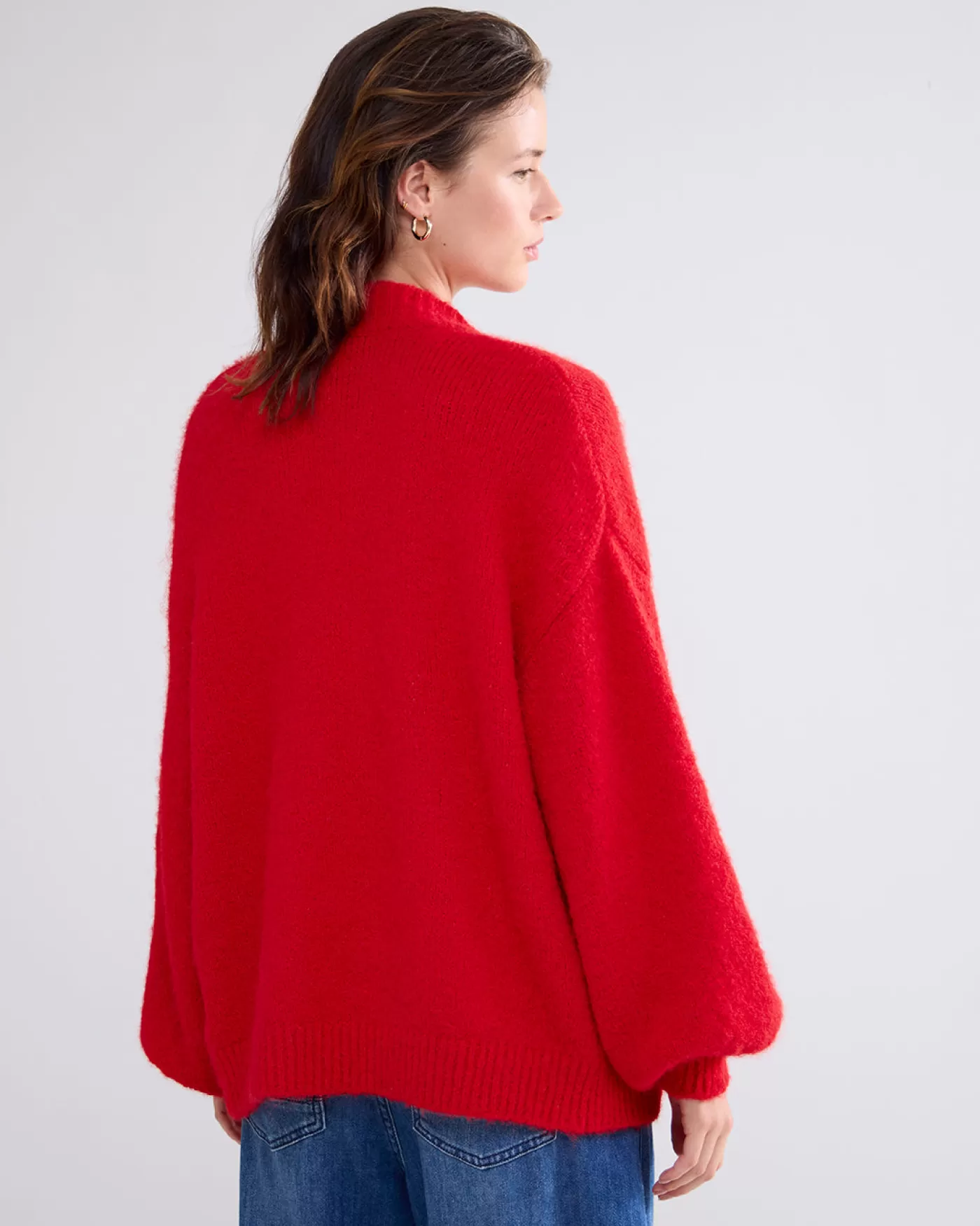 Heerlijk zacht vest zonder sluiting met grote pofmouwen. Het vest heeft brede boorden die ribgebreid zijn uitgevoerd. ge…